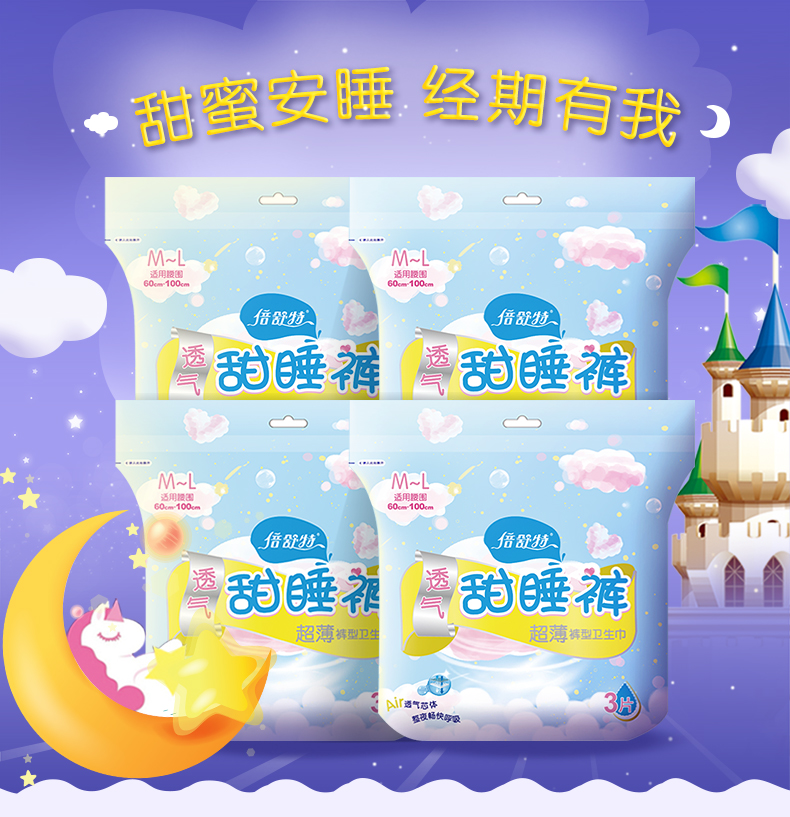 倍舒特裤型卫生巾安心裤量大夜用卫生裤超吸防漏姨妈巾4包12片M-L