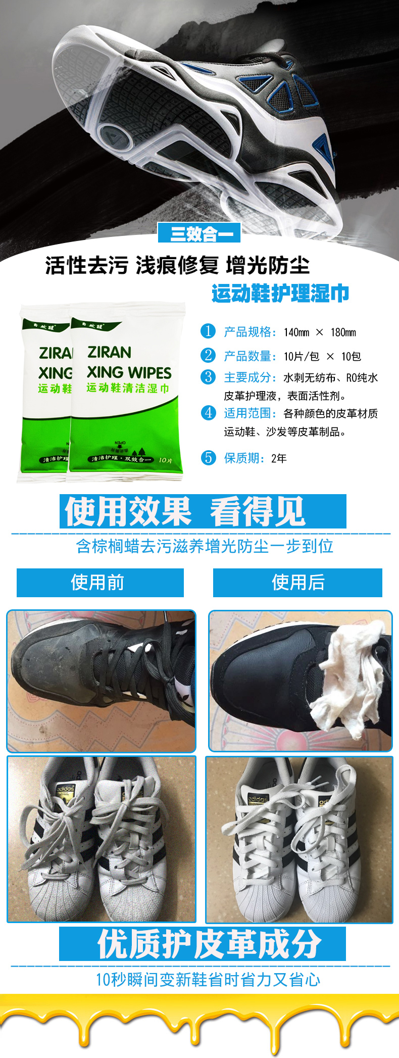 【自然醒母婴旗舰店】10包100片,去污,增白,护理,保养四效合一,使用效果看得见,含棕榈蜡去污增光防尘一步到位。适用于皮革、PVC材质小白鞋日常清洁保养。