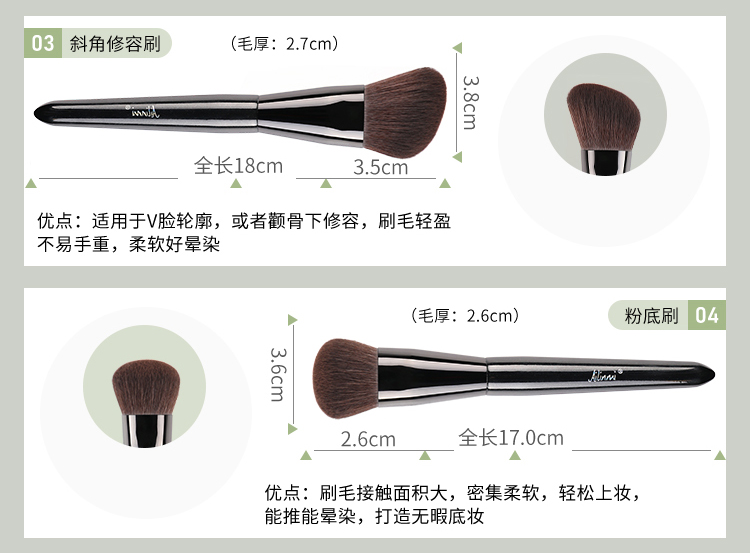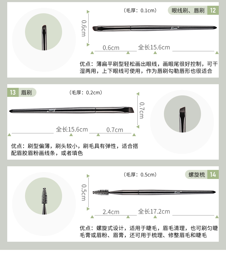 哀家御用,环保材料,与日德工厂合作生产,品控给力!共有14支,灰鼠丝纤维毛,模拟天然动物毛峰,刷毛柔软顺滑好打理,让菇娘妆容美美哒~