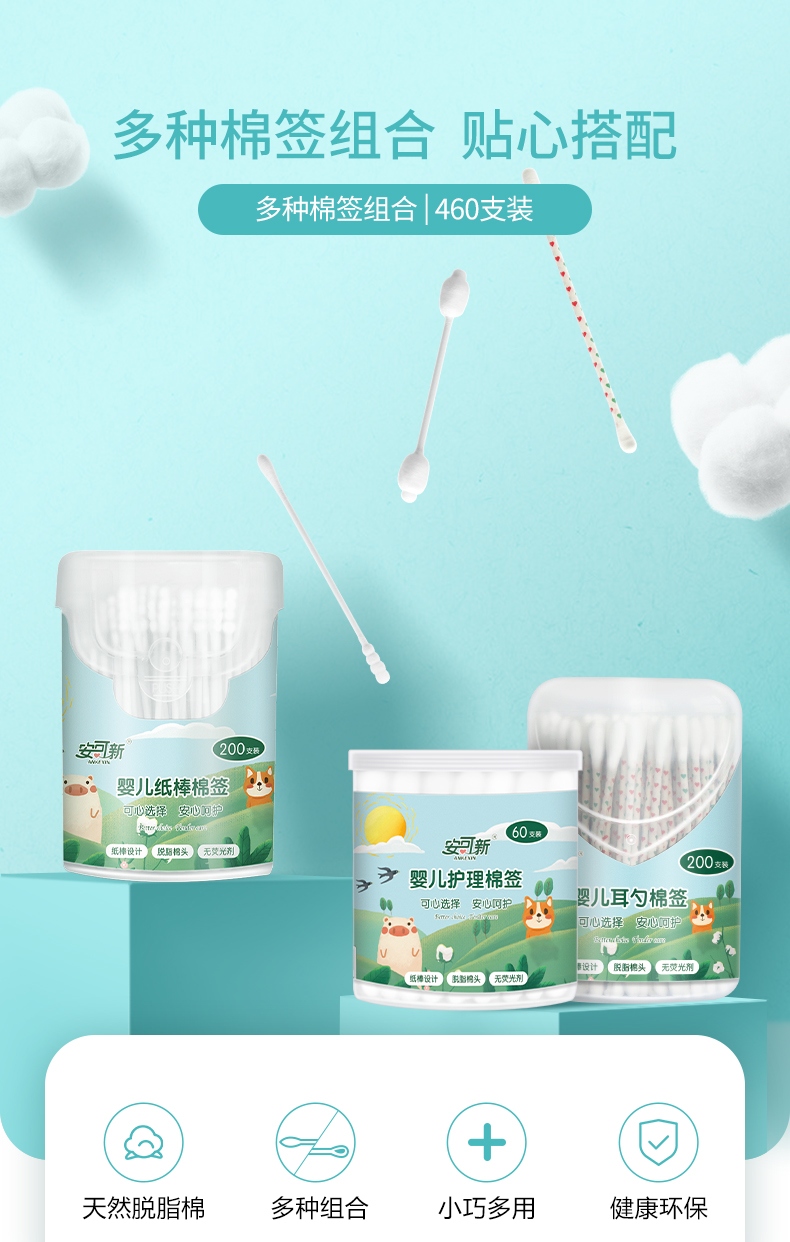 安可新棉签组合装,460支儿童双头纯棉棉签,无印染,无荧光剂,柔软亲肤,吸附能力强,3种棉头设计,满足多种不同日常护理需求,母婴级品质!妈咪必选【赠运费险】