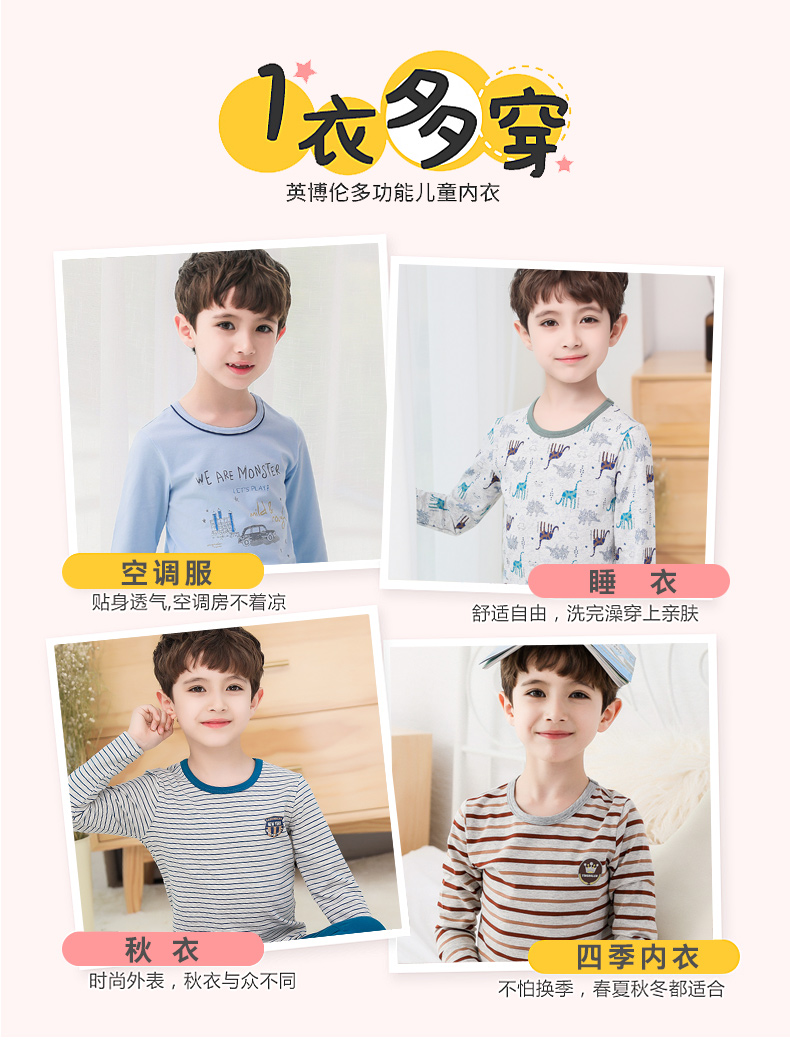 英博伦莱卡纯棉男童保暖秋衣秋裤,萌萌图案修饰,更显俏皮可爱。吸湿排汗,舒适透气,柔软亲肤,一衣多穿,春夏秋冬,一年四季都能穿,宝妈速抢!