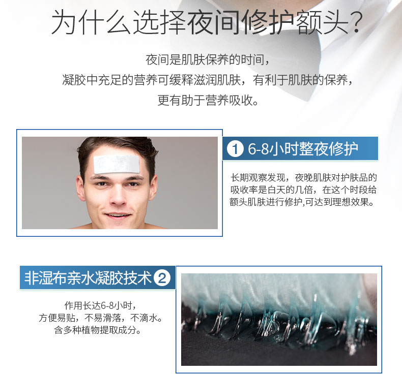 创新凝胶技术,富含植物精粹精华+维生素E+高浓度烟酰胺,抵抗衰老,长时间滋养肌肤。贴敷6-8小时,重塑水嫩饱满额头