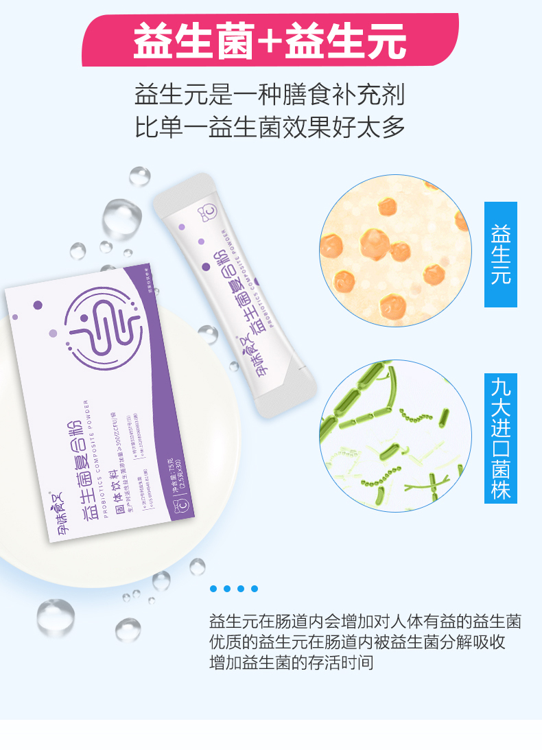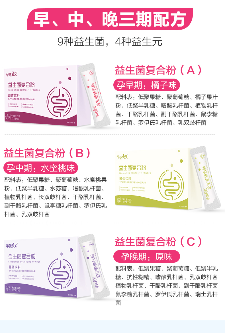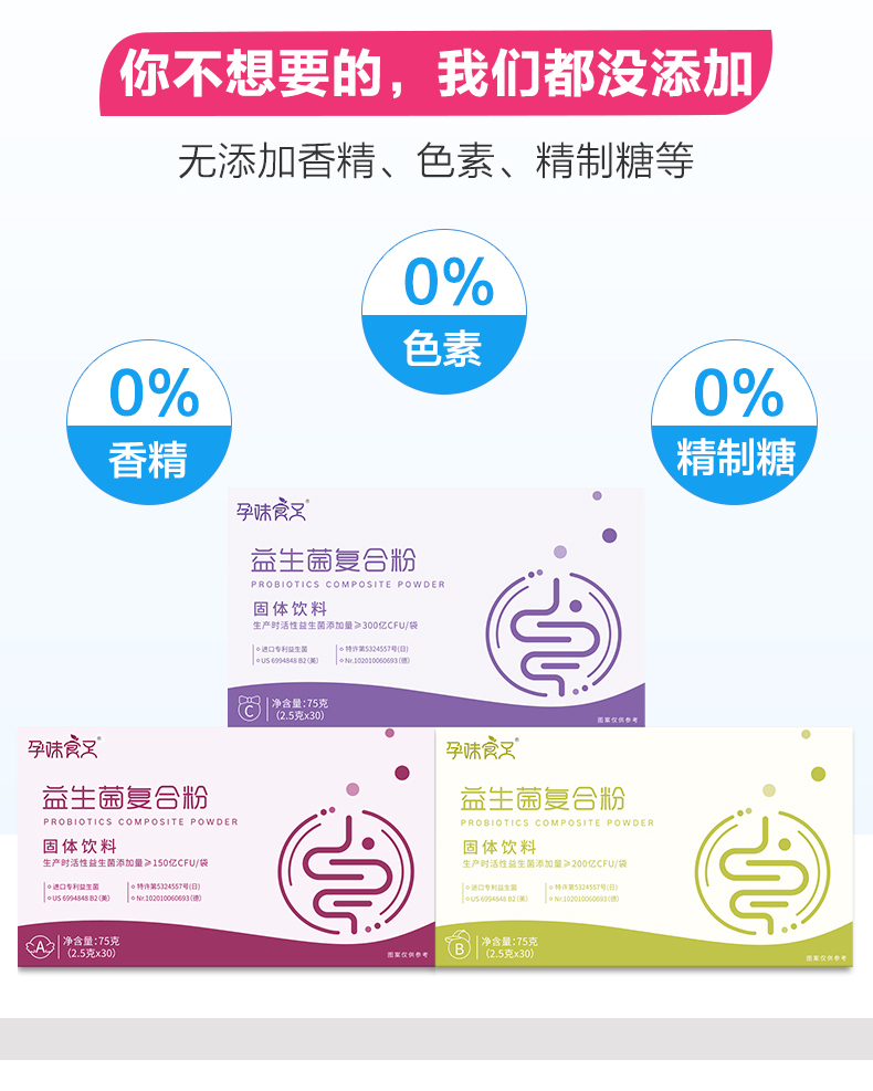 便秘、腹泻、胀气、消化不良、有口臭?与其一把把地吃药,不如来点益生菌调节肠道健康。孕味食足益生菌,孕妇都能放心喝的益生菌,采用多国进口专利菌种,高活菌数量(每袋150~300亿CFU/袋),三种口味可