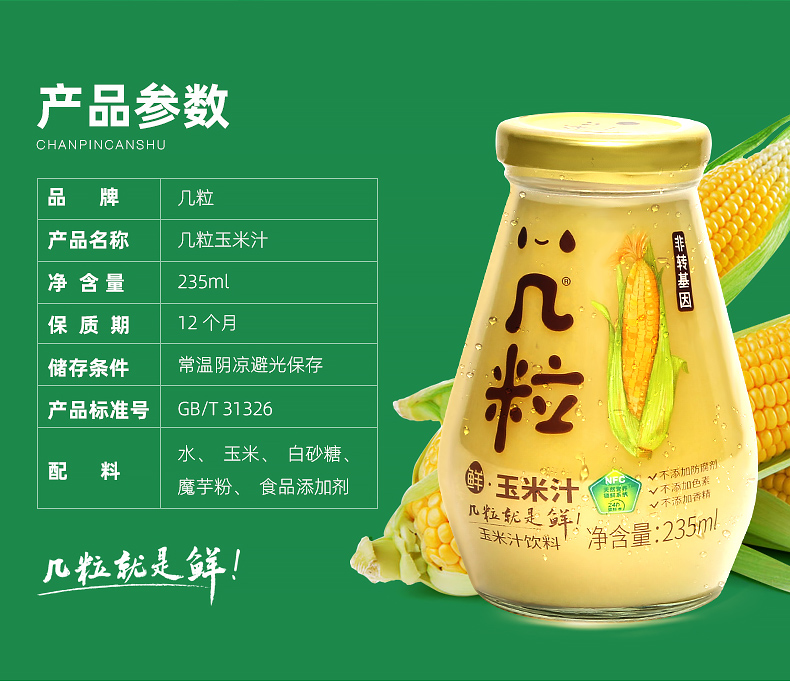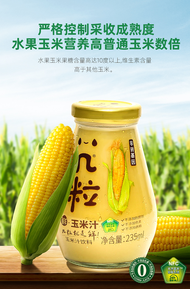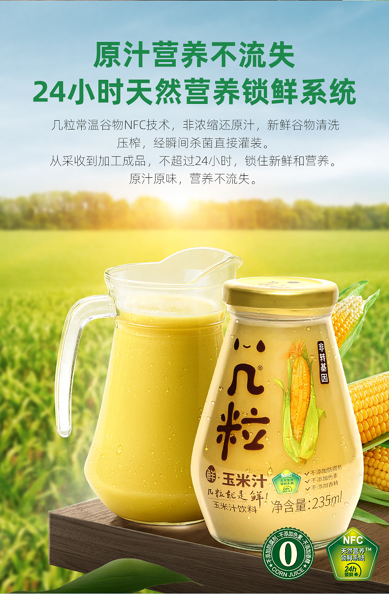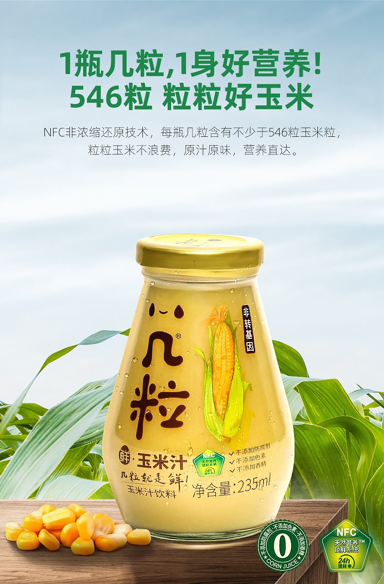 几粒NFC鲜玉米汁饮料235ml-6胖瓶装,魔芋粉+白砂糖+鲜玉米+水,味道鲜美,日期新鲜,天然营养,包装讲究,安全放心【赠运险费】