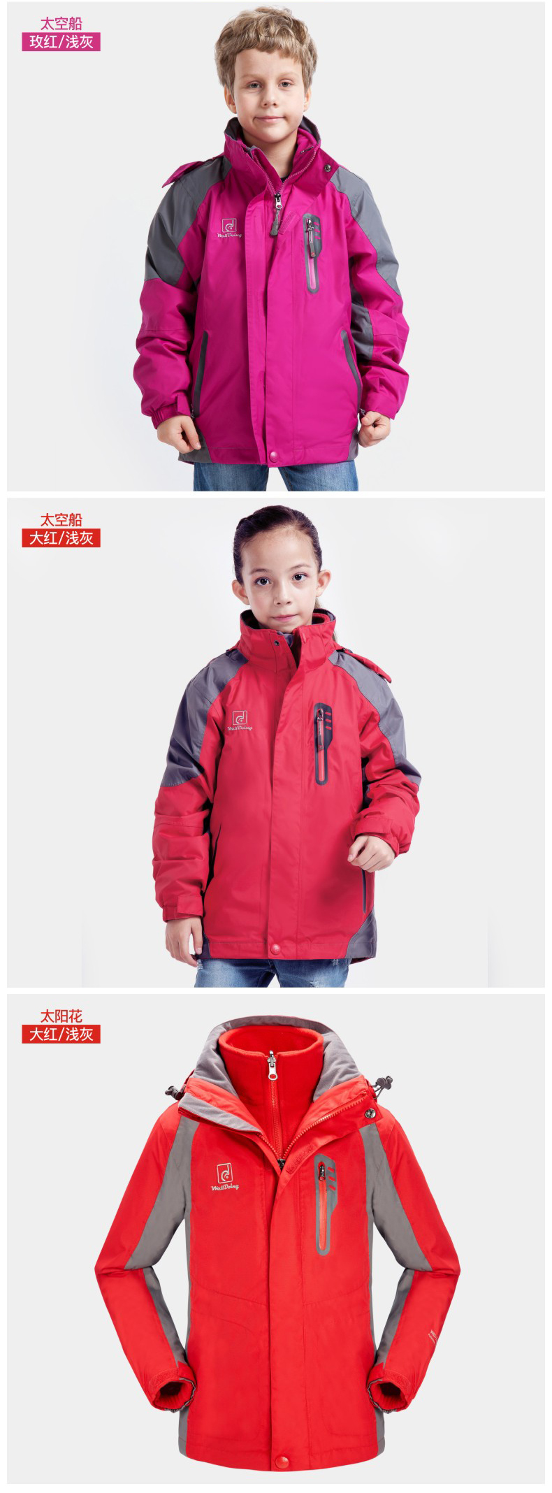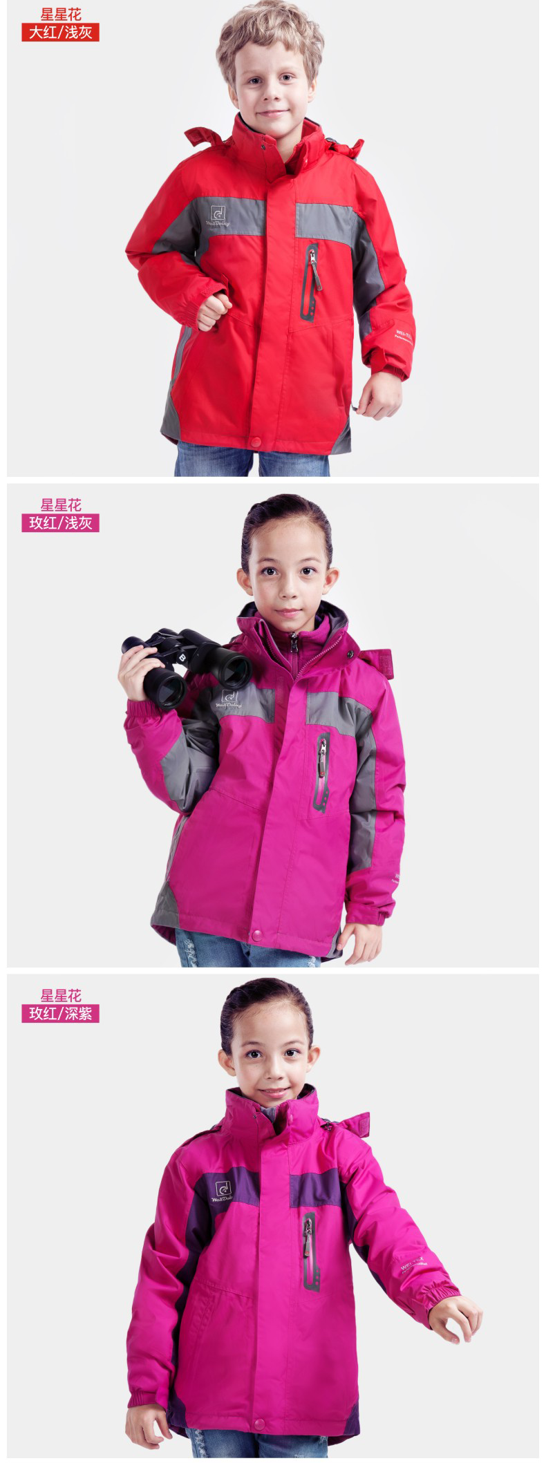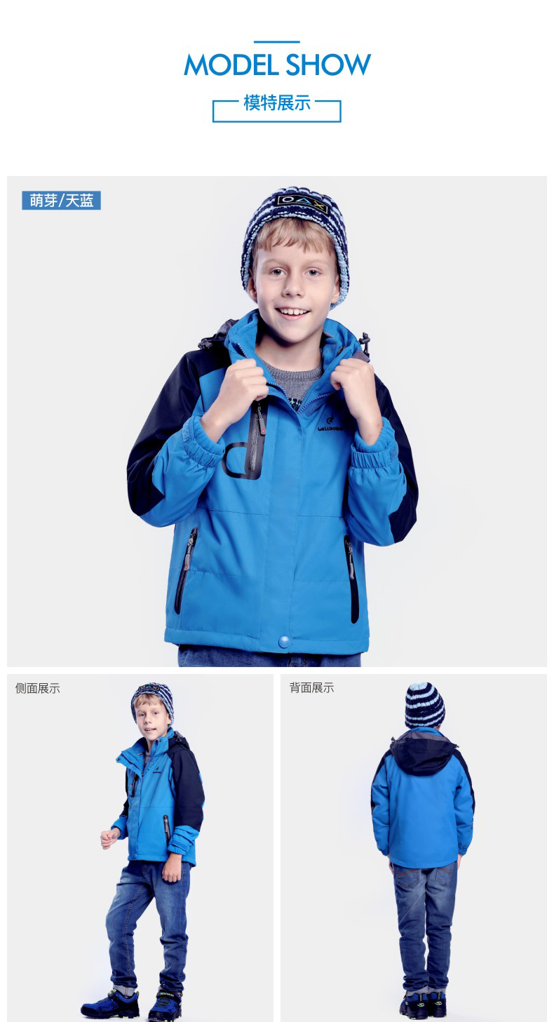 儿童冲锋衣舒适户外,多款多色,防风保暖科技面料,柔软内里穿着舒适,全天候双层三合一冲锋衣,拒风拒寒妈妈更放心!!!