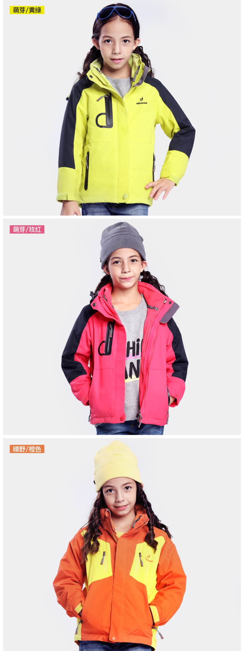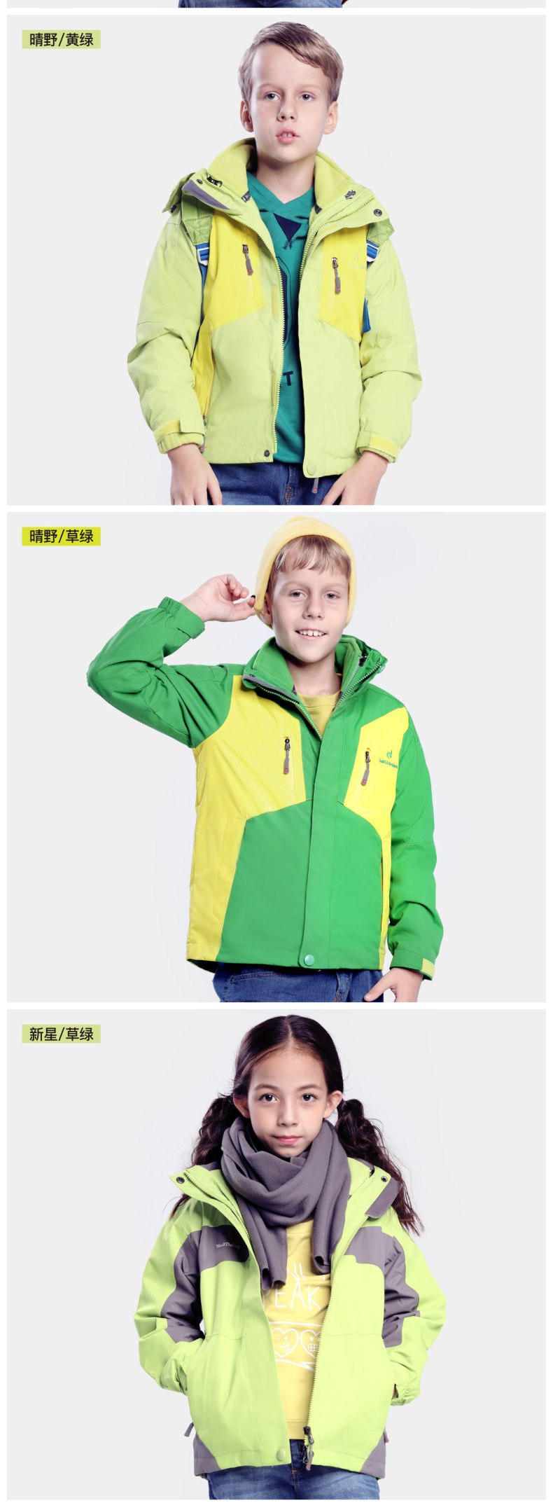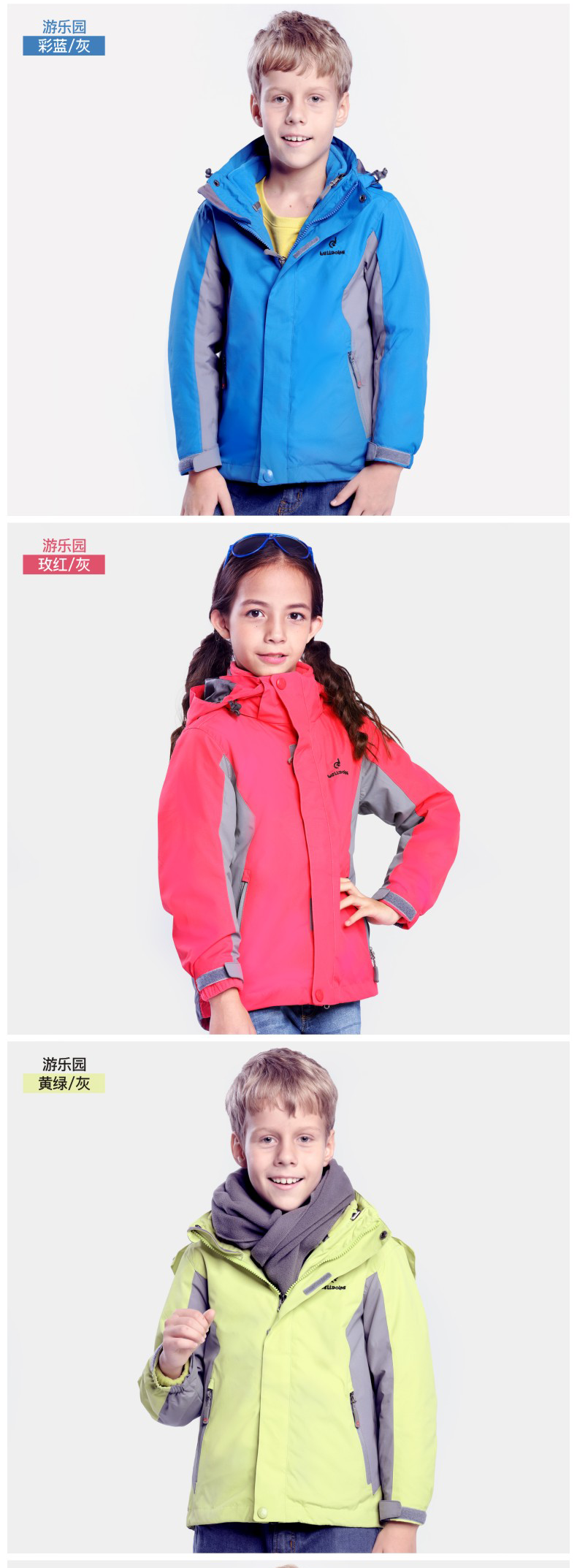 儿童冲锋衣舒适户外,多款多色,防风保暖科技面料,柔软内里穿着舒适,全天候双层三合一冲锋衣,拒风拒寒妈妈更放心!!!