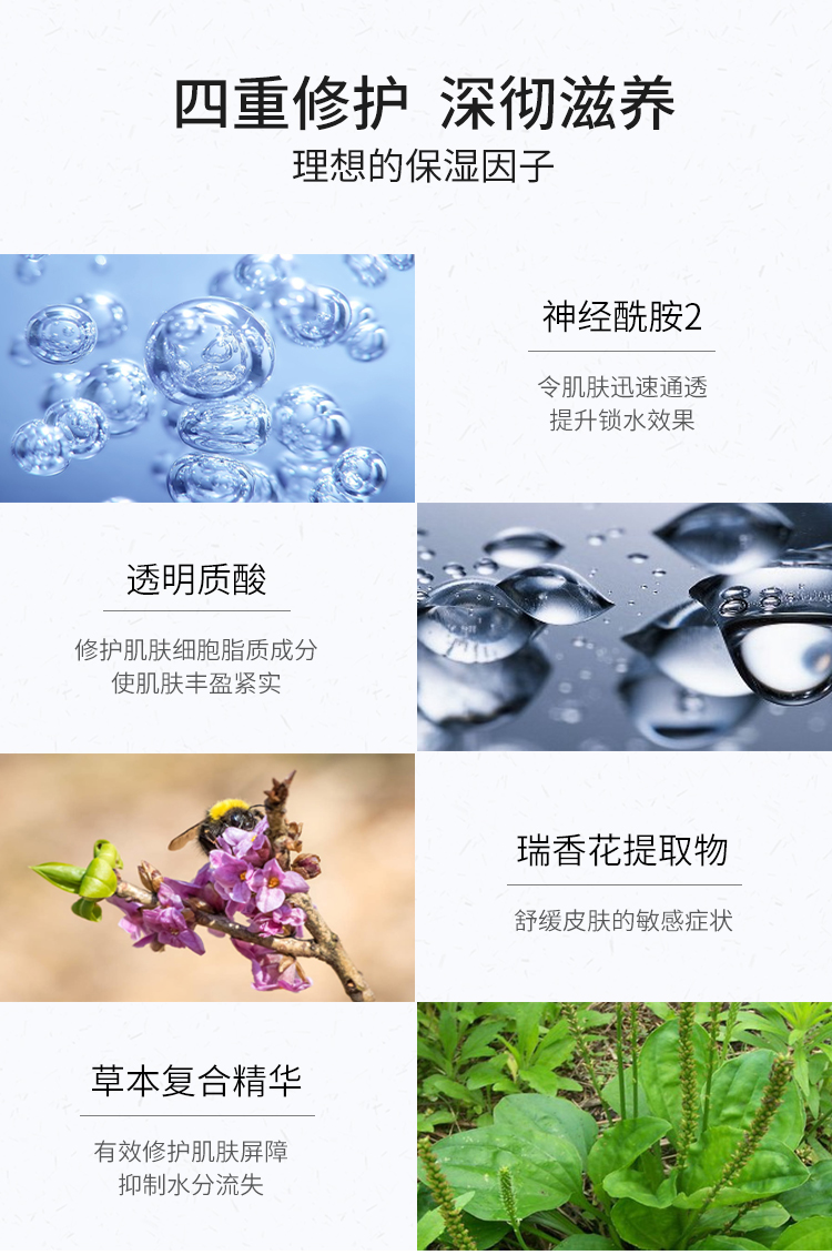 应急修复,安抚肌肤小情绪,深彻补水,持续保湿,修复损伤!源于自然的锁水磁石,开启恒润锁水,清爽保湿自在!!!