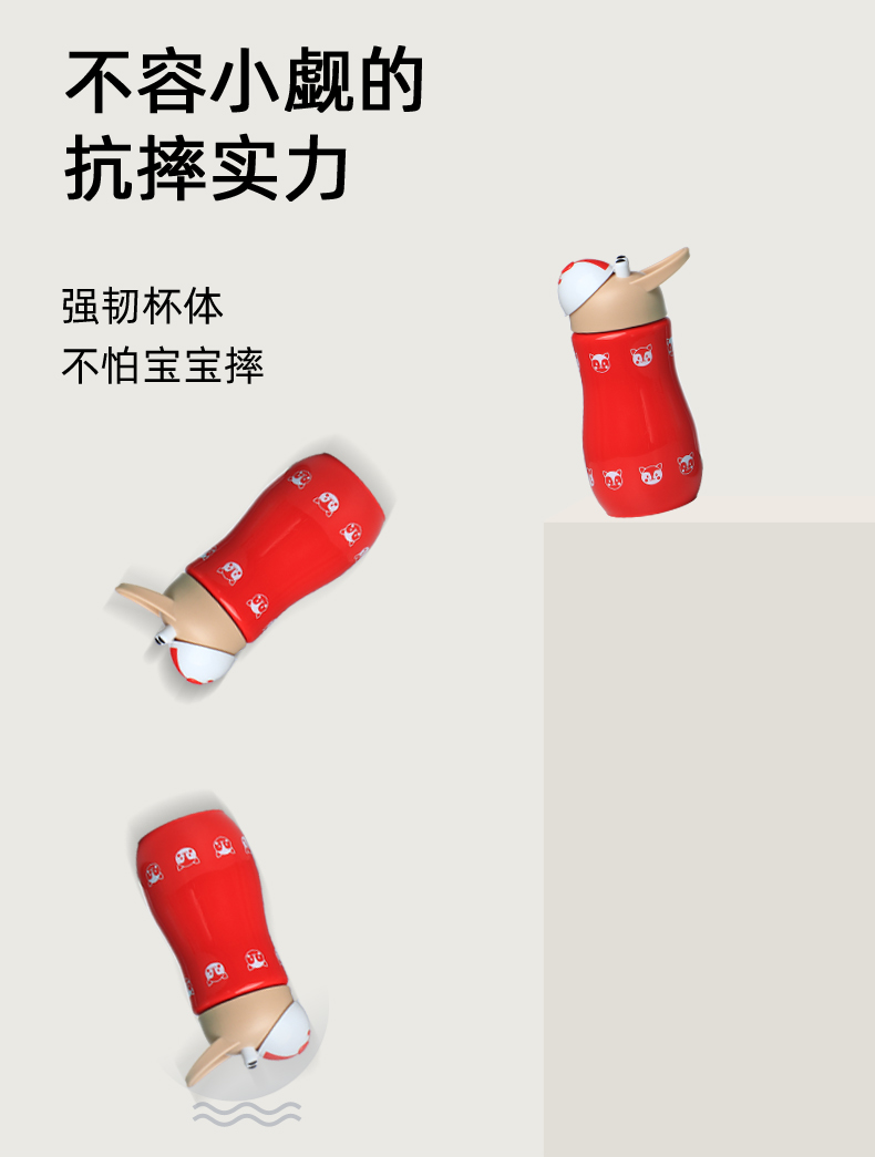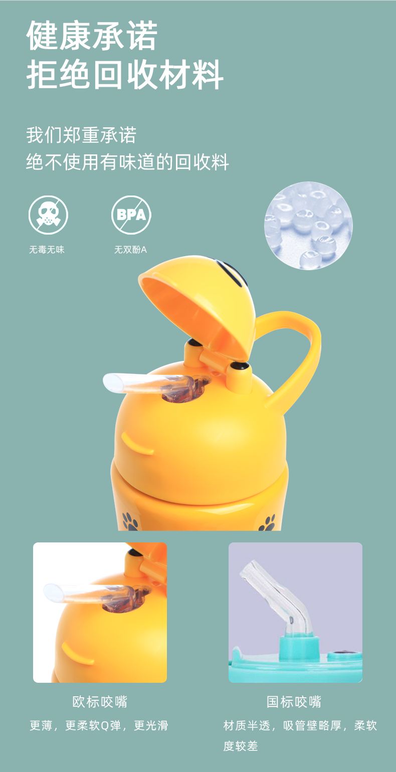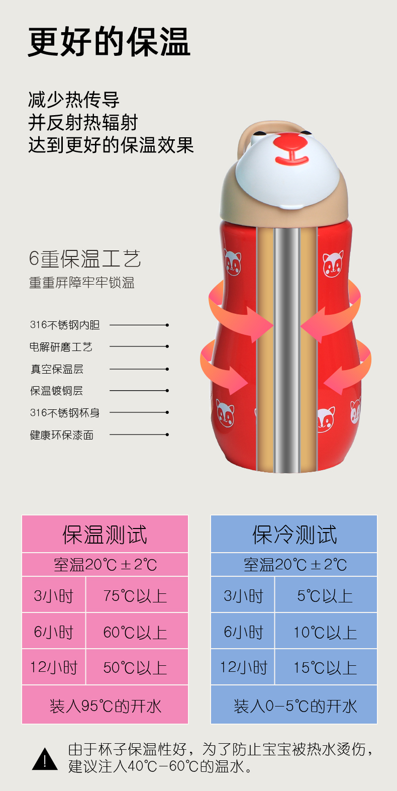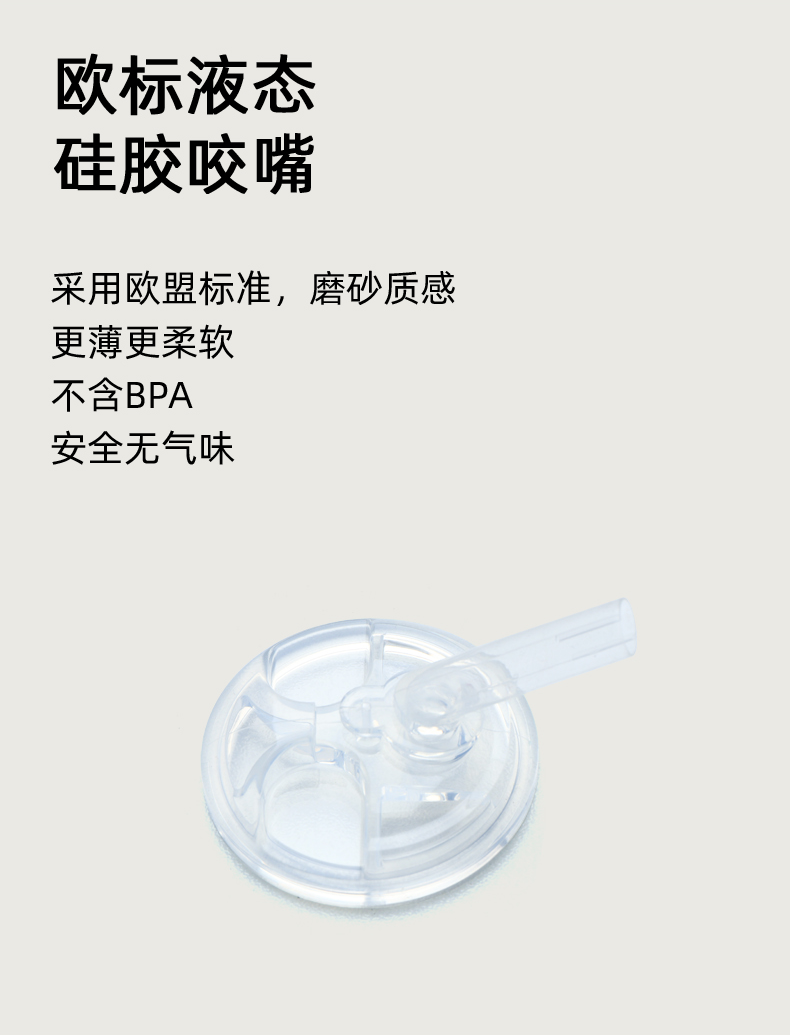 316L优质不锈钢内胆,安全无气味,减少热传导,达到更好的保温效果,采用欧盟标准,磨砂质感,不含BPA,更薄更柔软,五色可选,强韧杯体,不怕宝宝摔哦!