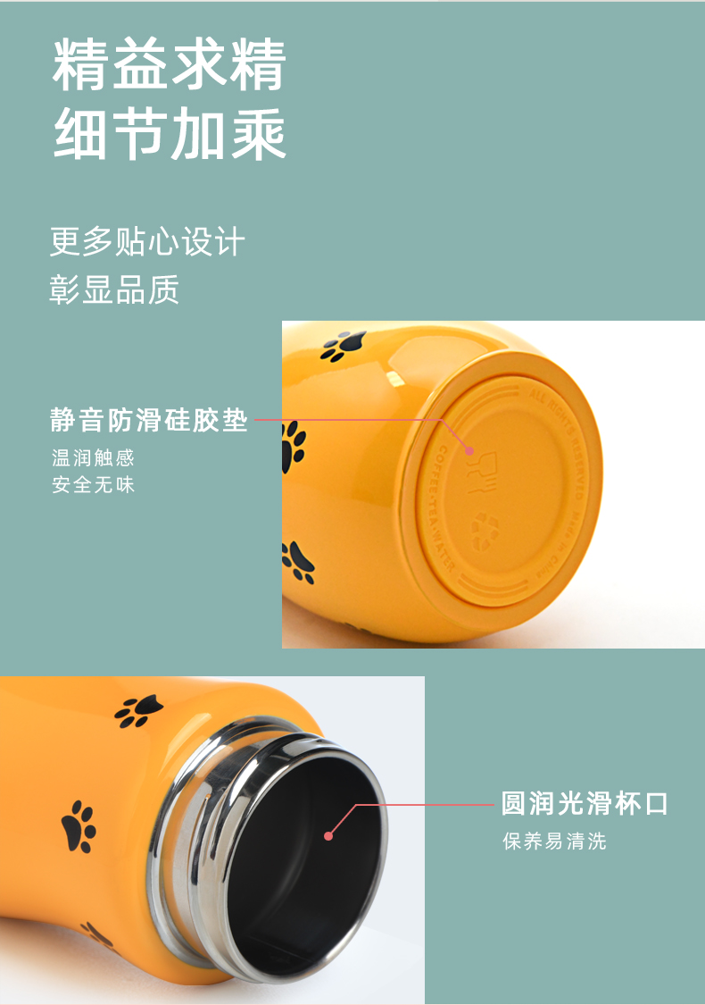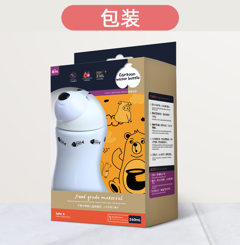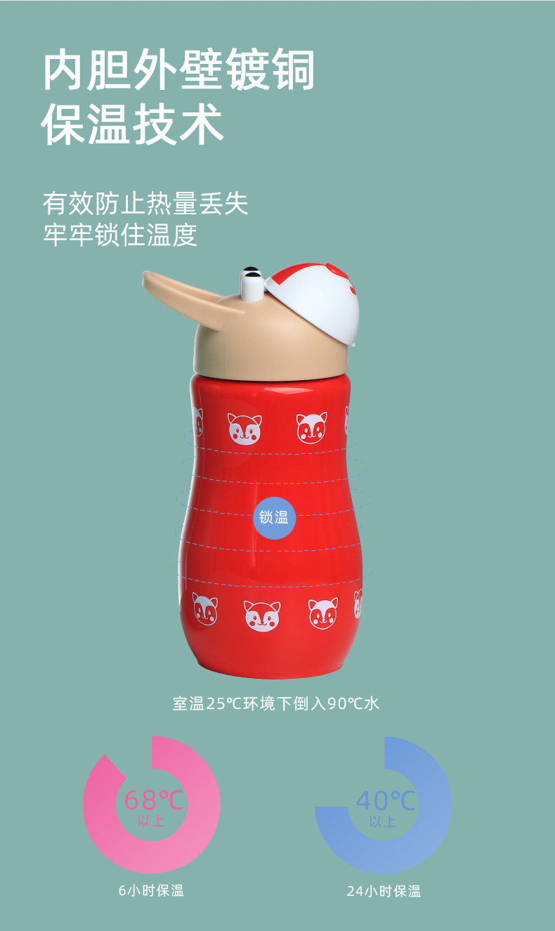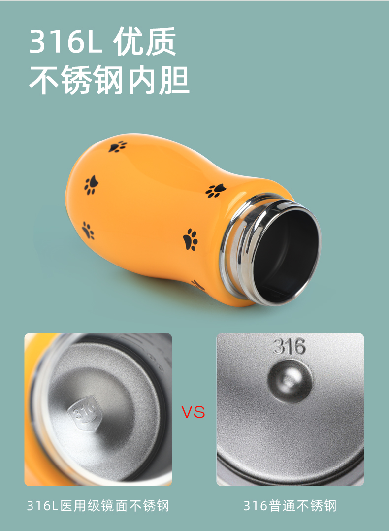 316L优质不锈钢内胆,安全无气味,减少热传导,达到更好的保温效果,采用欧盟标准,磨砂质感,不含BPA,更薄更柔软,五色可选,强韧杯体,不怕宝宝摔哦!