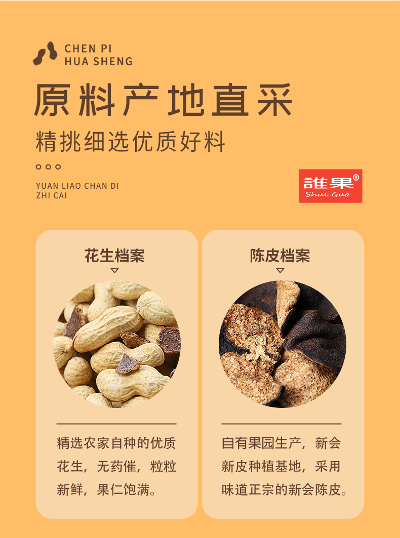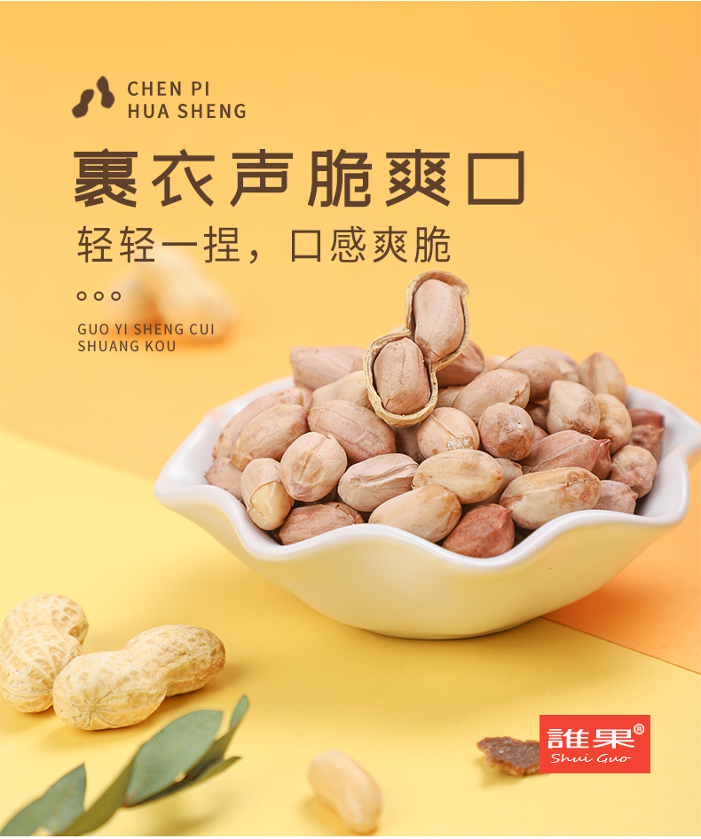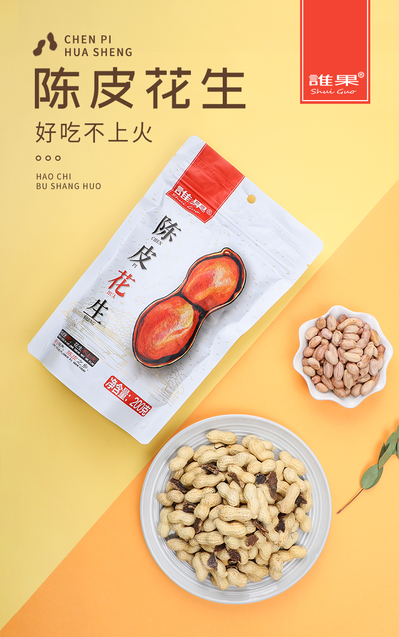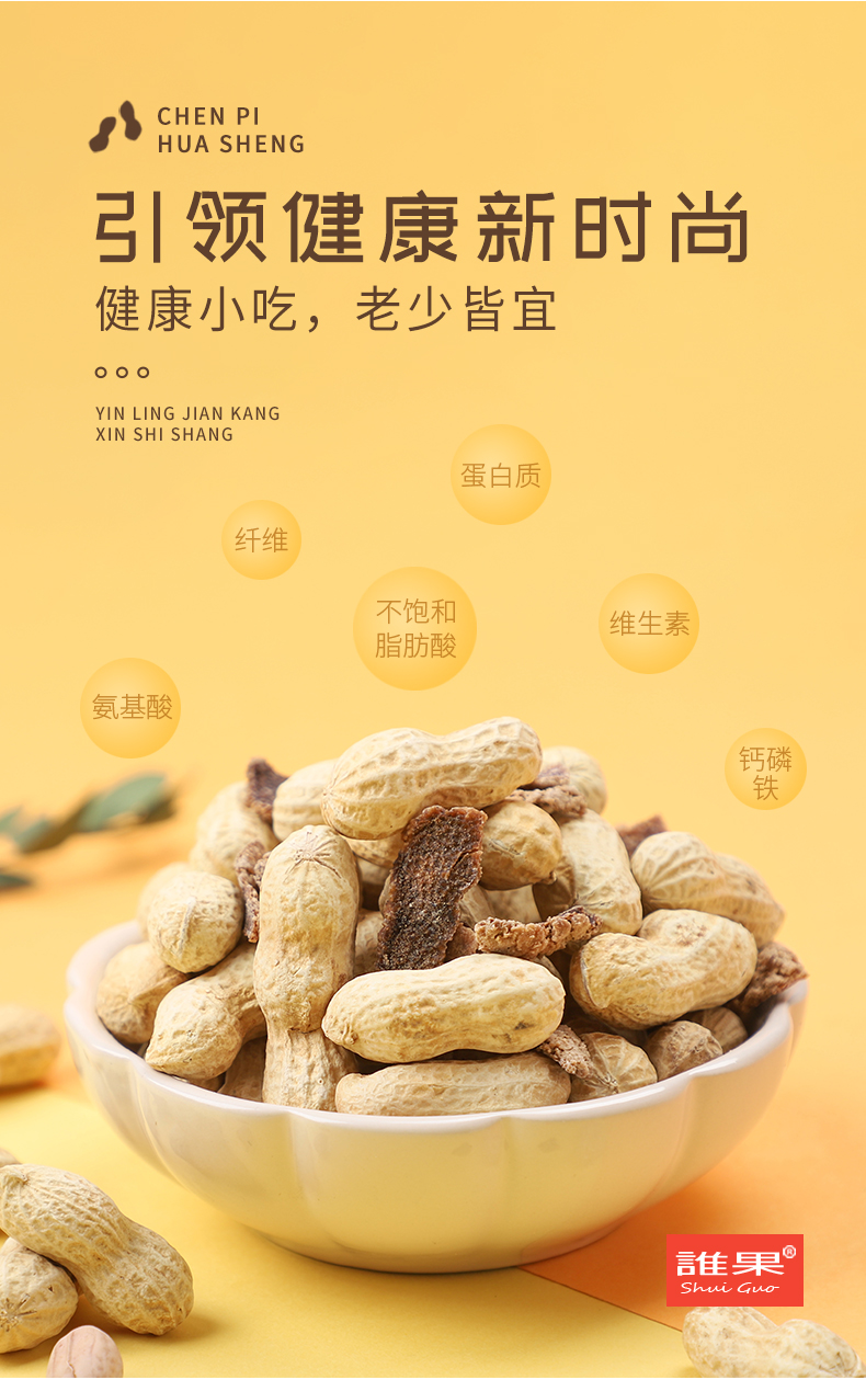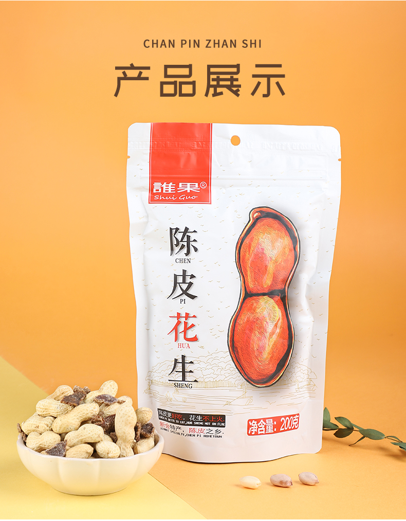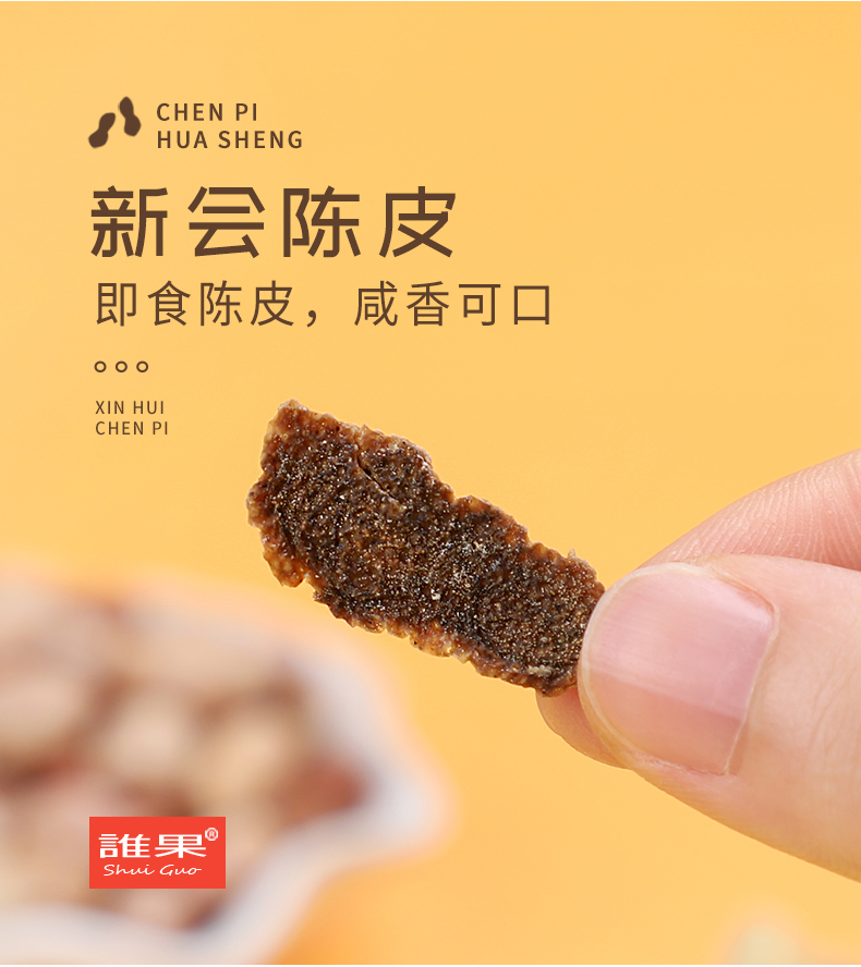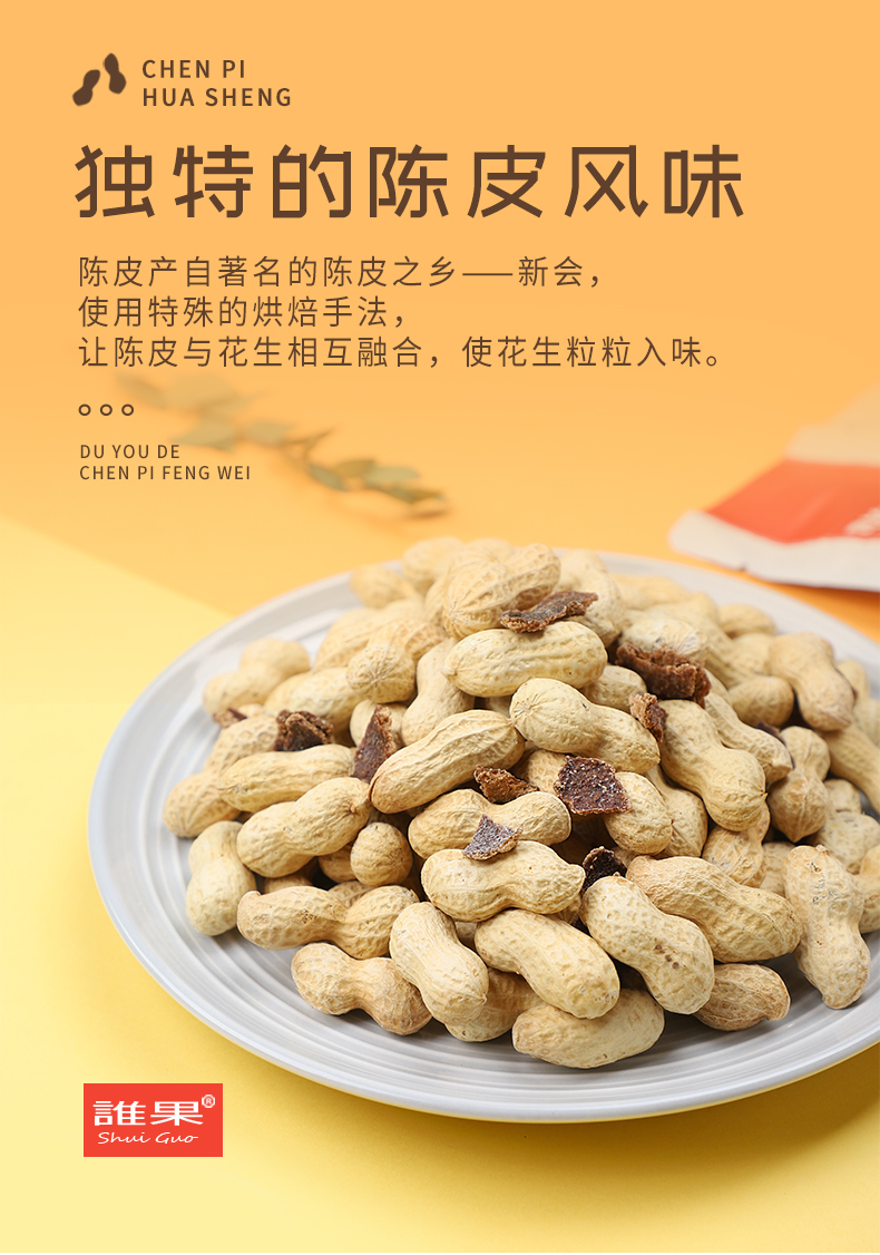 陈皮脆花生,特殊的烘焙手法,入口酥脆,富含粗纤维、维生素A、E,蛋白质等多种营养元素,零食伴侣
