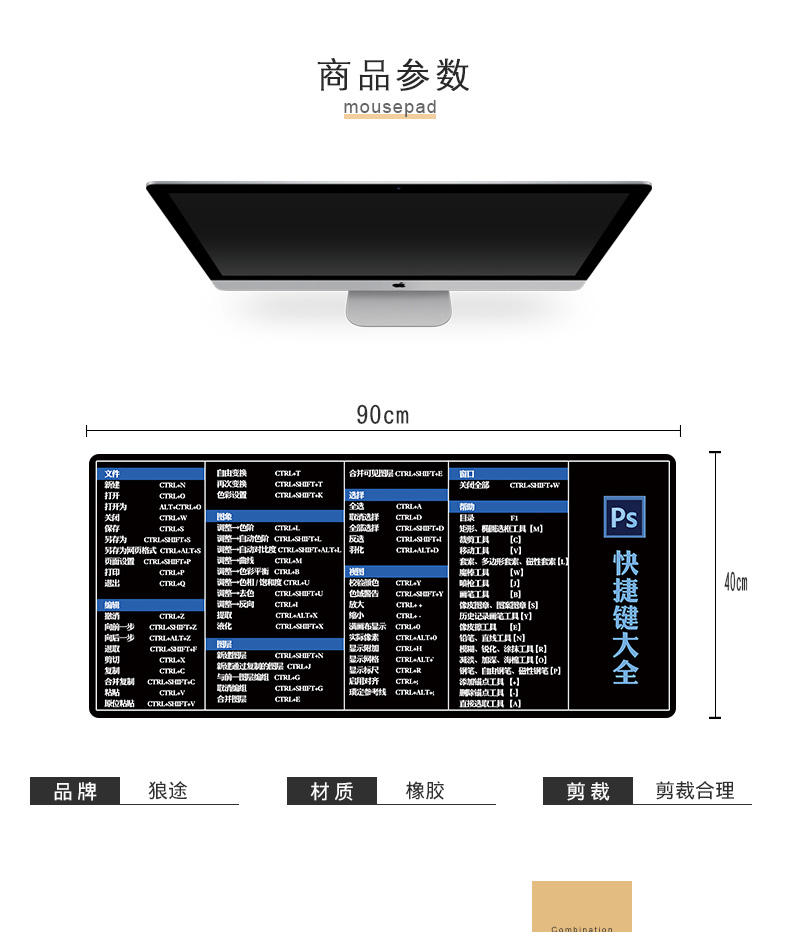 办公超大号鼠标垫快捷键全套做图 ps ppt exce AI 防水键盘垫定制
