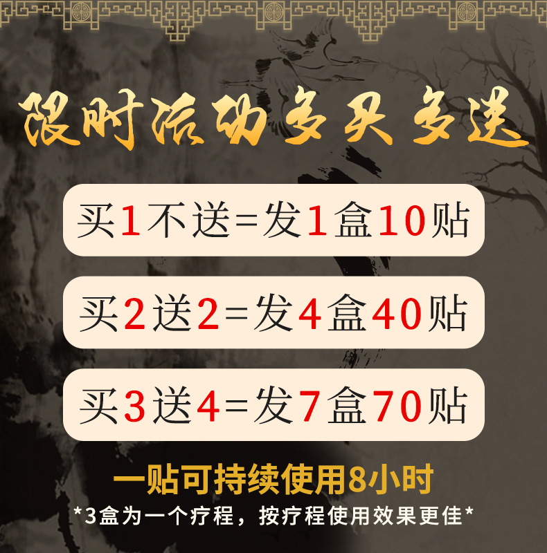 【买2送2,买3送4】,正品保证,15天无理由退换,主要针对症状:肩周炎,腰椎间盘突出,腰痛,跌打损伤,一贴持续药效8小时!