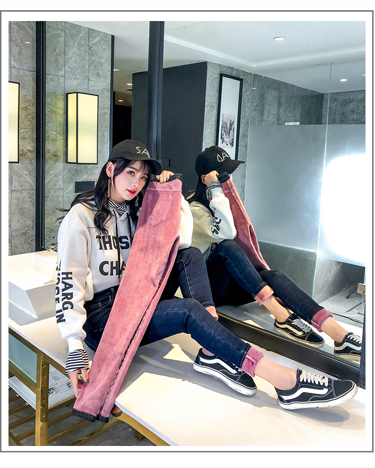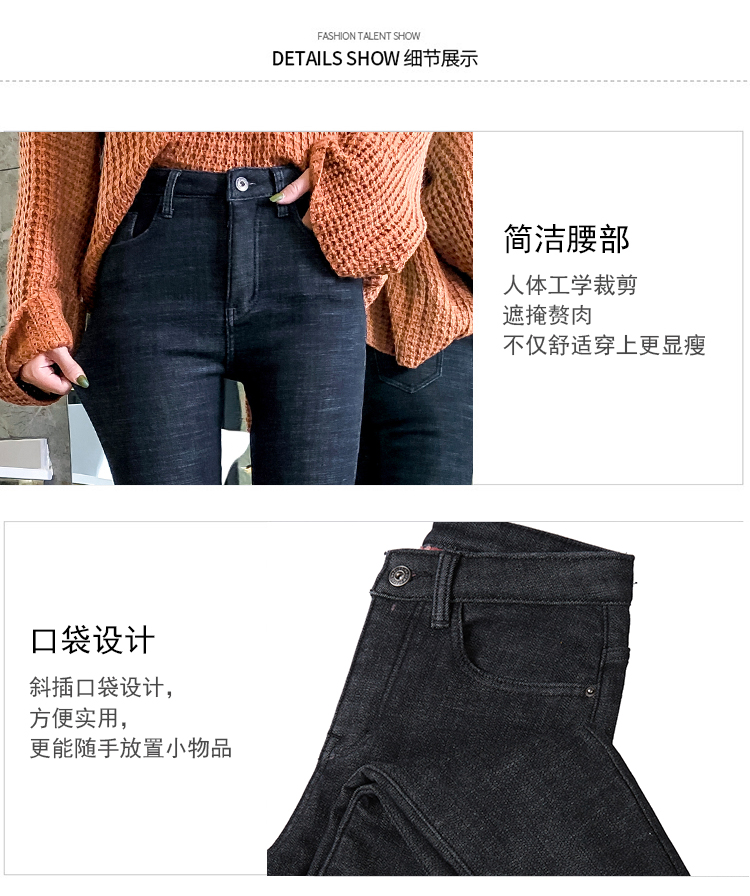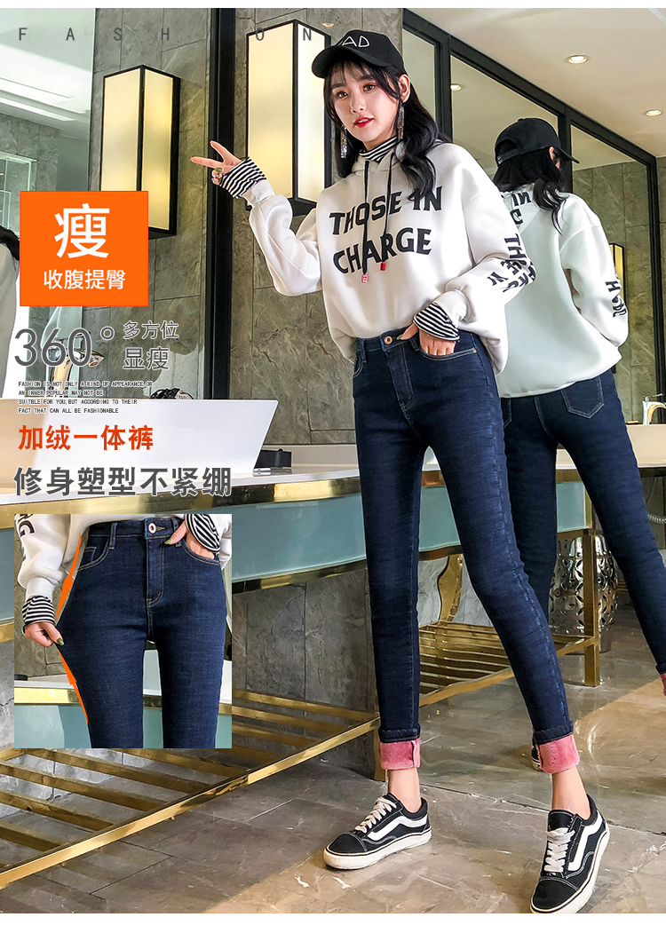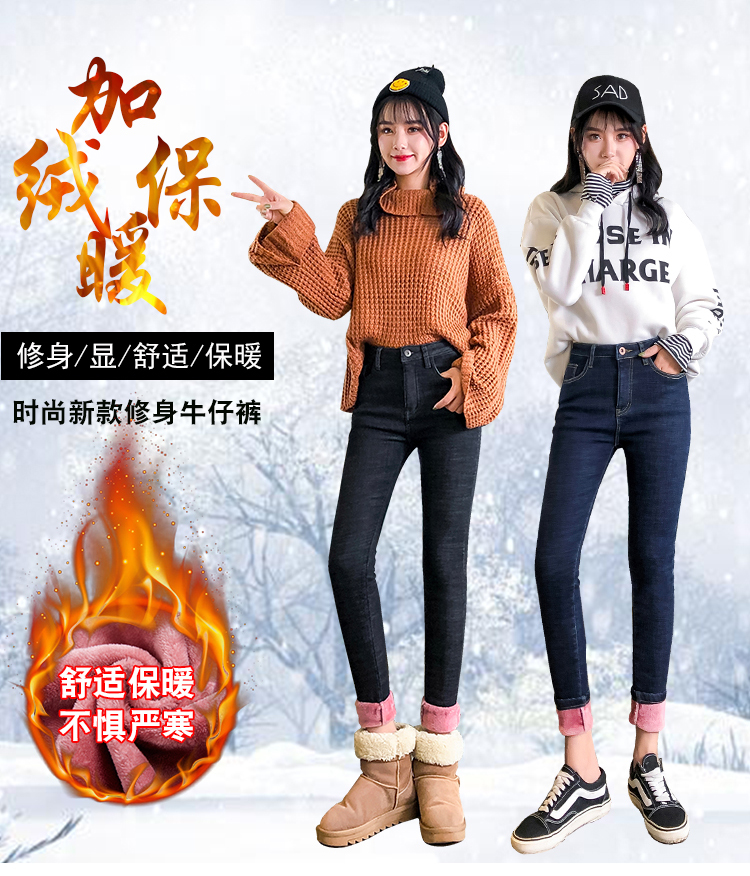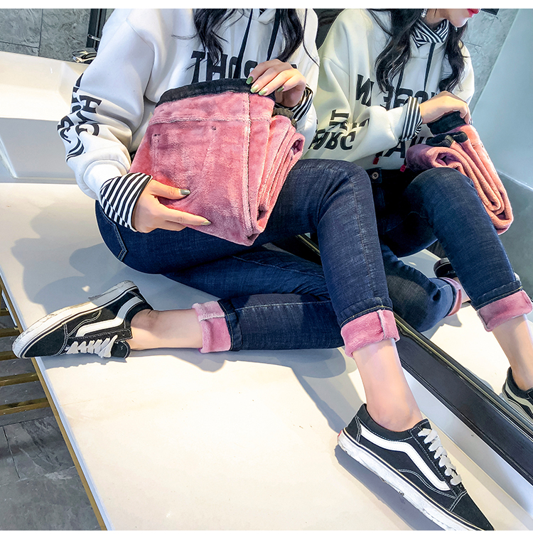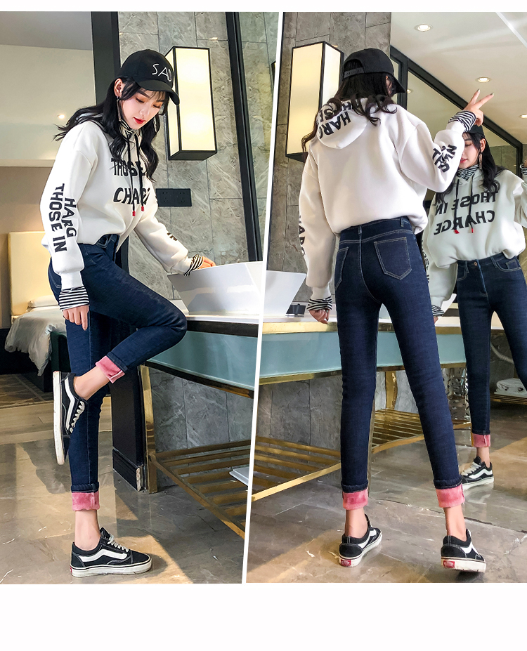 牛仔裤女修身显瘦2019秋冬新款长裤加绒九分高腰弹力小脚女裤子潮