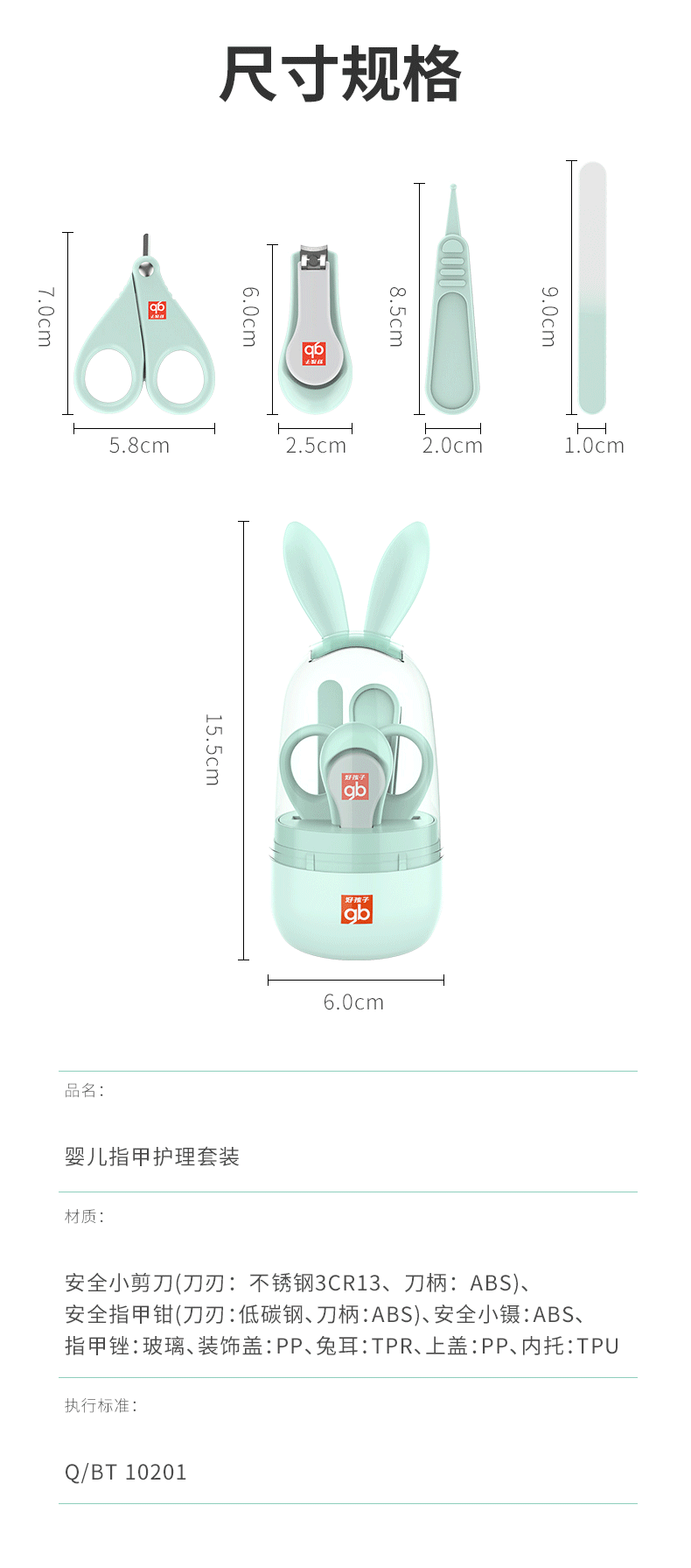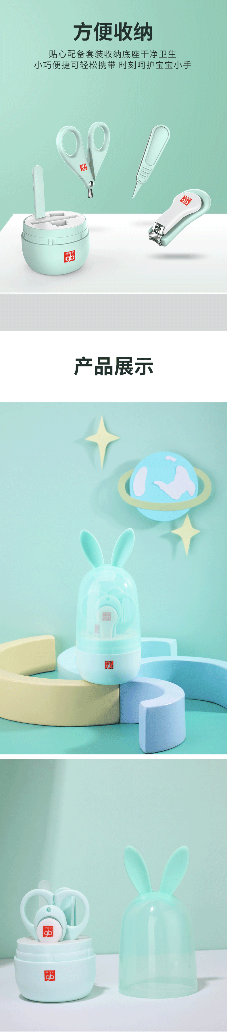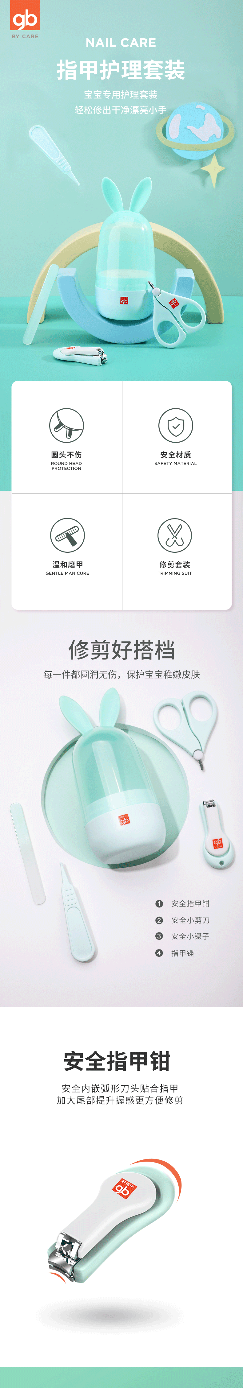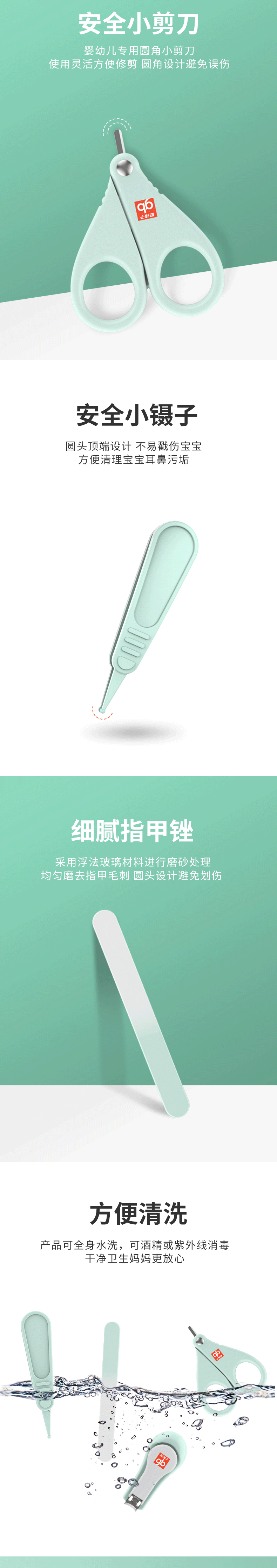 为宝宝精心设置的护理套装,圆润短刀头,易清洗,防夹肉,清洁保护盖,整洁卫生,轻松指甲护理