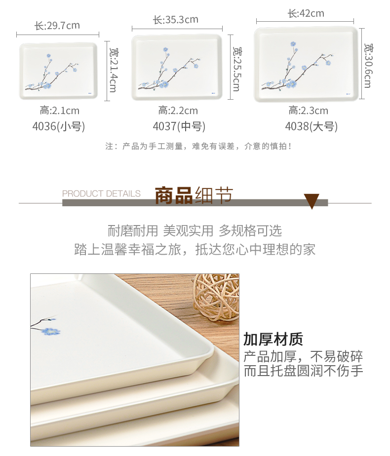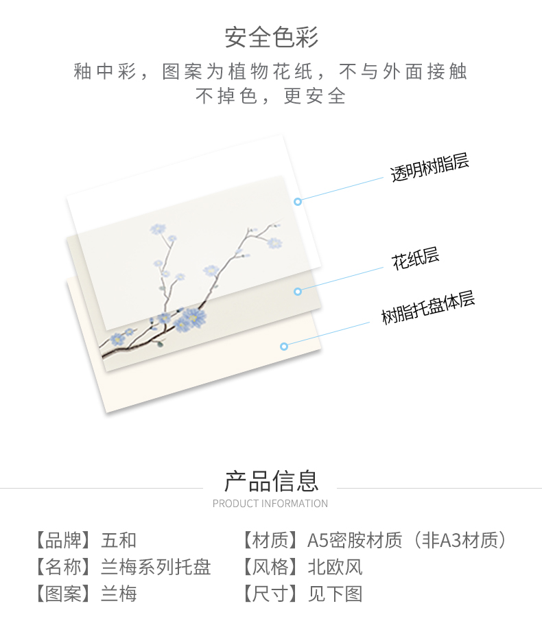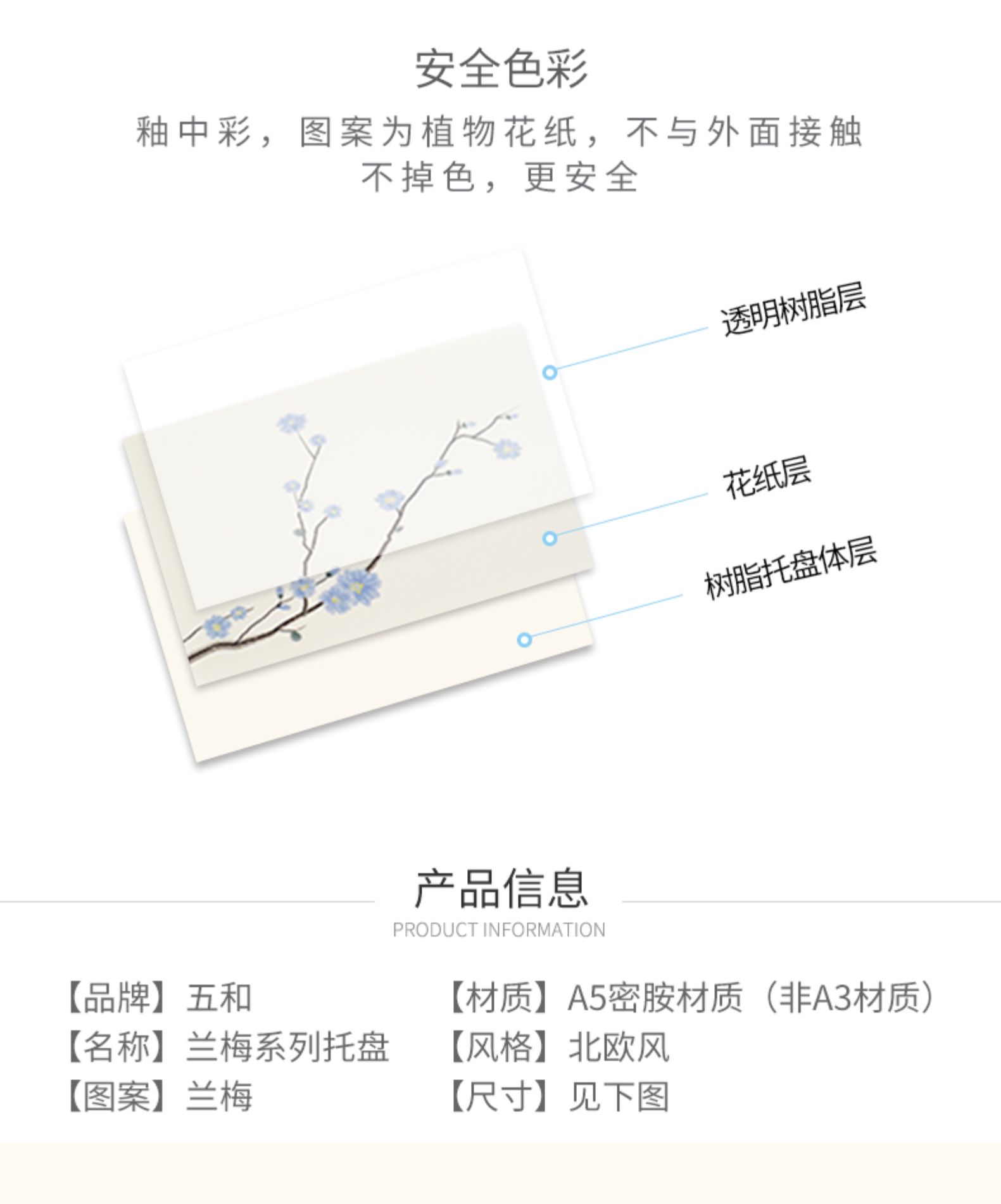 A5食品级纯密胺材质托盘,具有陶瓷般质感和稳定性,生动形象的花色图案,清新淡雅,展现居家美感,易清洗,能耐低高温,不易碎,一物多用,时尚方便,品质生活精致体现。