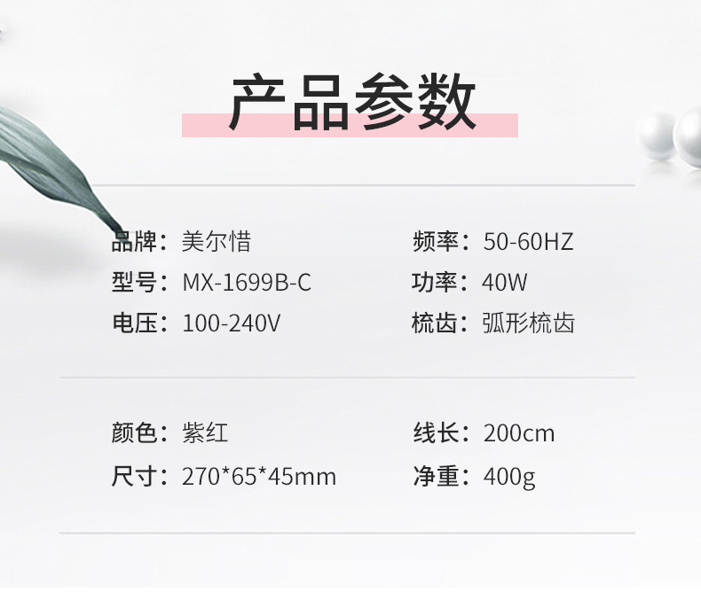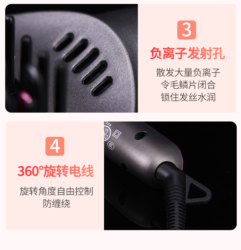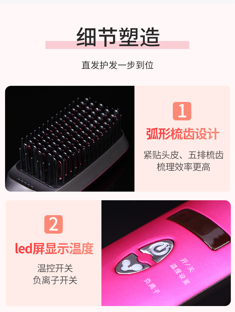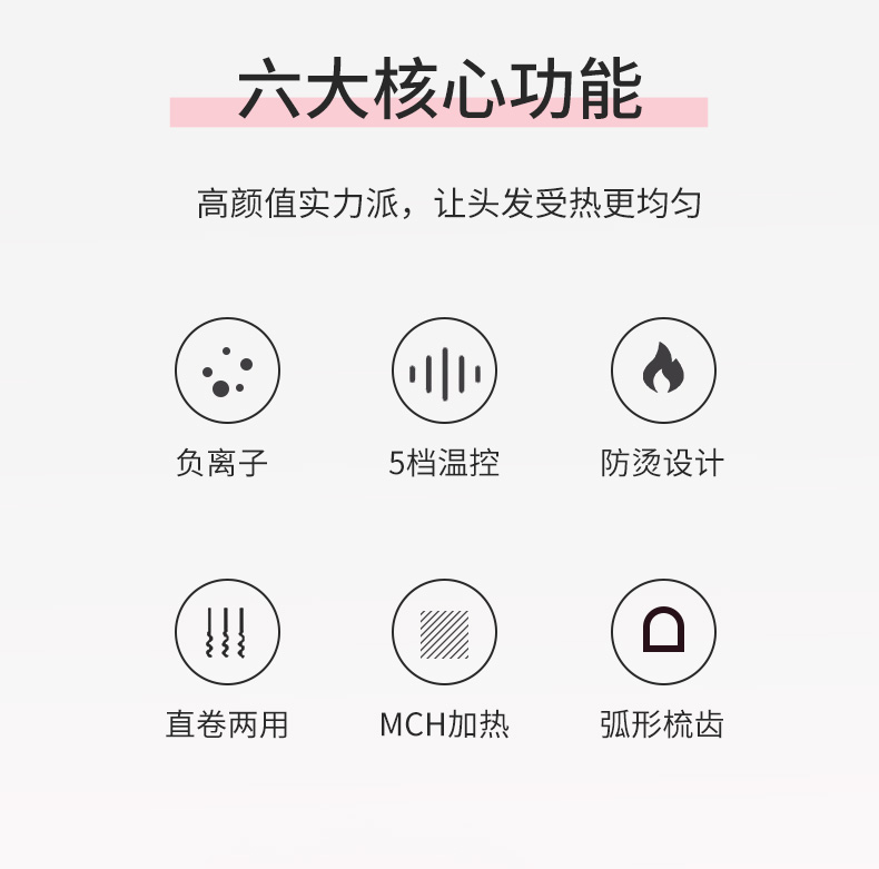 针对毛躁发质,负离子护发智能恒温,3D浮动夹板,PTC发热技术,智能温控,卷直两用,随心操控,一机搞定!