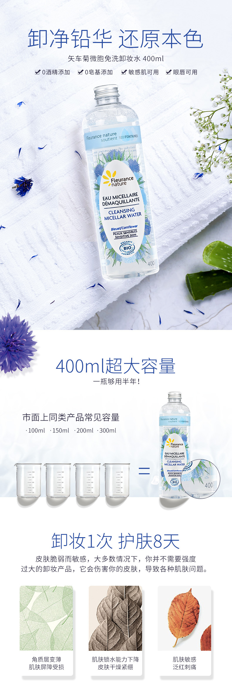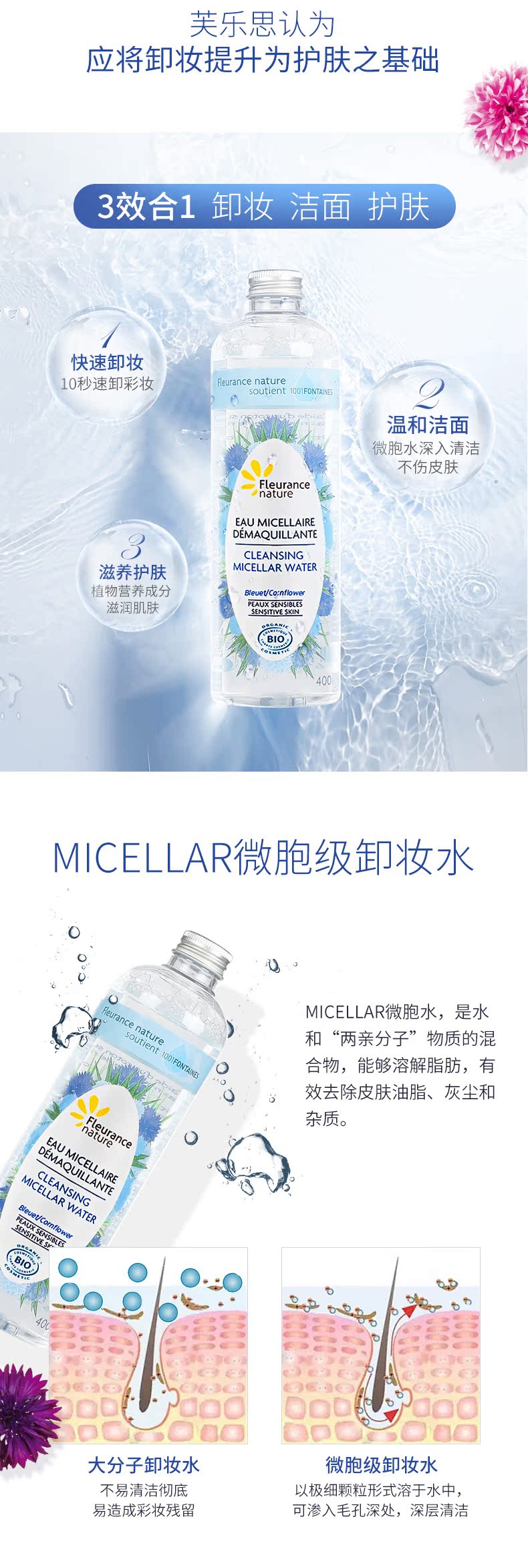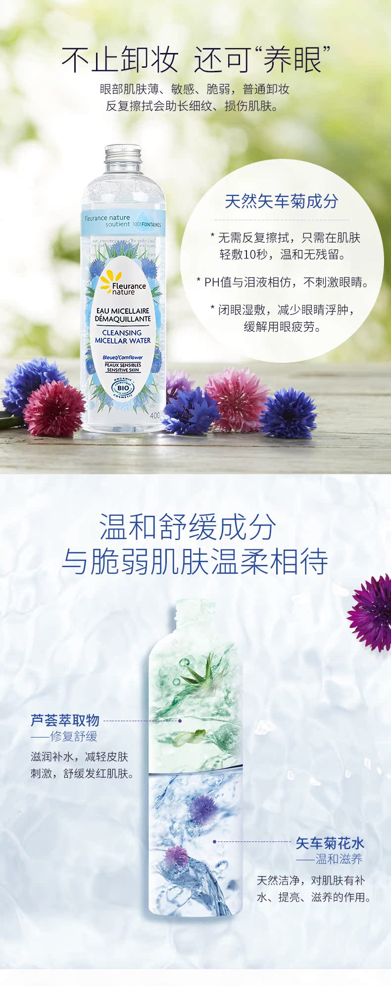 法国芙乐思矢车菊温和清洁脸部控油敏感肌可用眼唇免洗卸妆水大瓶