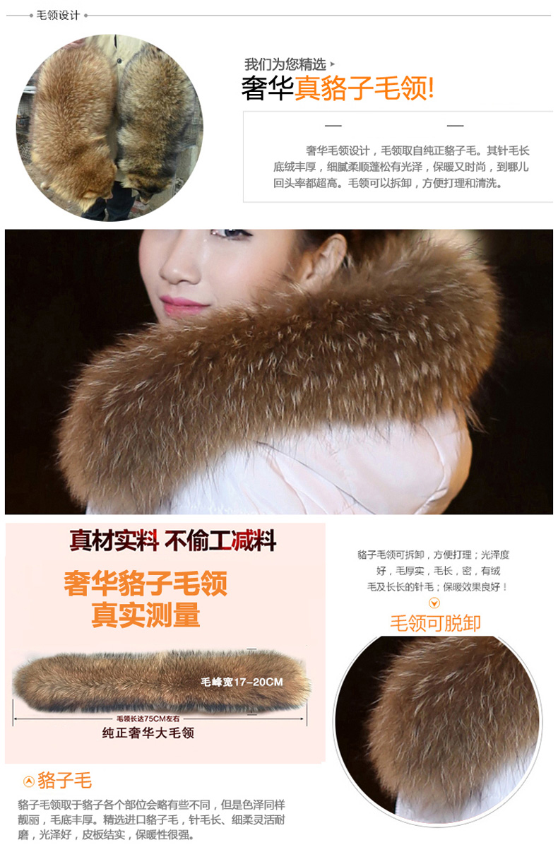 90%白鸭绒,时尚貉子大毛领,时尚有型御寒保暖。修身版型,双层内胆,拒绝钻绒。
