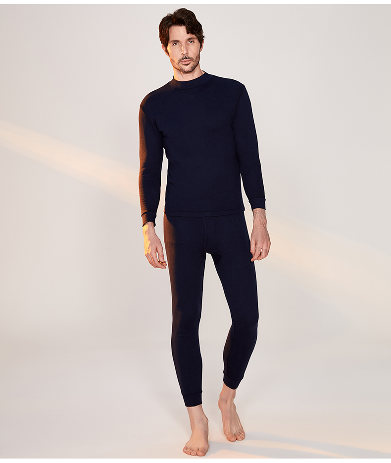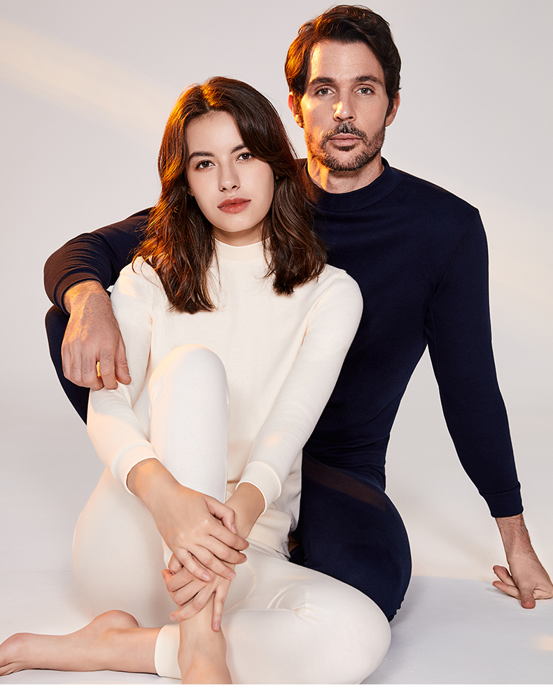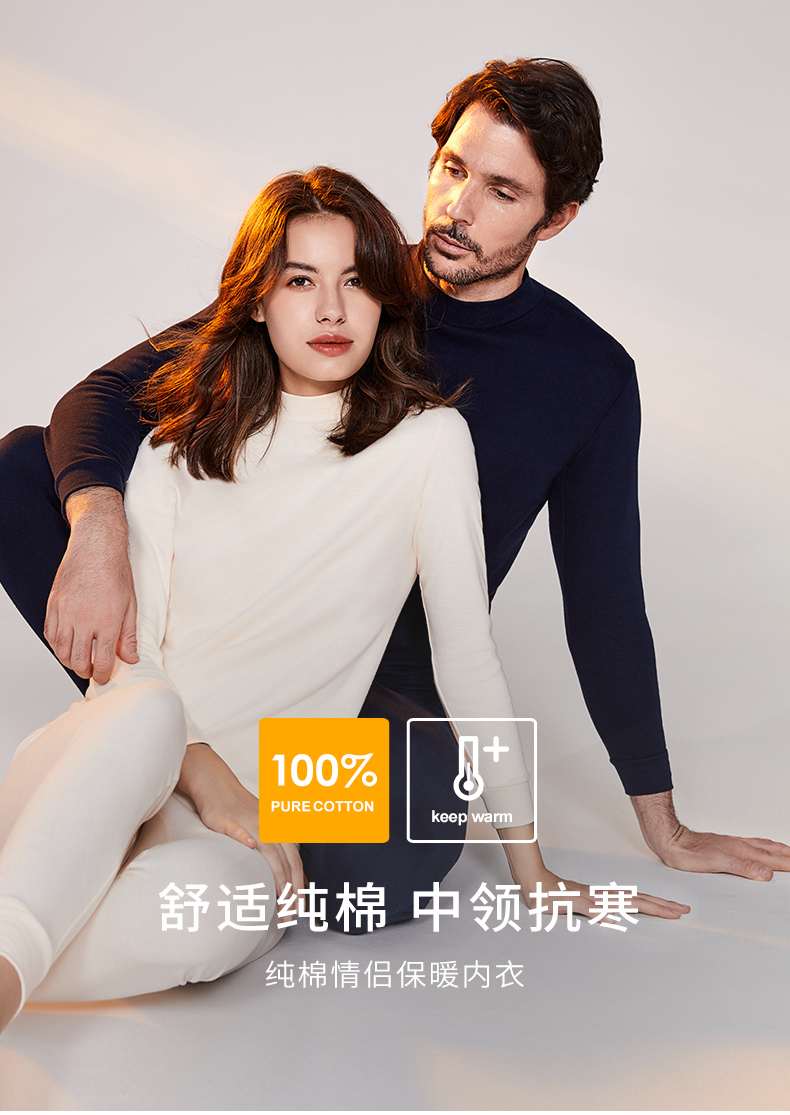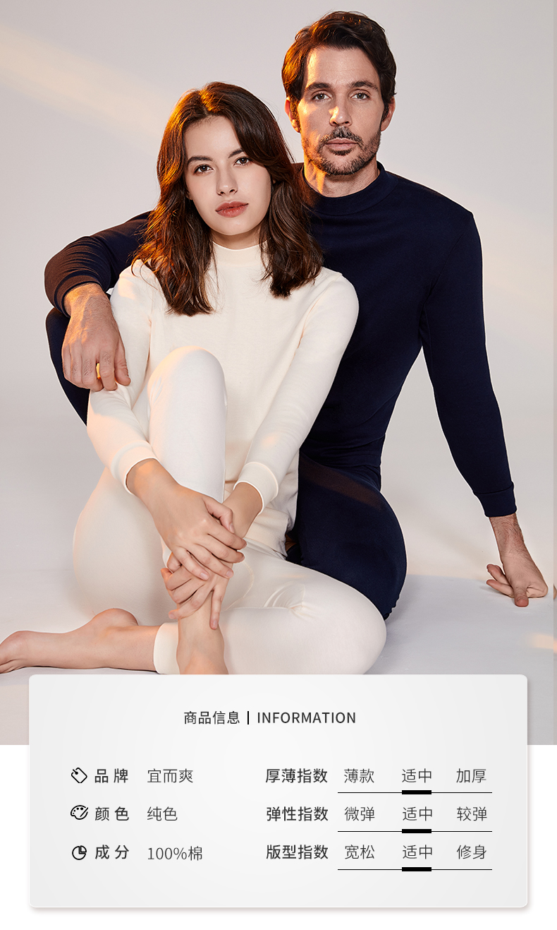 宜而爽男士纯棉半高领保暖内衣秋冬情侣款秋衣秋裤女全棉毛衫套装