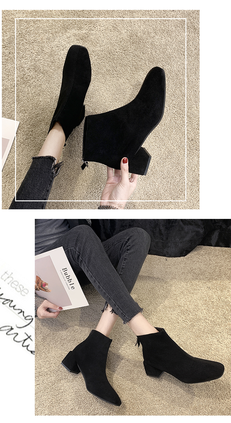马丁靴女英伦风后拉链粗跟秋高跟方头百搭瘦瘦短靴女靴子冬季加绒