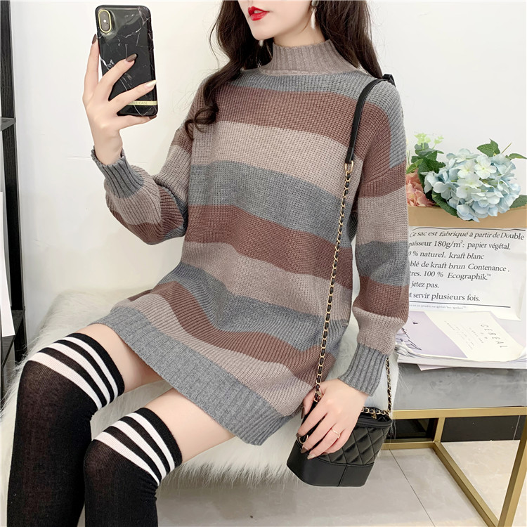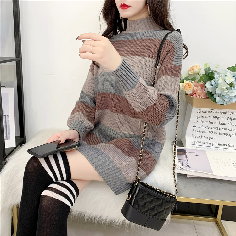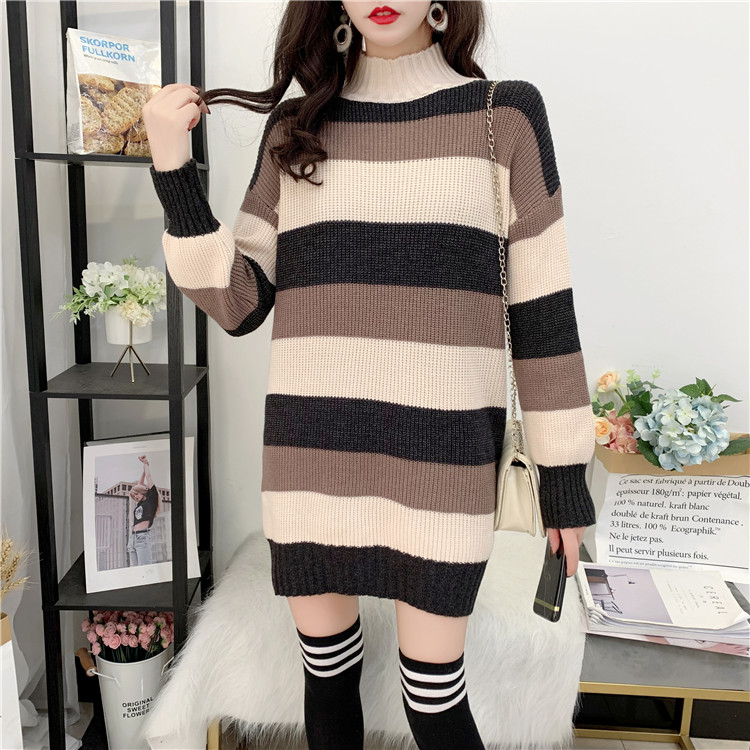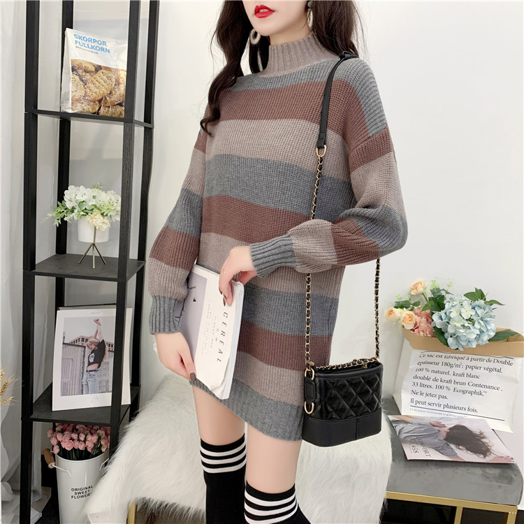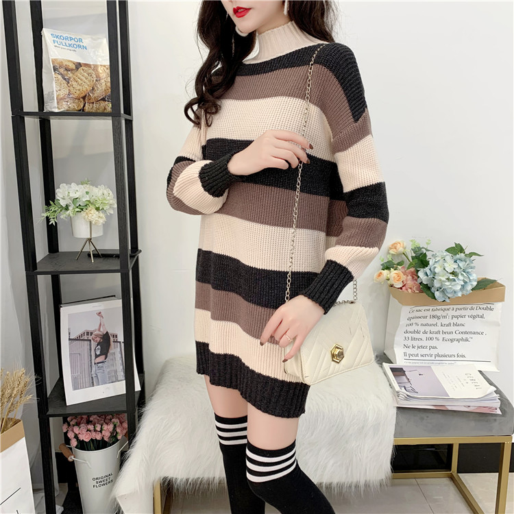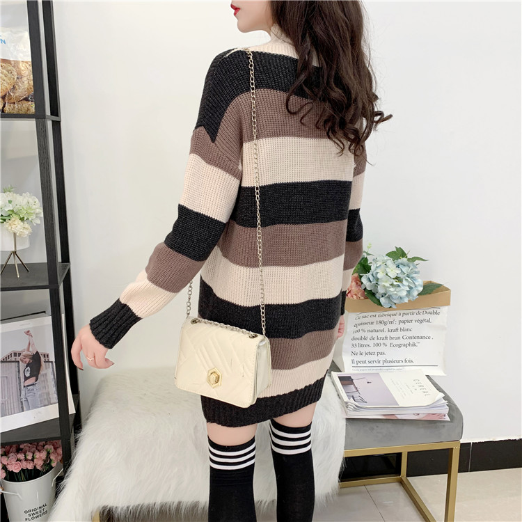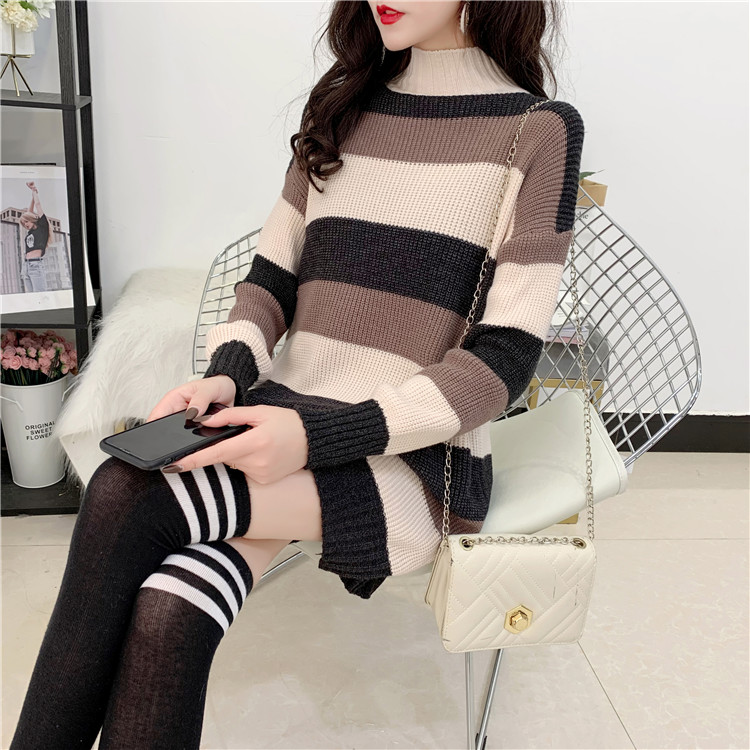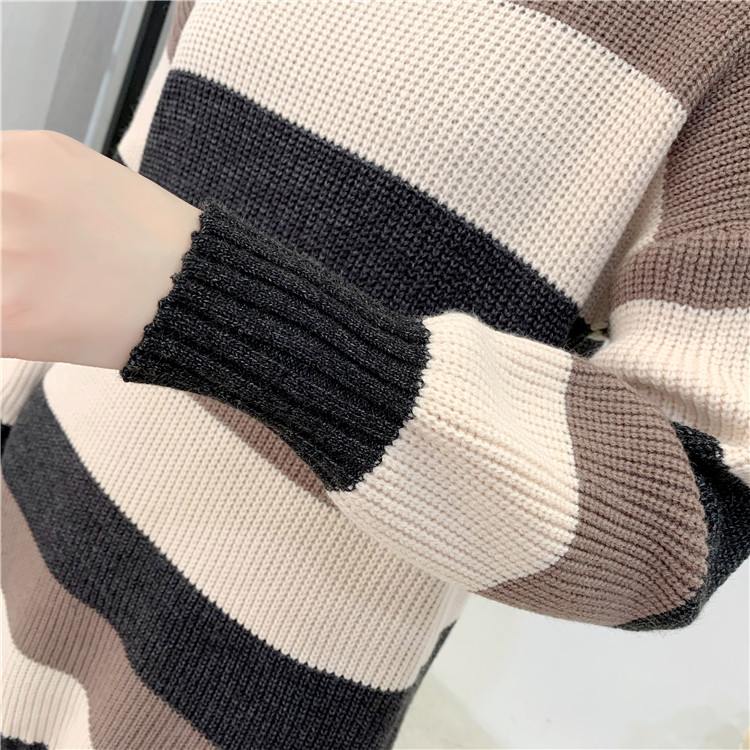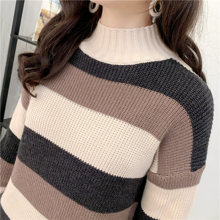 半高领毛衣女套头2019秋冬新款针织衫条纹宽松慵懒风ins超火上衣