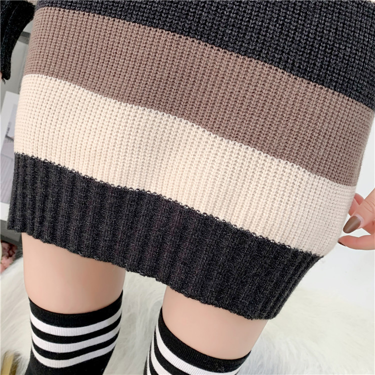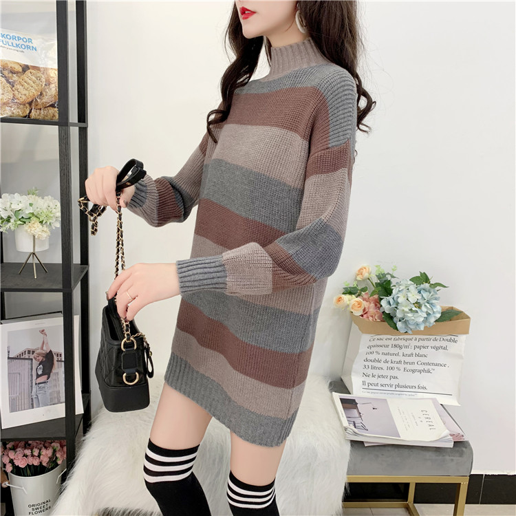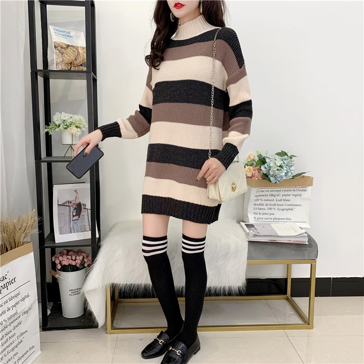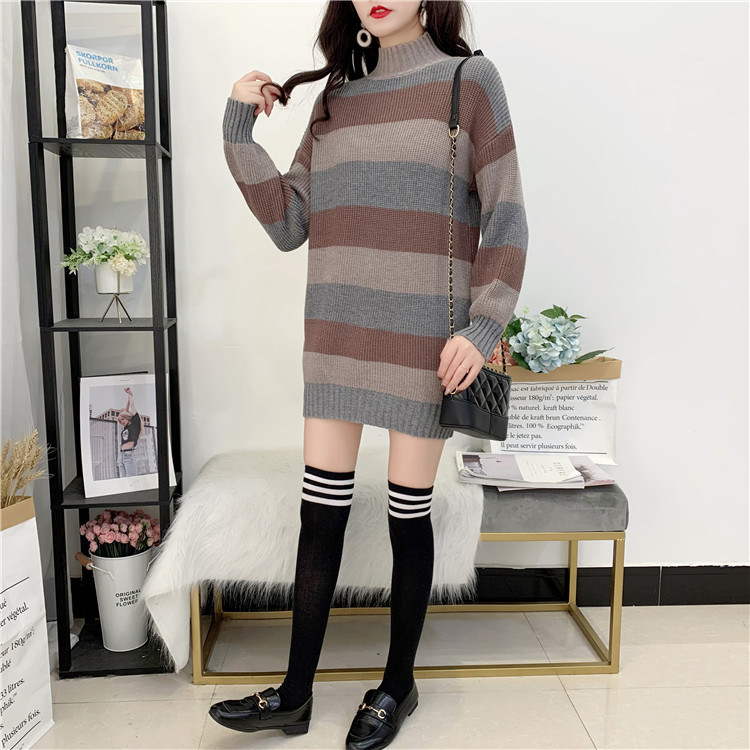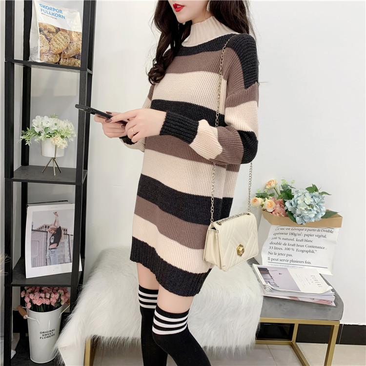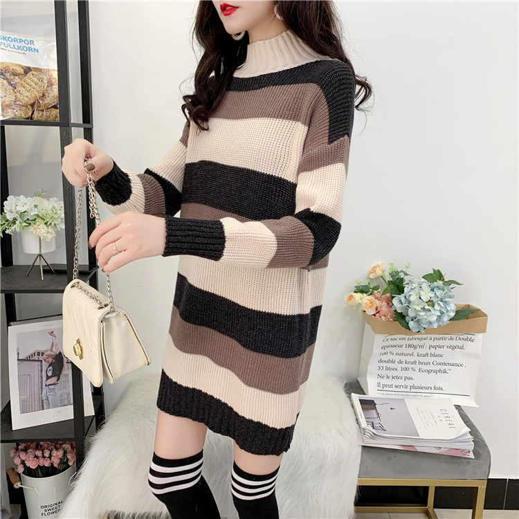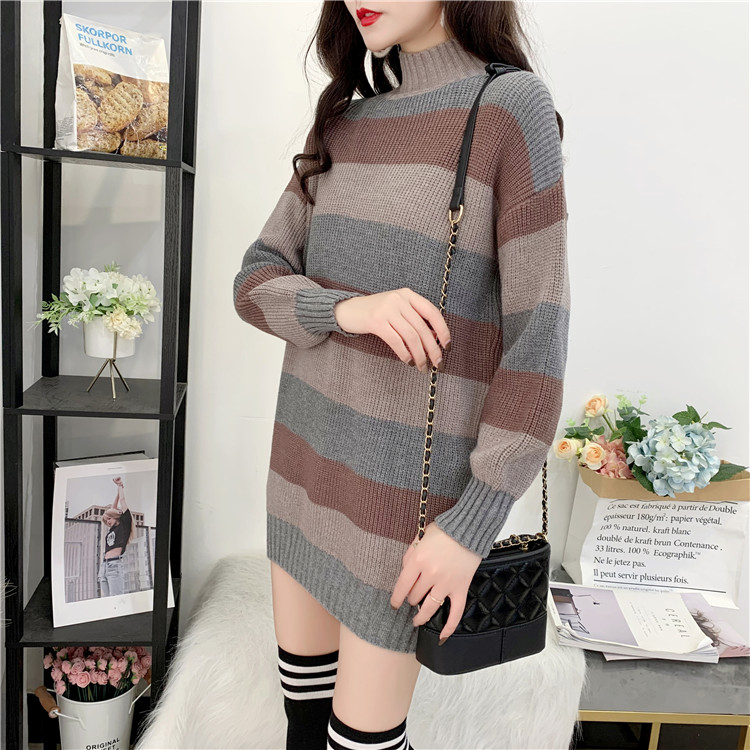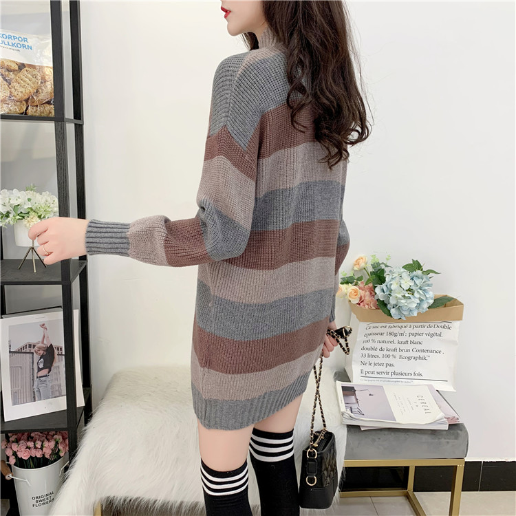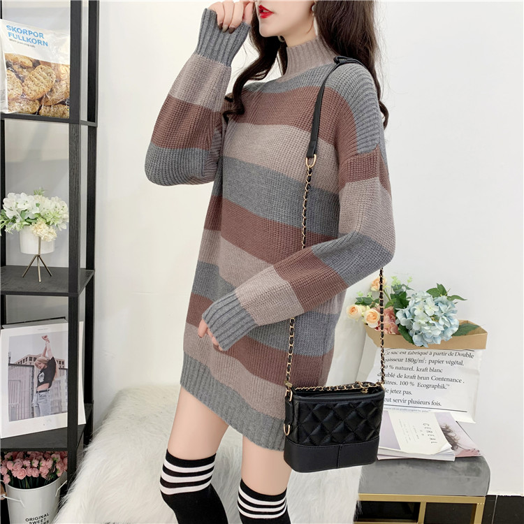 半高领毛衣女套头2019秋冬新款针织衫条纹宽松慵懒风ins超火上衣