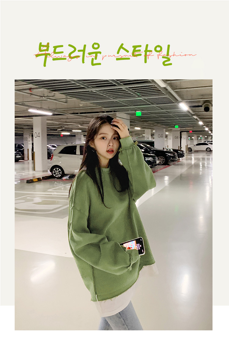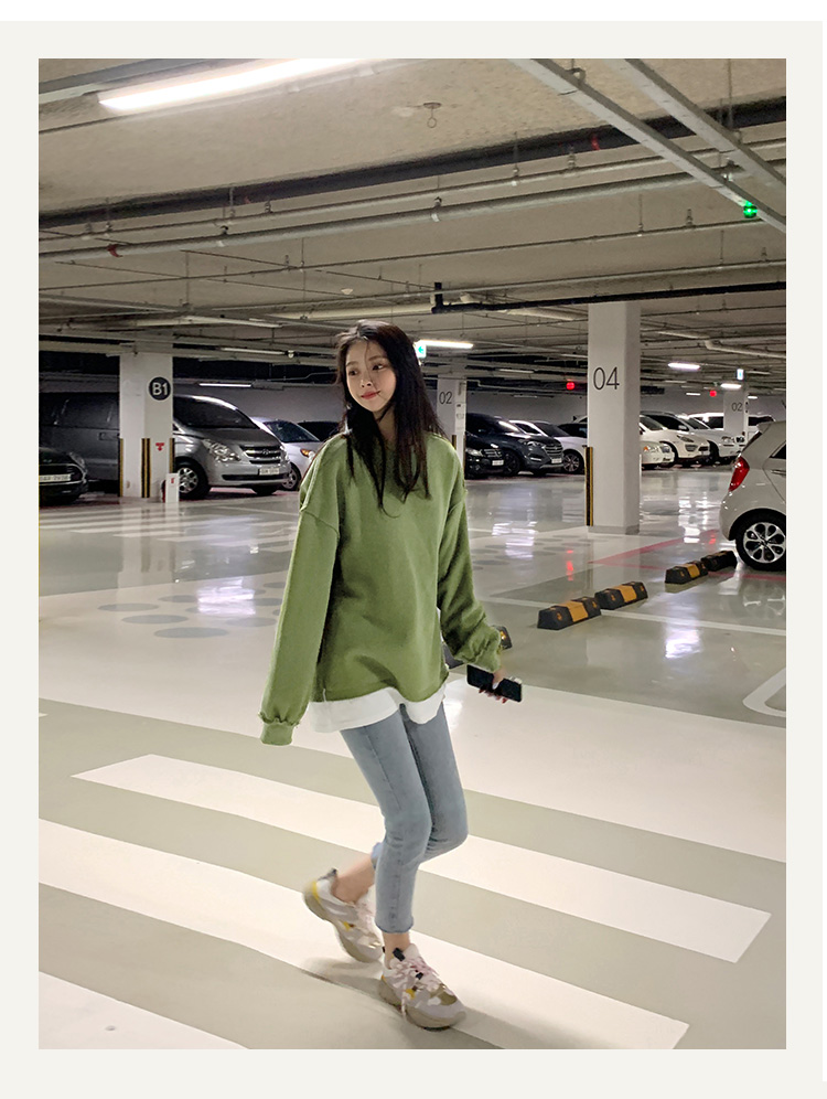 韩都衣舍2019秋冬新款牛油果绿色假两件网红加绒加厚大版卫衣女潮