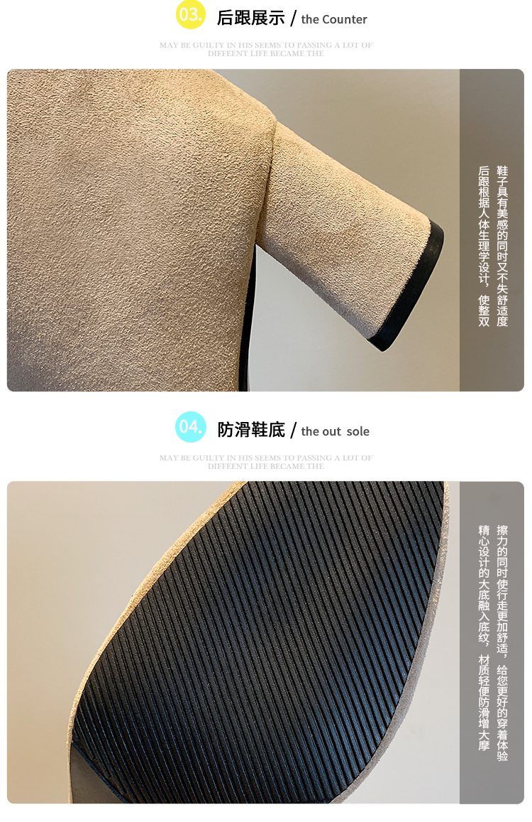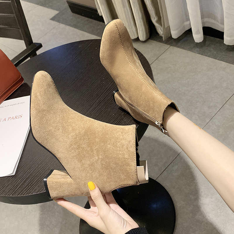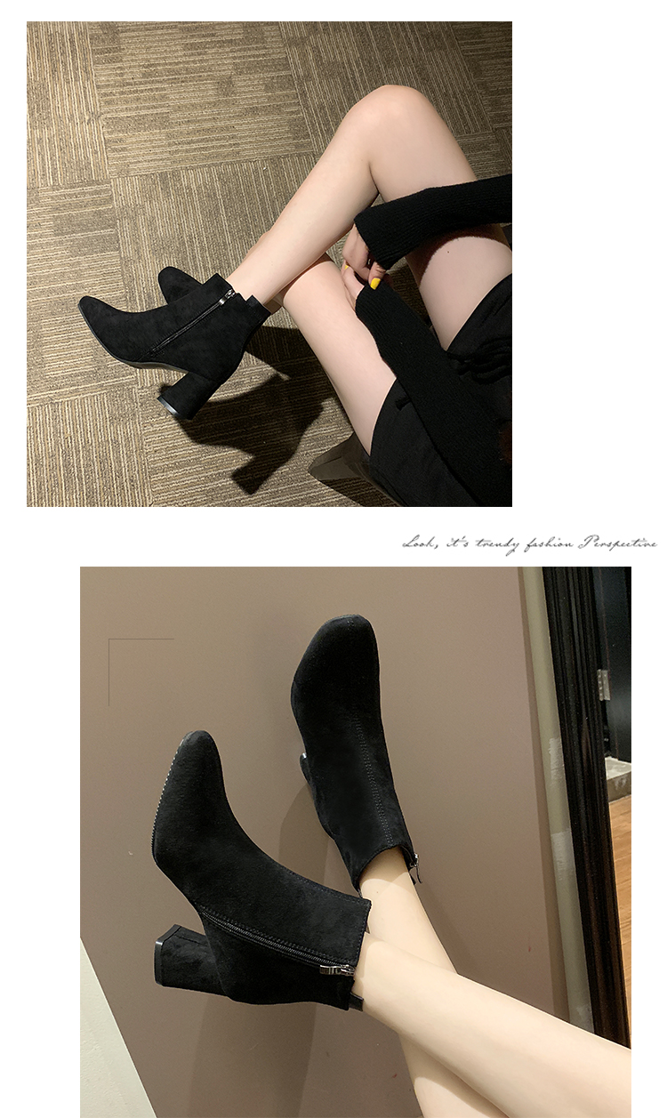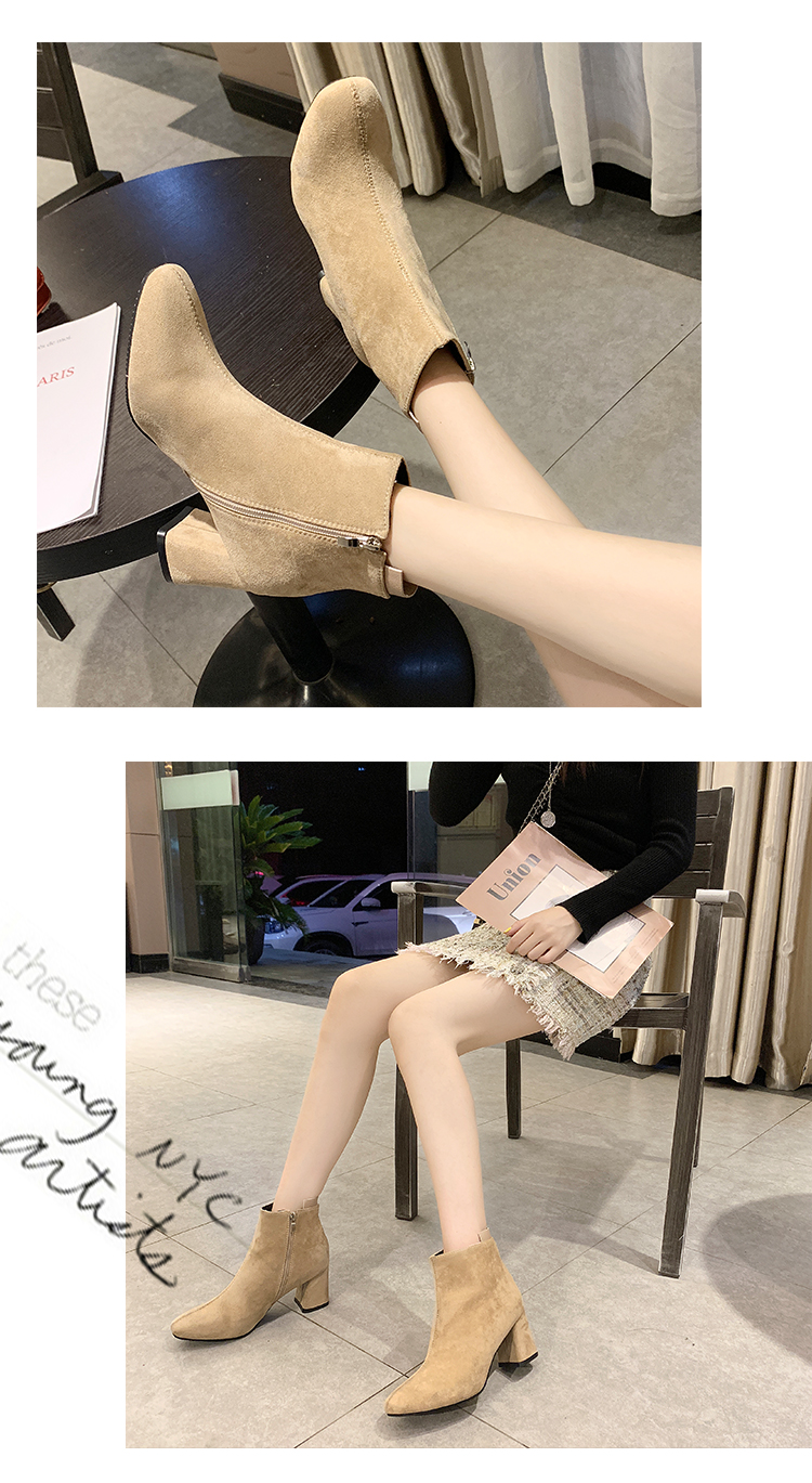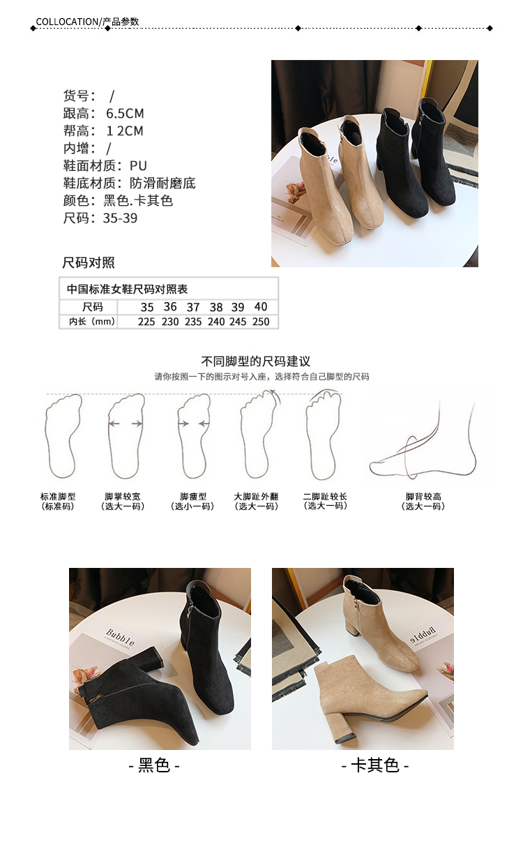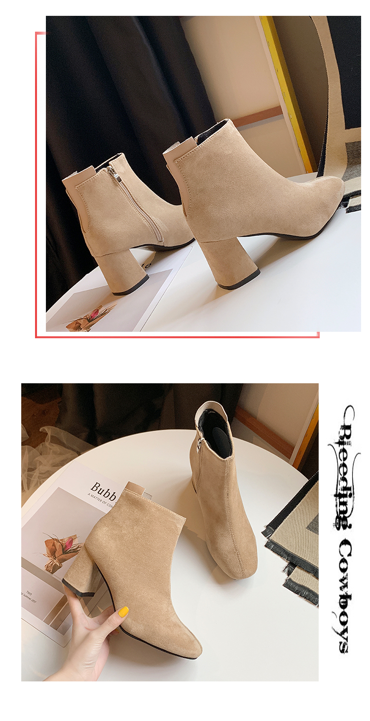 秋冬季新款方头女短靴粗跟中跟鞋韩版百搭马丁靴绒面高跟女靴子