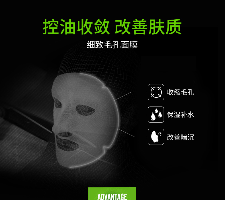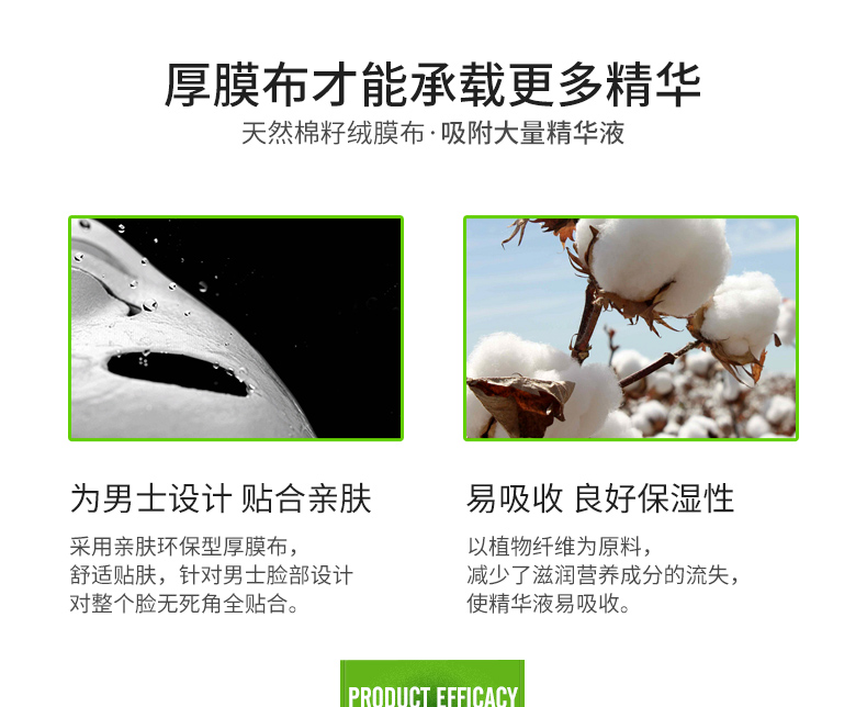 高端男士面膜,萃取天然植物精华,添加透明质酸,升级天丝膜布,3D剪裁,适合男士脸型,以黑焕白,提亮肤色,淡化痘印,收缩毛孔,补水保湿,男神必备。