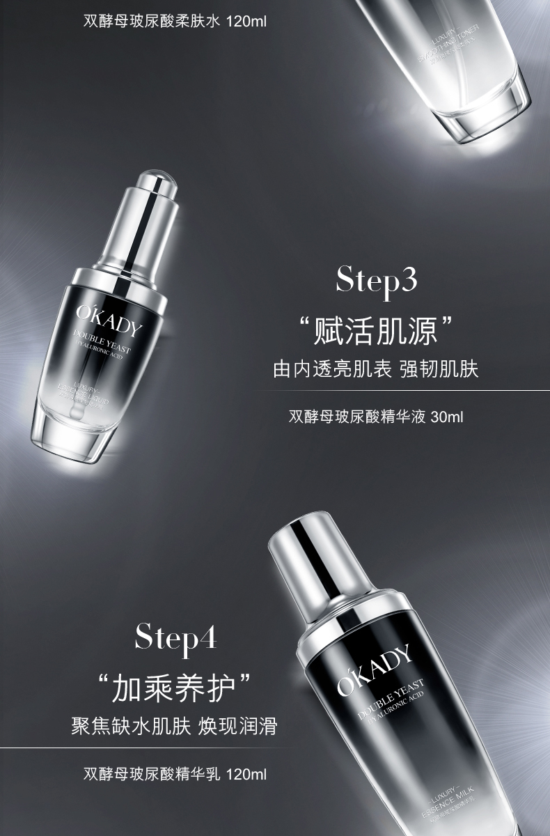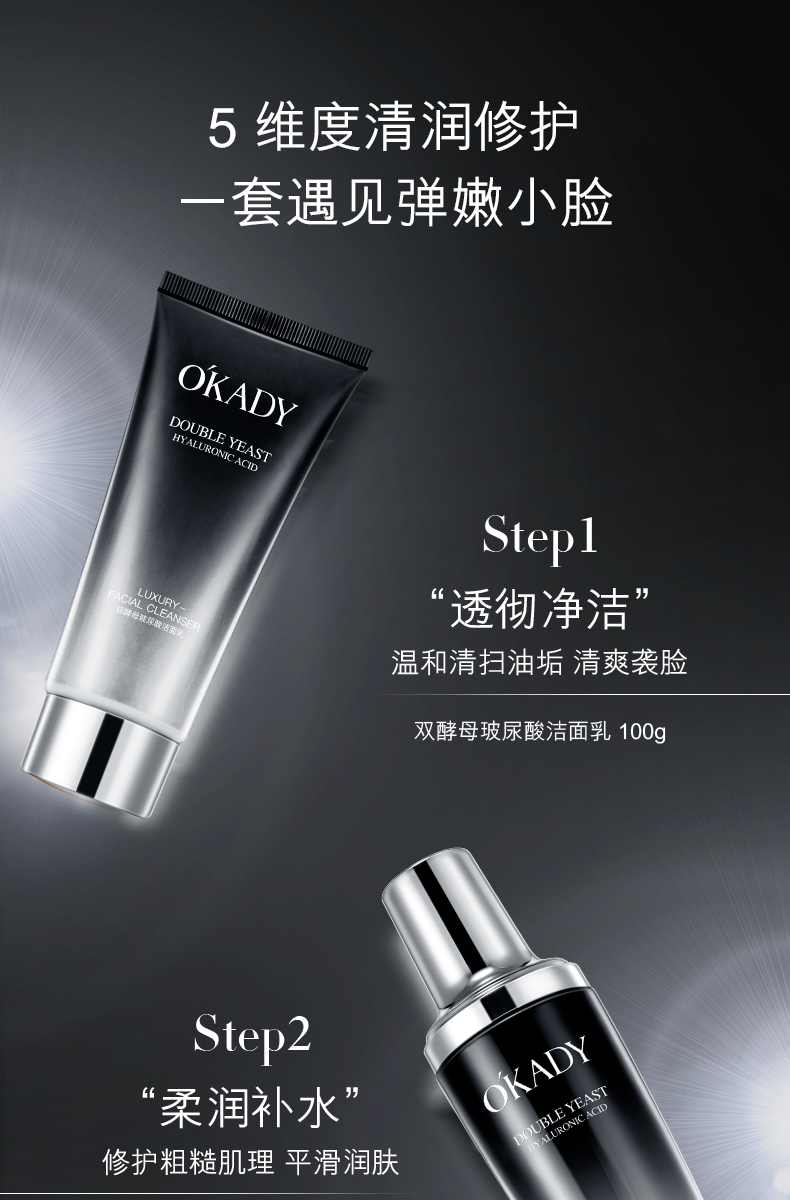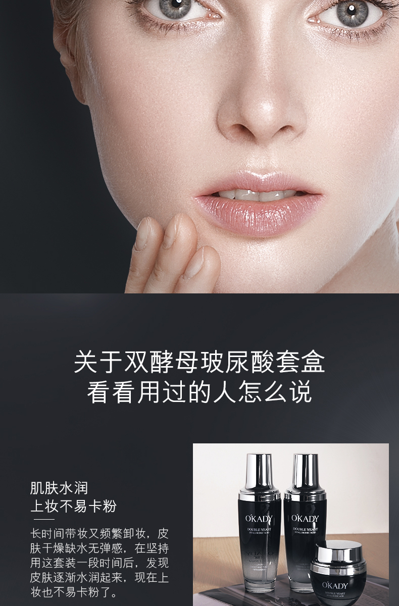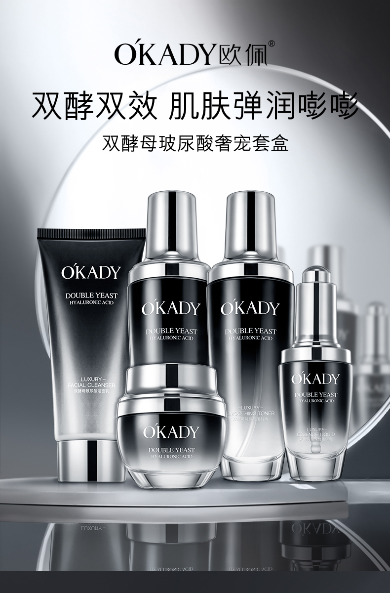 OKADY双酵母玻尿酸奢宠五件套,双分子玻尿酸,瞬效补水保湿,肌肤畅快呼吸。精华液+乳液+爽肤水一套齐全!