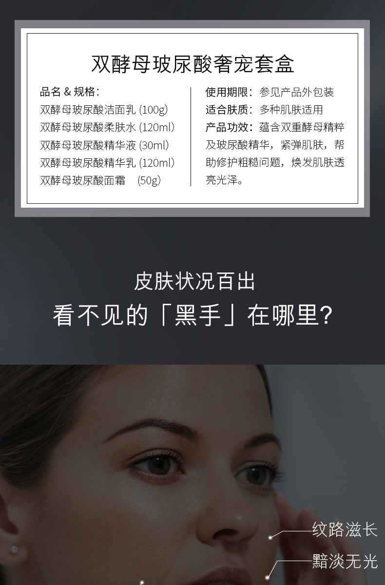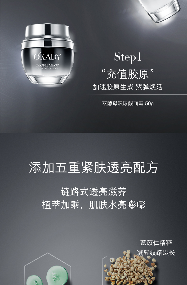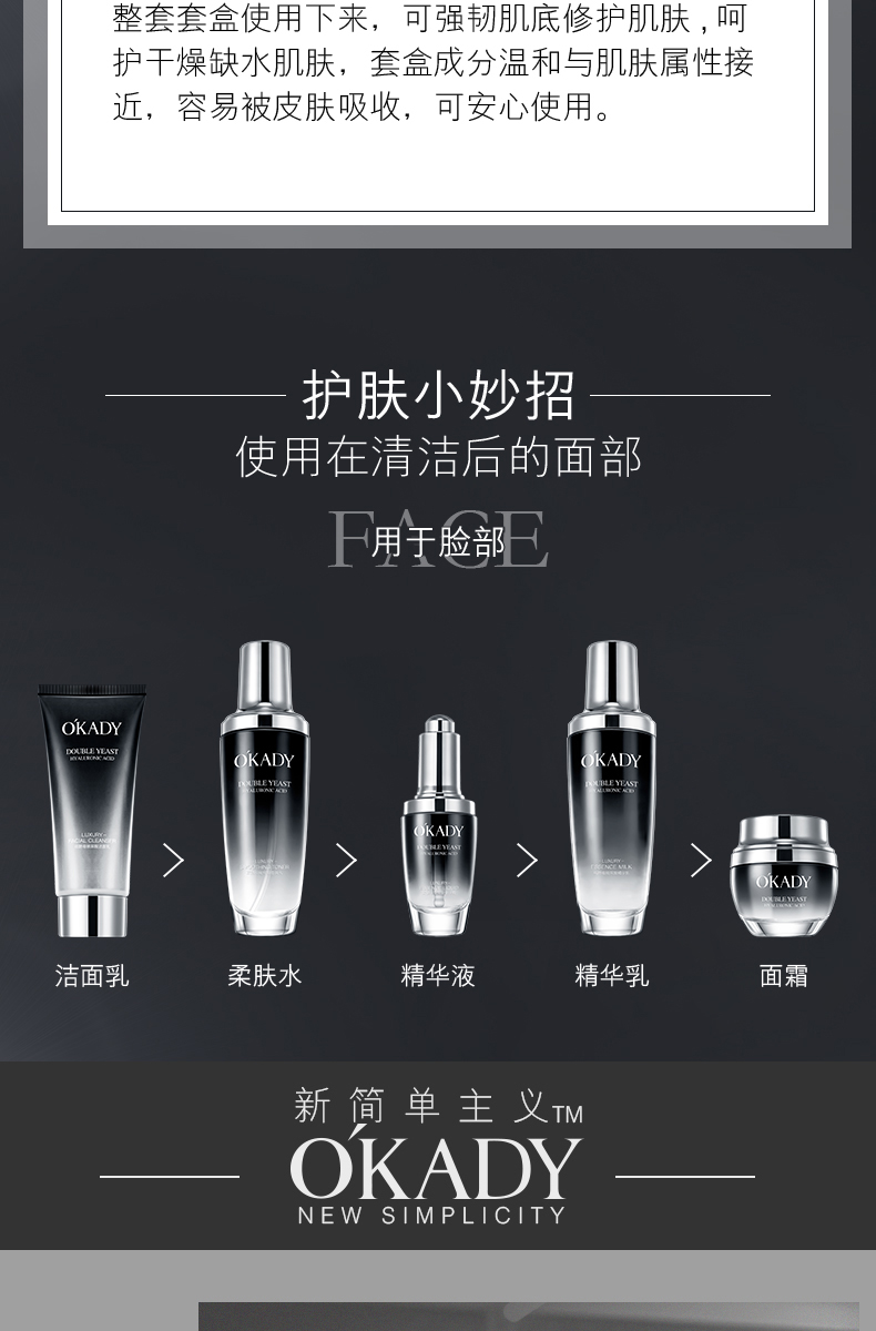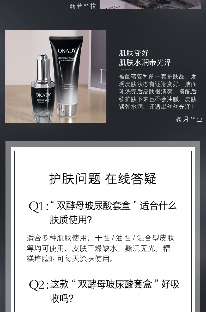 OKADY双酵母玻尿酸奢宠五件套,双分子玻尿酸,瞬效补水保湿,肌肤畅快呼吸。精华液+乳液+爽肤水一套齐全!