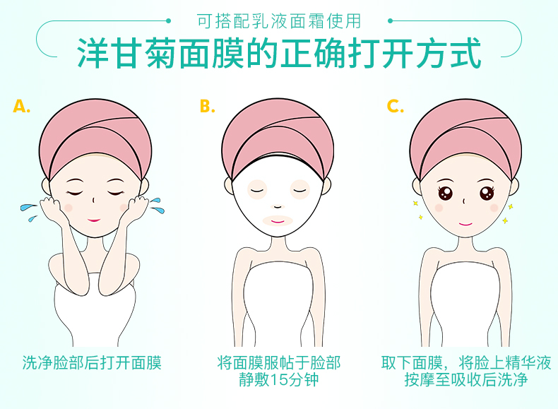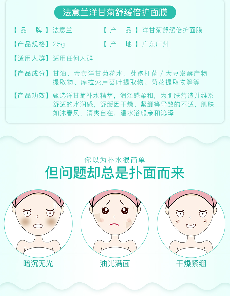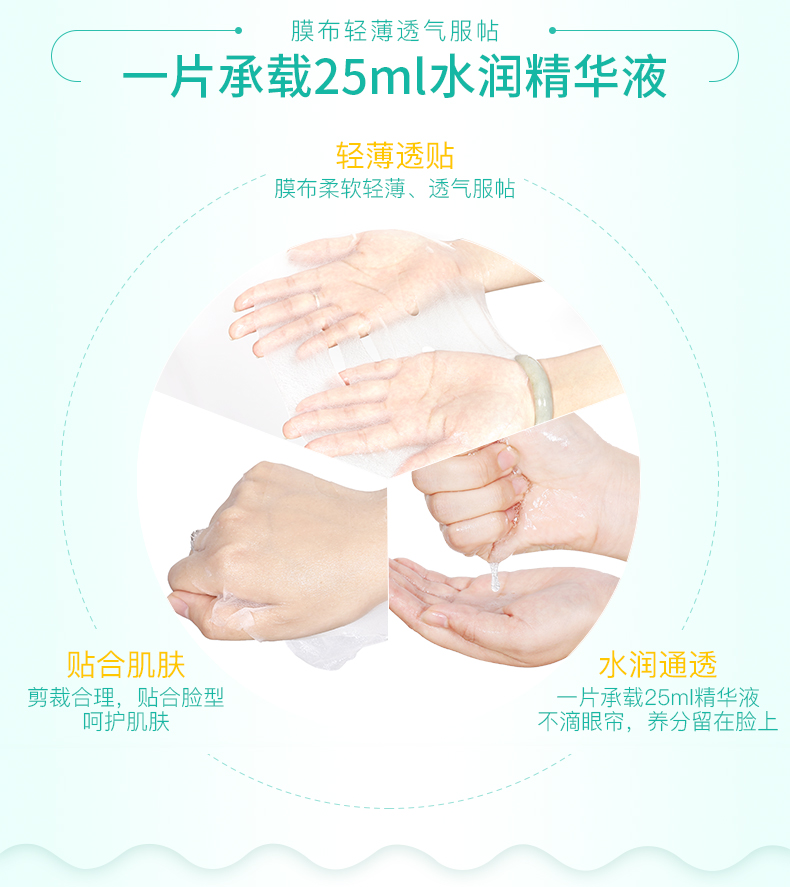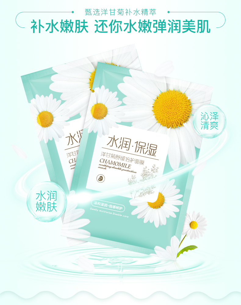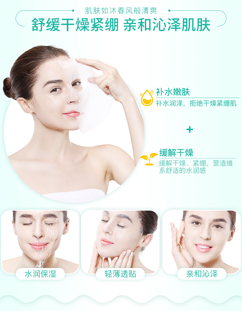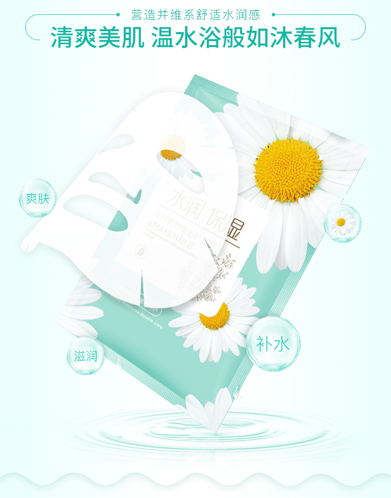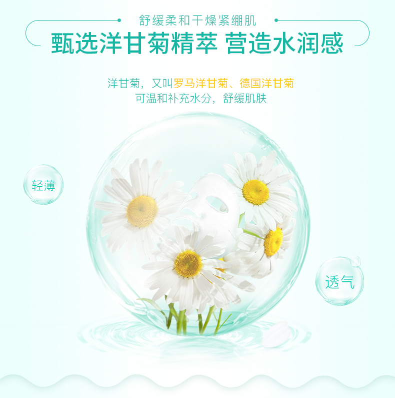 植物洋甘菊纯露爽肤面膜,补水保湿,清爽控油,滋润锁水,舒缓修护敏感肌肤,补充肌肤营养,收缩毛孔,弹力柔软纤维布,更加服帖,敷一敷会遇见更美丽的自己!