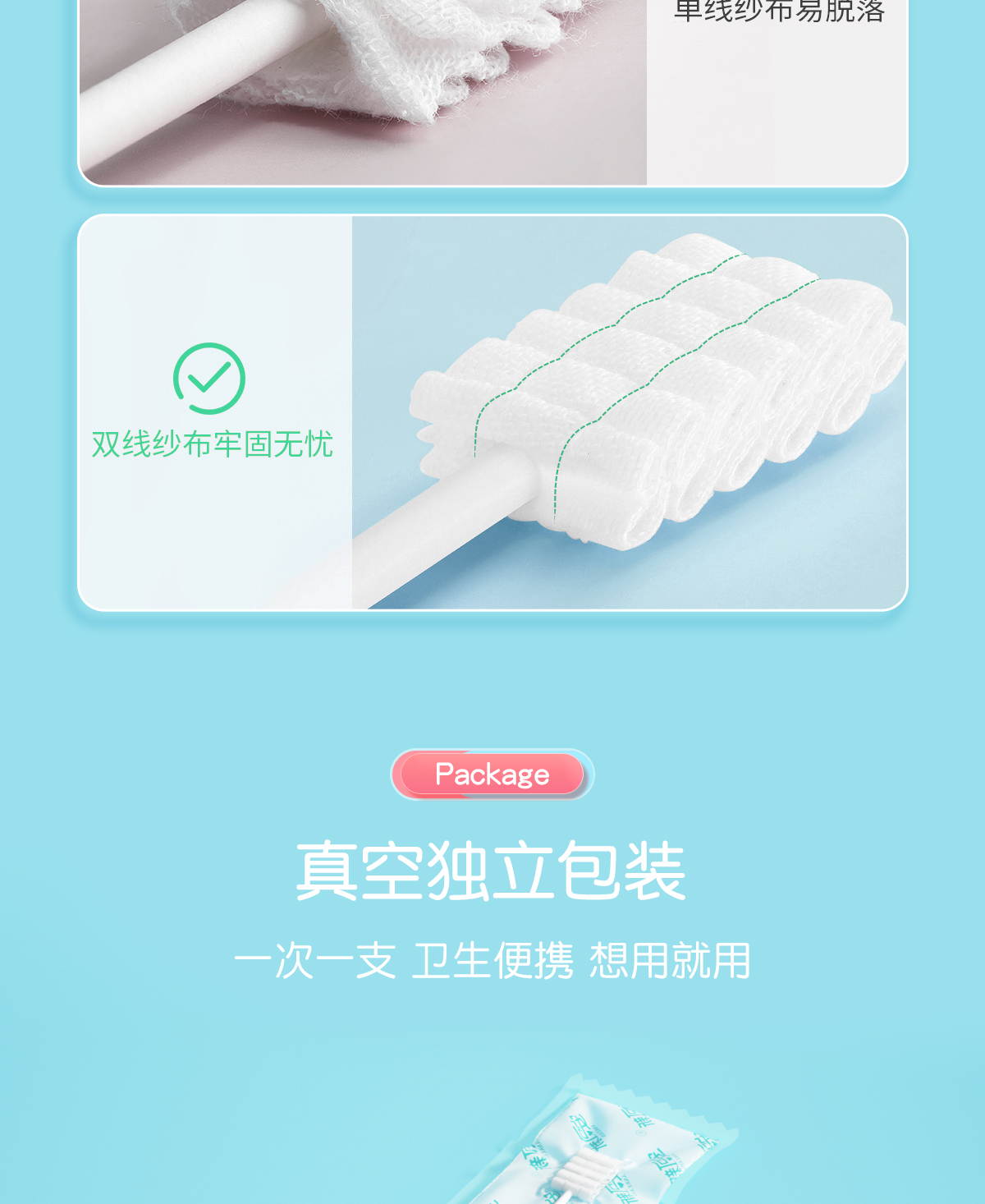 独立真空包装,婴幼儿专用,安全质量,脱脂纱布,简单易用,有效清洁,安全环保。婴幼儿长期不清洁口腔长大后会造成口臭,牙齿畸形,溃烂等问题,爱子女从口腔清洁开始。