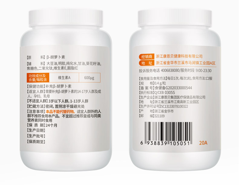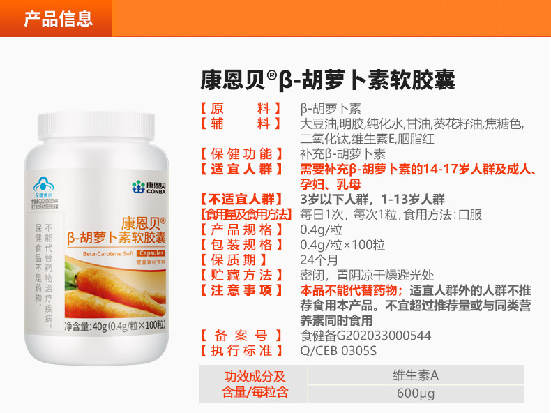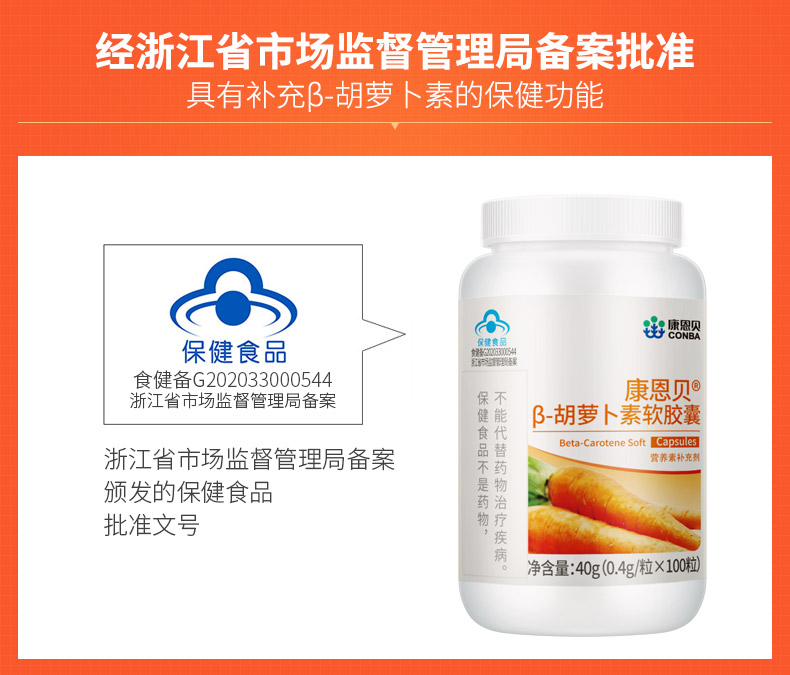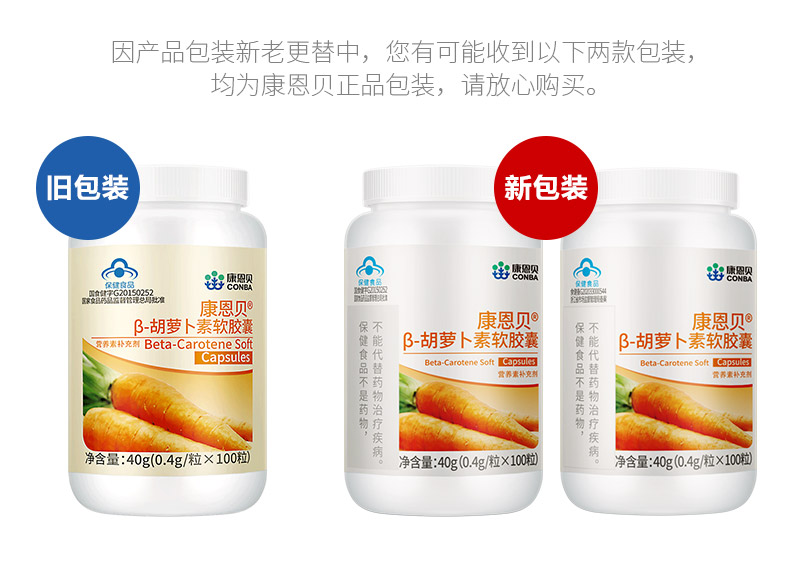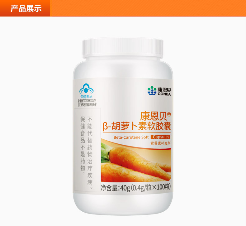 【官方授权店】实发2瓶!康恩贝β-胡萝卜素软胶囊,转为维生素A,每瓶100粒装,共200粒,超值划算