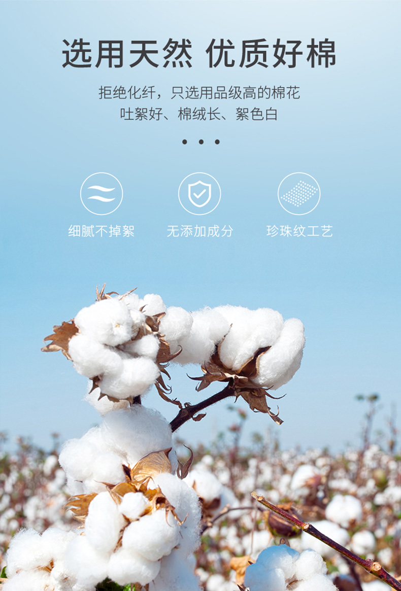 选用品级高的棉花制成,细腻不掉絮,如云朵般柔软触感,用过便会爱上。温和亲肤,强力吸水,N种用途,通通帮你搞定。