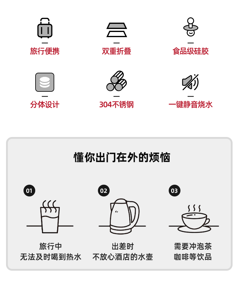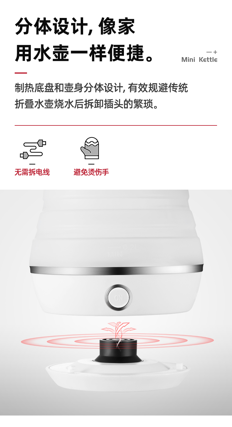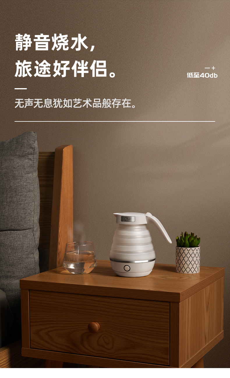 出差旅游住酒店,带上折叠电热水壶,拍扁就带走,小巧不占包6大功能集于一身,可折叠壶身;奶嘴级硅胶;304加热底盘;分离式电源线;智能调温;防止干烧;大容量,让家里人喝安心健康的水