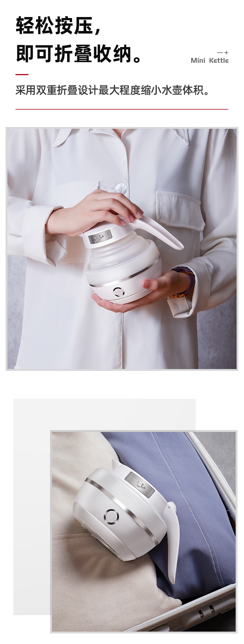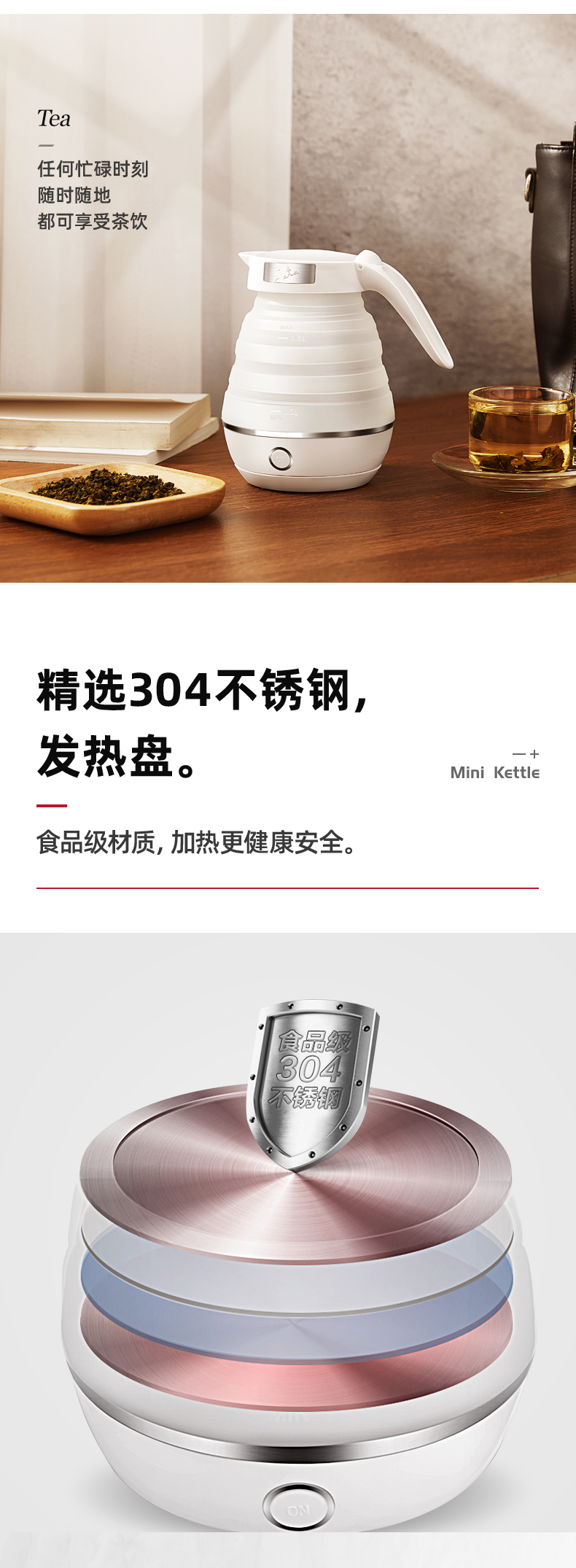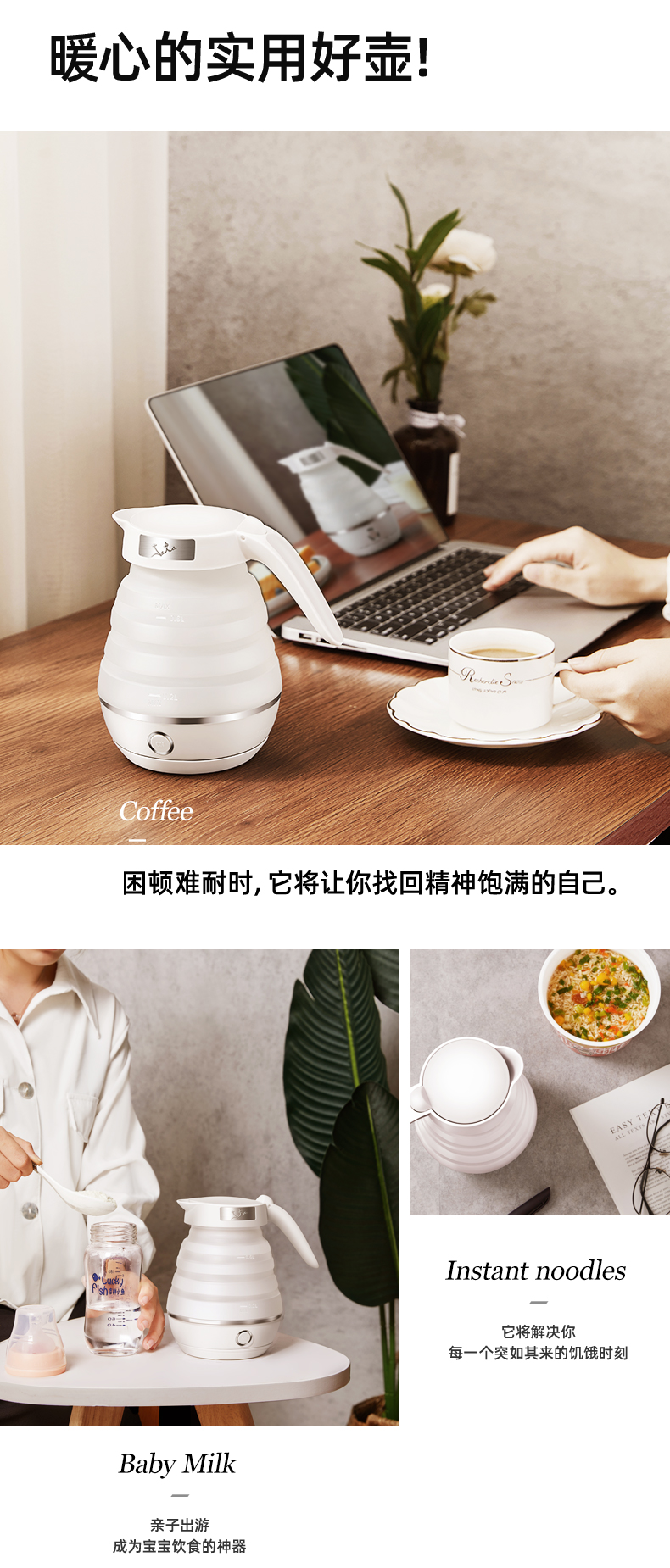 出差旅游住酒店,带上折叠电热水壶,拍扁就带走,小巧不占包6大功能集于一身,可折叠壶身;奶嘴级硅胶;304加热底盘;分离式电源线;智能调温;防止干烧;大容量,让家里人喝安心健康的水