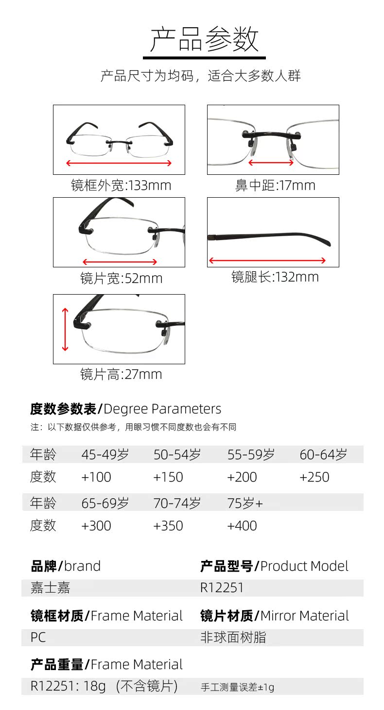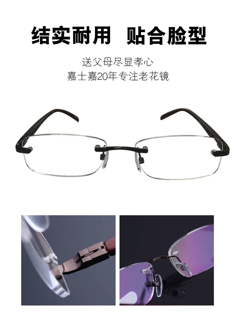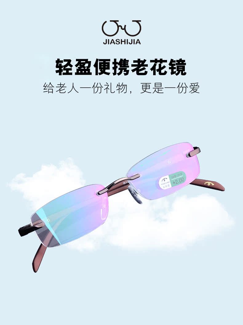 【嘉士嘉】无框金属老花镜,无框钻石切边老花镜,款式时尚优雅,让爸妈更潮更年轻,纤韧镜腿,舒适不夹脸,轻质体验!