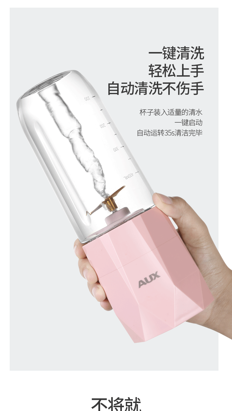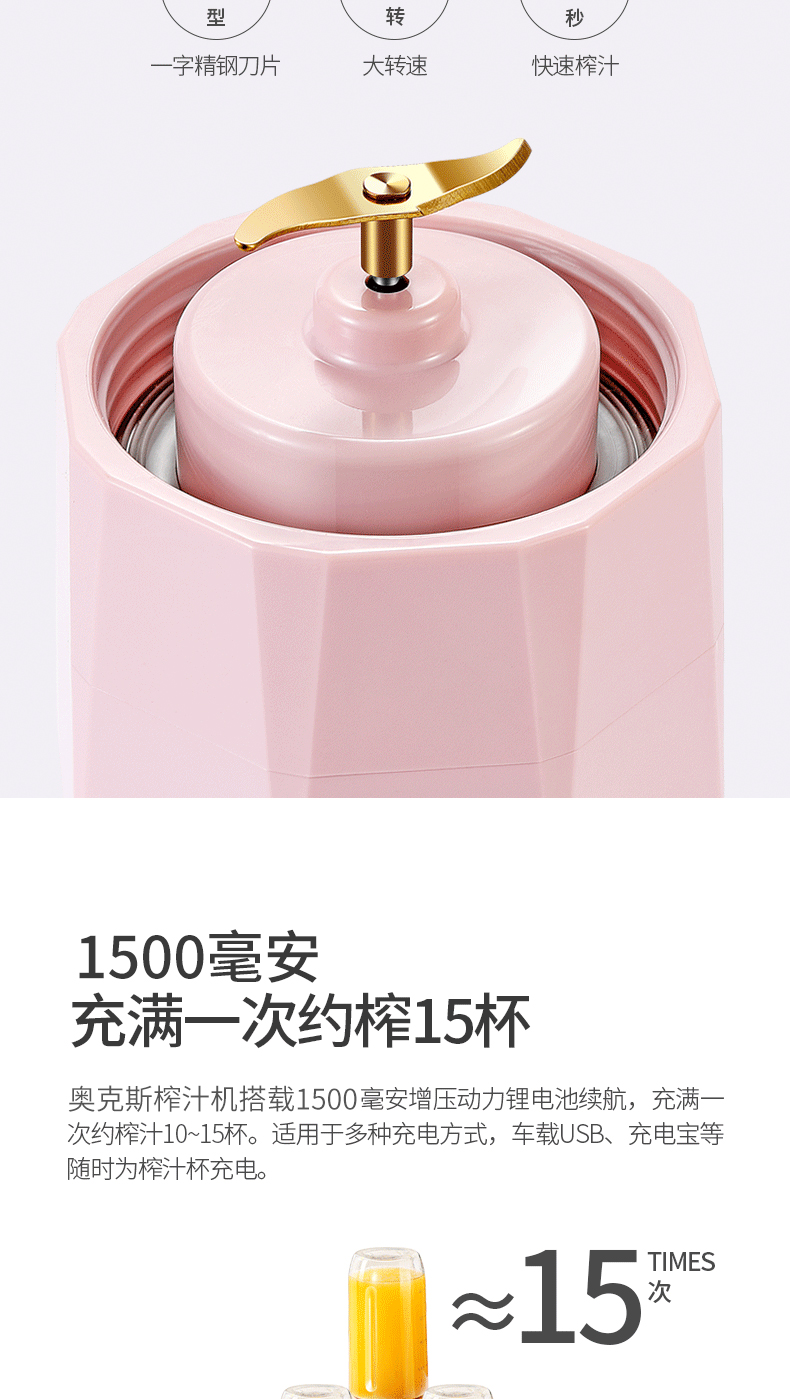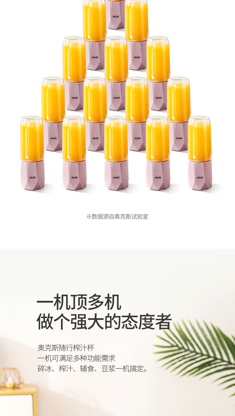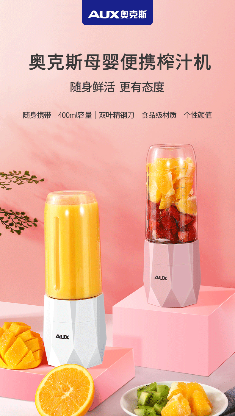 【奥克斯】新款榨汁机菱形钻石切割设计,采用进口Tritan婴儿奶瓶材质,400毫升大容量,超大电池,强劲动力,双也镀钛钢刀头,5秒快速榨汁,纯真细腻,一键自动清洗,辅食,碎冰,搅拌,豆浆,制奶昔一机搞