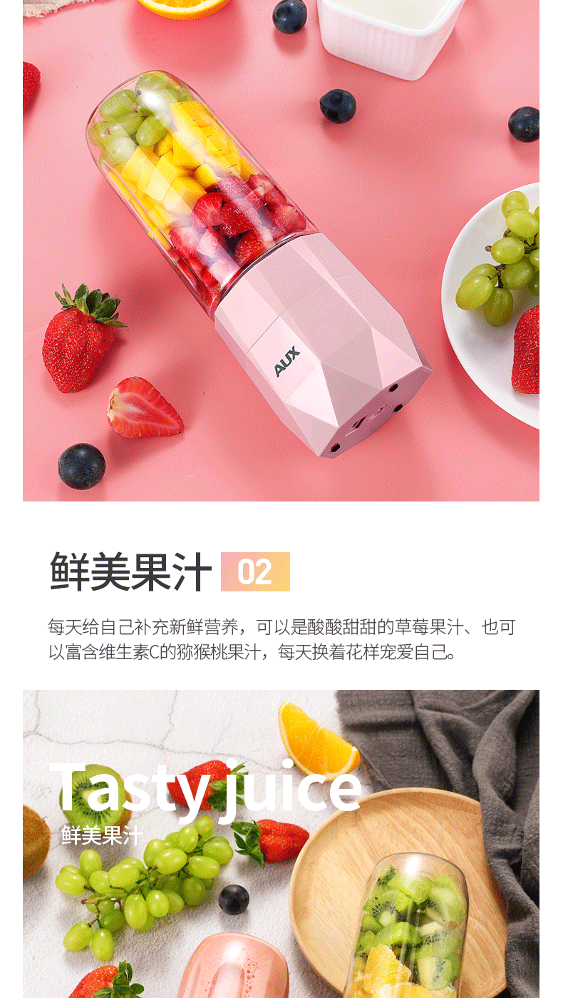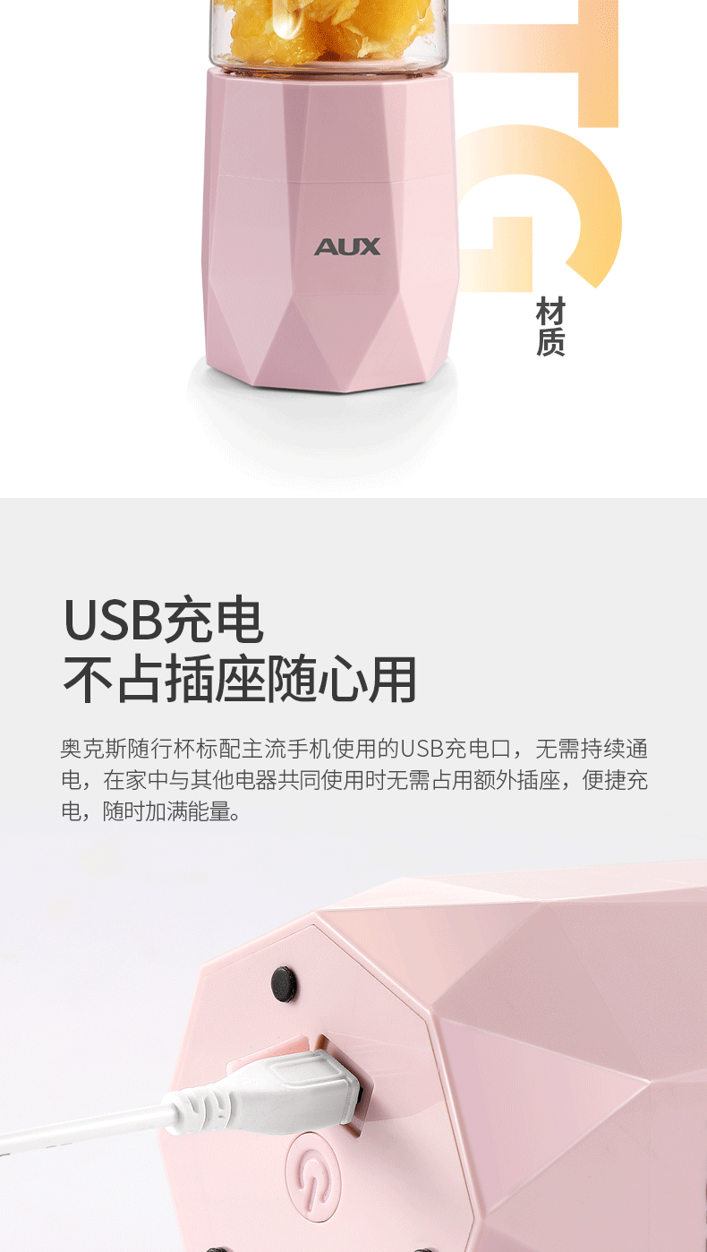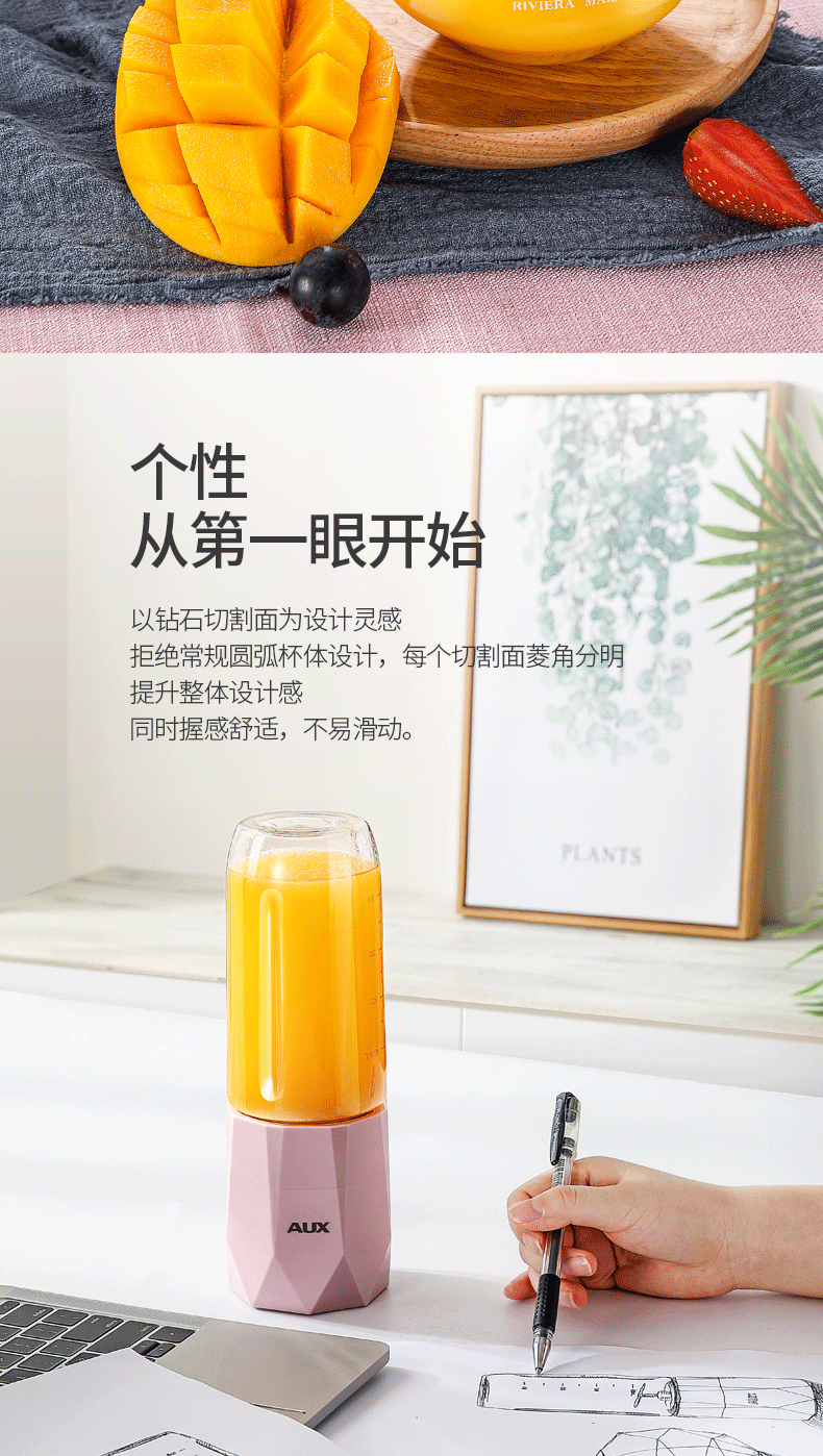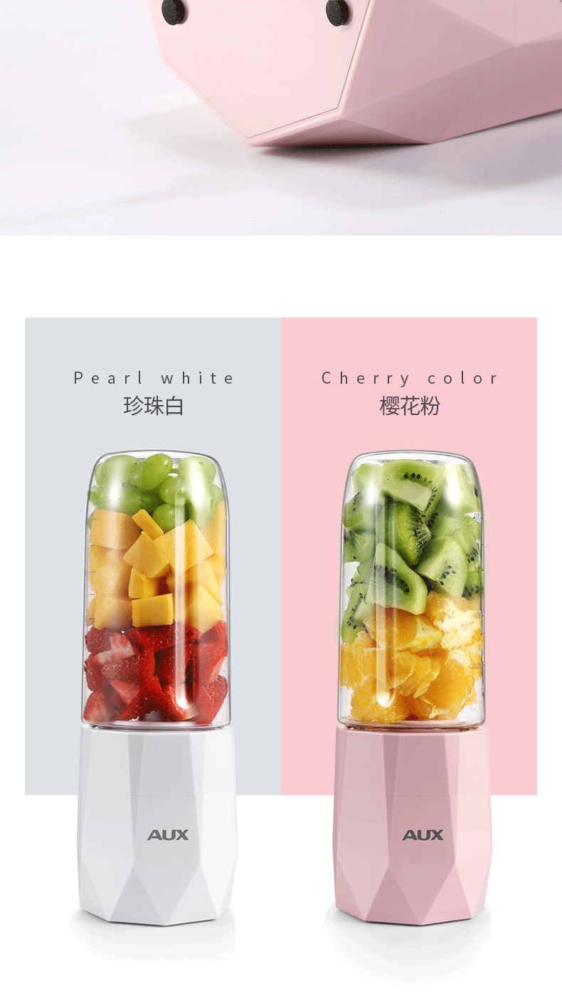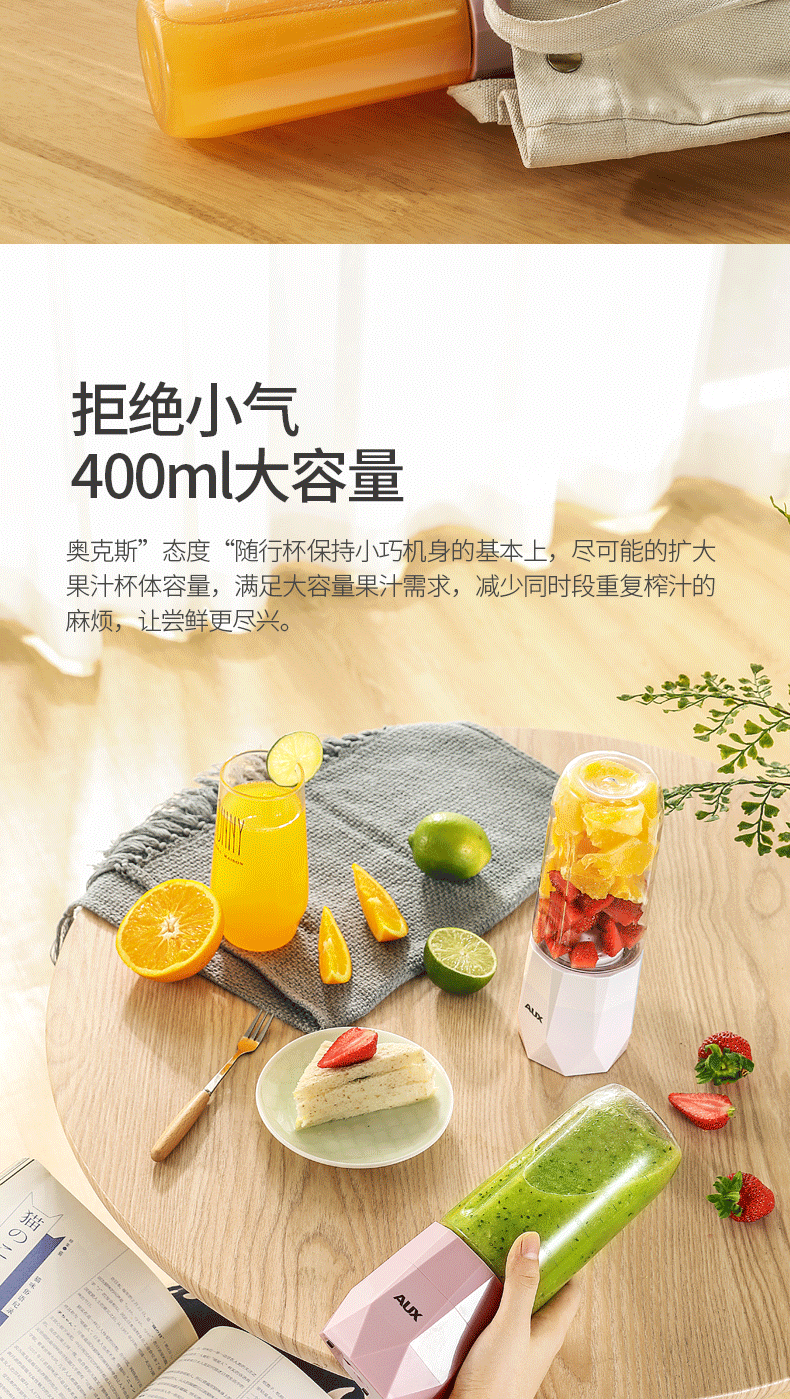 【奥克斯】新款榨汁机菱形钻石切割设计,采用进口Tritan婴儿奶瓶材质,400毫升大容量,超大电池,强劲动力,双也镀钛钢刀头,5秒快速榨汁,纯真细腻,一键自动清洗,辅食,碎冰,搅拌,豆浆,制奶昔一机搞