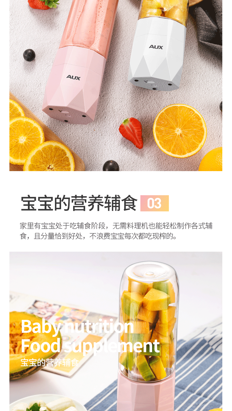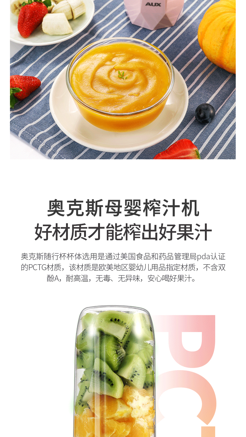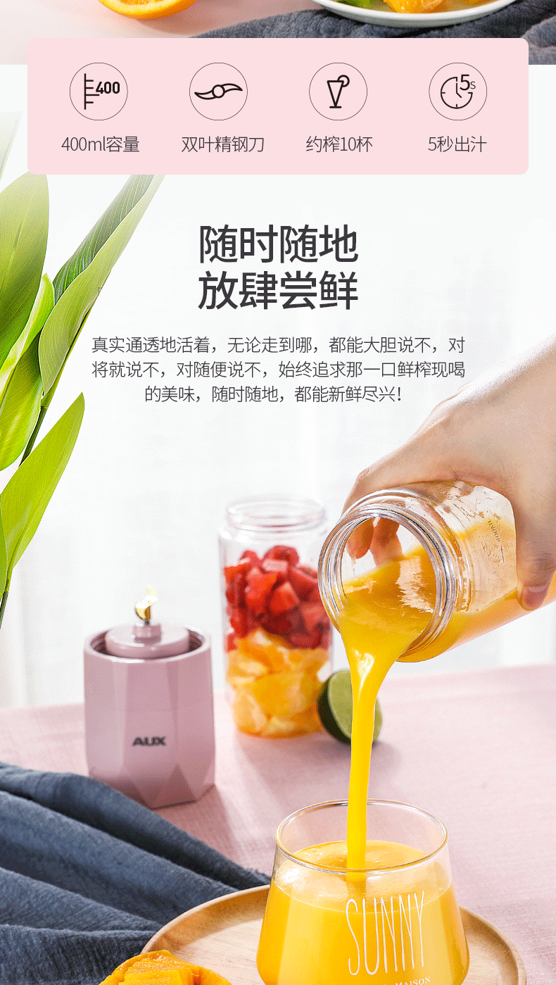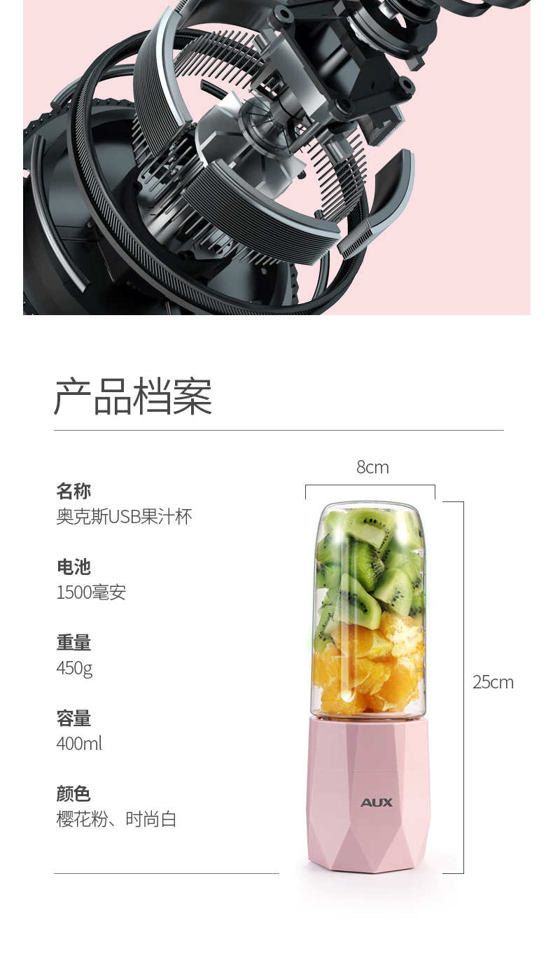 【奥克斯】新款榨汁机菱形钻石切割设计,采用进口Tritan婴儿奶瓶材质,400毫升大容量,超大电池,强劲动力,双也镀钛钢刀头,5秒快速榨汁,纯真细腻,一键自动清洗,辅食,碎冰,搅拌,豆浆,制奶昔一机搞