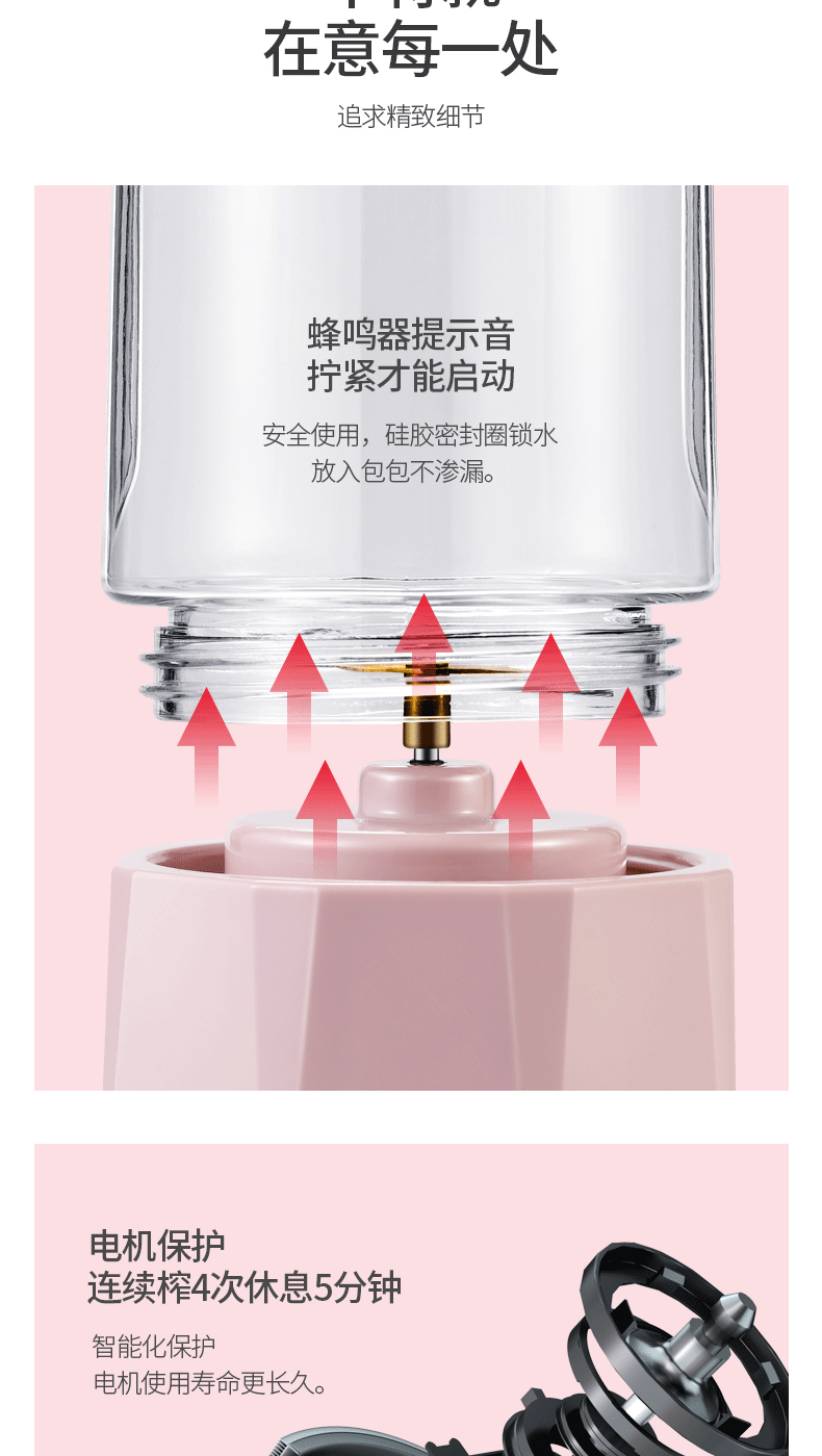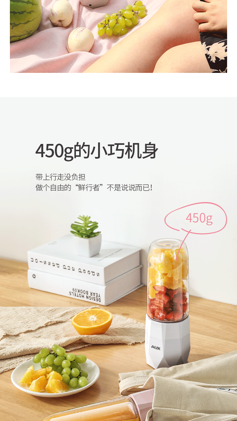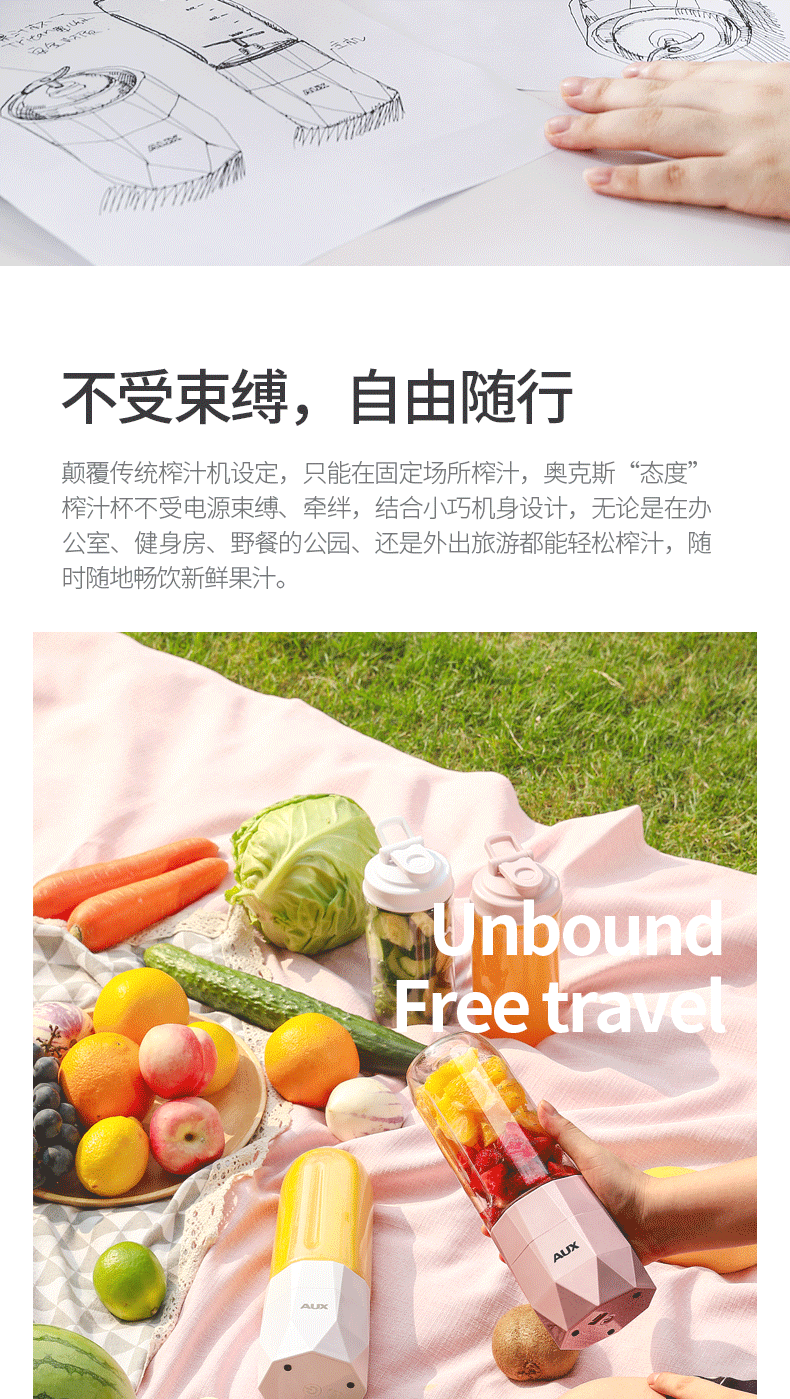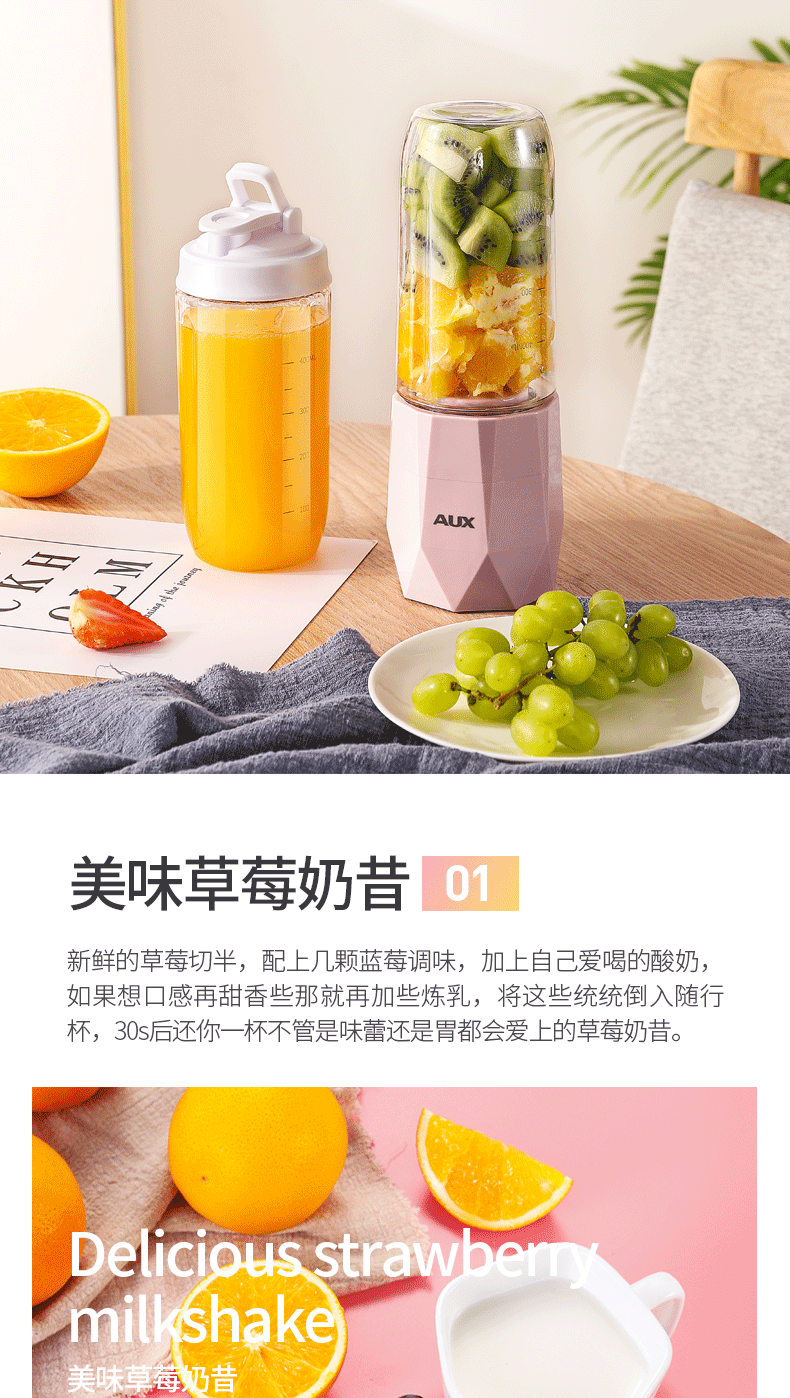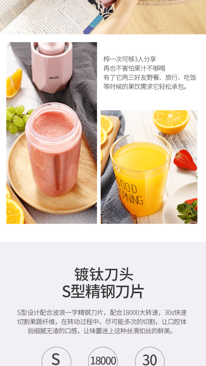 【奥克斯】新款榨汁机菱形钻石切割设计,采用进口Tritan婴儿奶瓶材质,400毫升大容量,超大电池,强劲动力,双也镀钛钢刀头,5秒快速榨汁,纯真细腻,一键自动清洗,辅食,碎冰,搅拌,豆浆,制奶昔一机搞