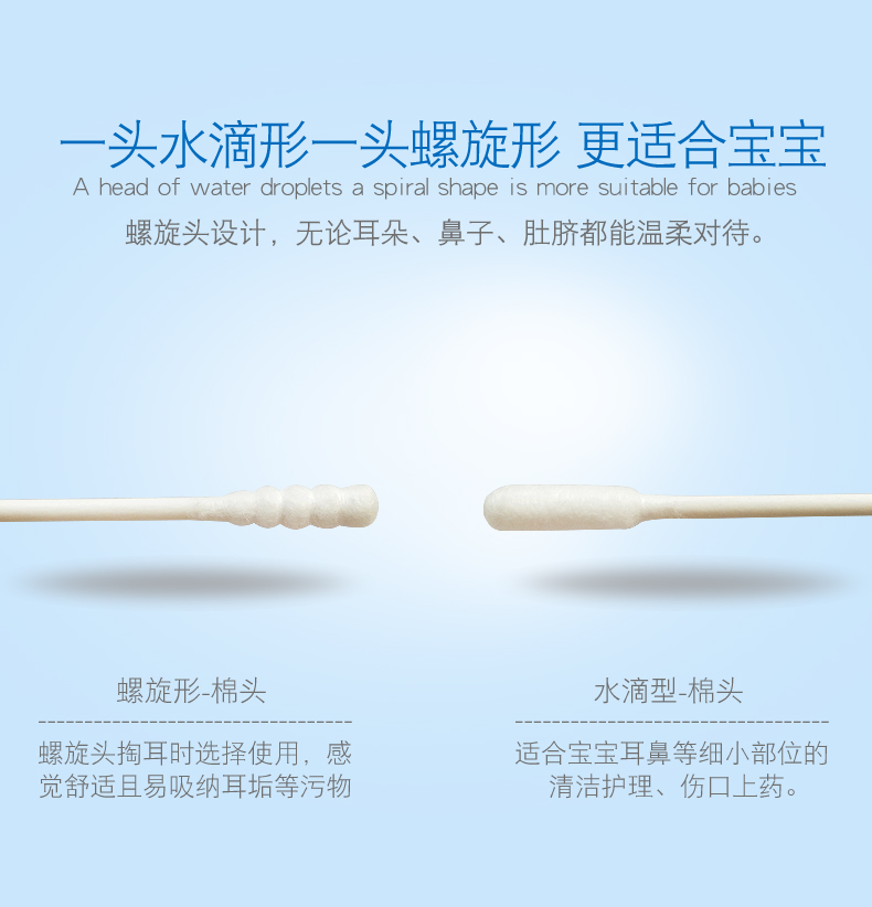 宝宝儿童专用棉签,纸轴非木棒,不会划伤宝宝娇嫩皮肤,螺旋;圆头双头功能,纯棉棉头舒适容易清洁,不含任何有害物质,健康安全。【赠运费险】