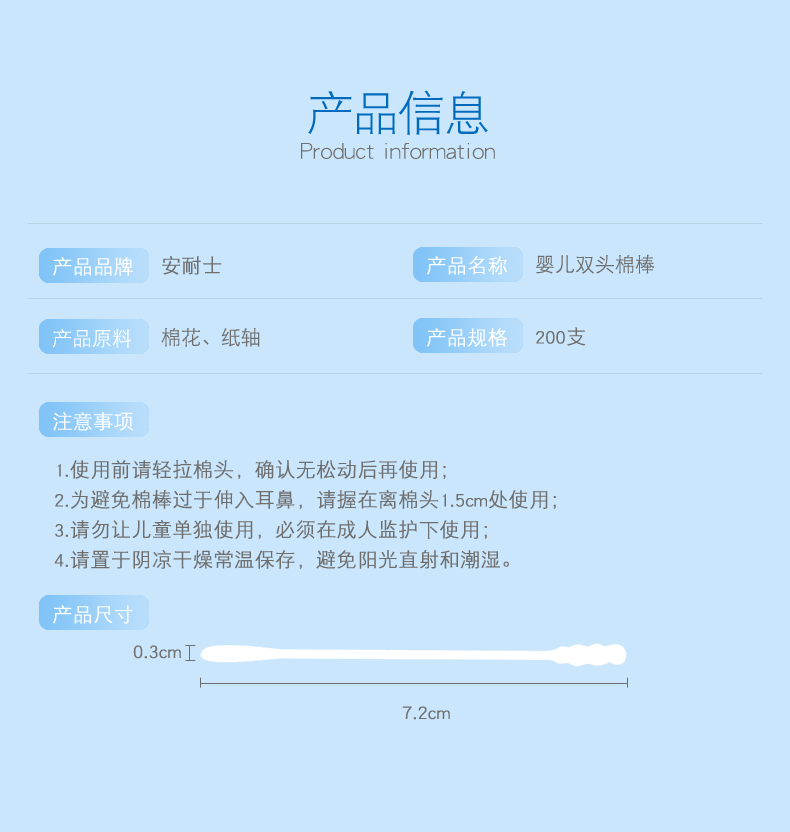 200支安耐士婴儿棉签宝宝专用耳鼻屎螺旋双头婴幼儿新生超细棉棒
