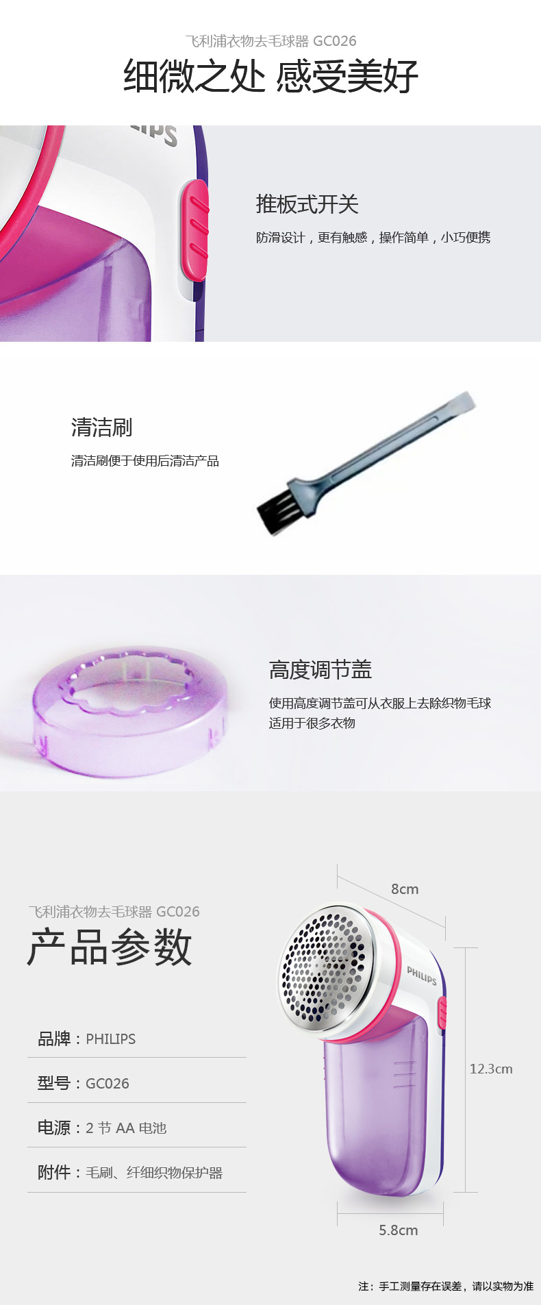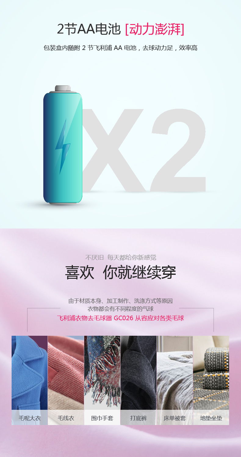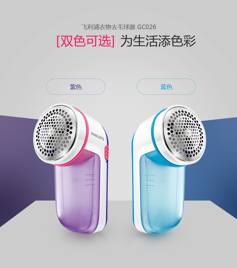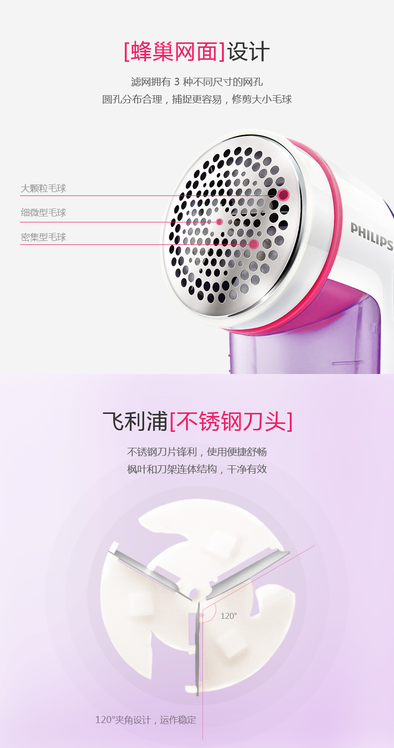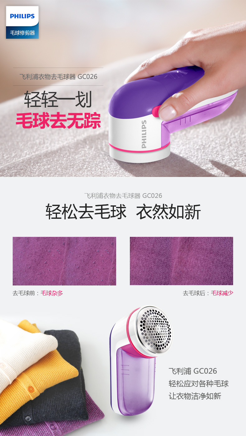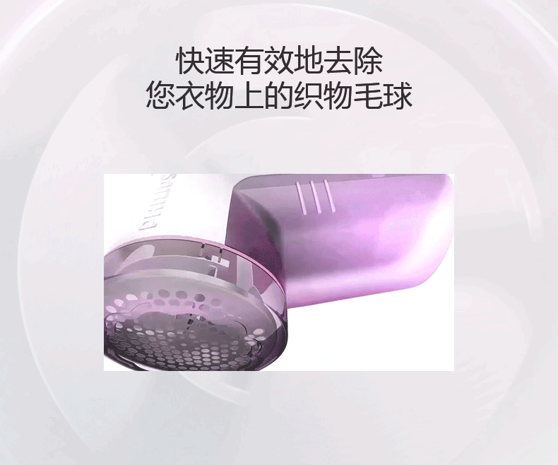 【飞利浦】毛球修剪器,一键开关设计,隐藏式三叶刀头,四叶强劲吸风装置,迅速修剪衣物表面毛球,不伤衣物,让衣物恢复崭新状态。