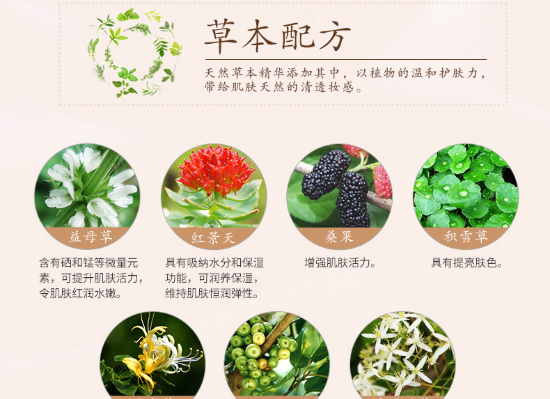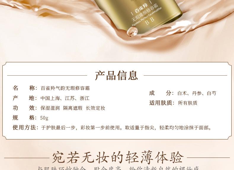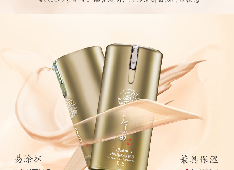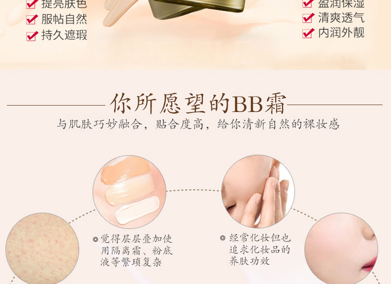 润色滋养,自然裸妆,保湿滋润,隔离遮瑕,持久定妆,提亮肤色,清爽透气,内润外靓,无暇臻颜修容霜,与肌肤巧妙融合,贴合度高,给你清新自然的裸妆感,本草配方,你所愿望的BB霜