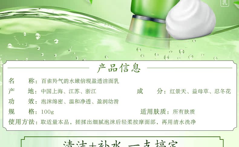 送百雀羚水和面膜,洁面要净透,更要不紧绷,更补水,水润嫩滑,淡淡本草香,告别干燥肌,温和更天然,盈润更细腻,洁净更深层,水嫩剔透