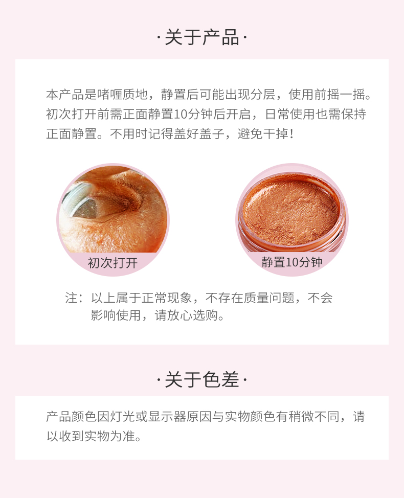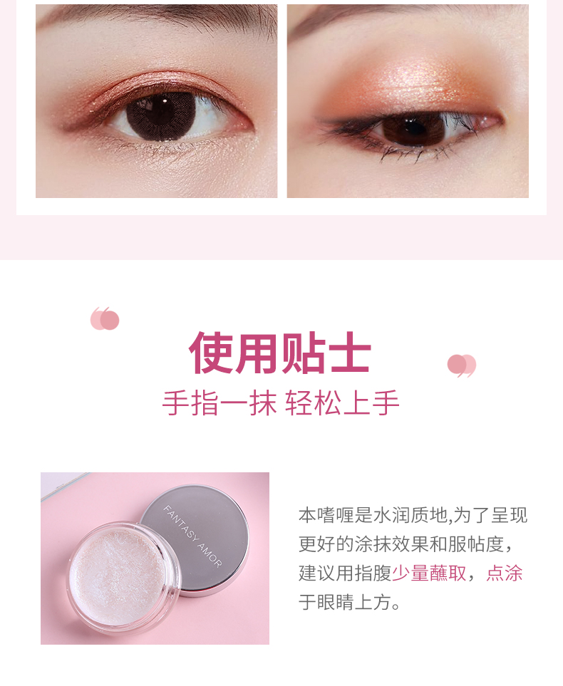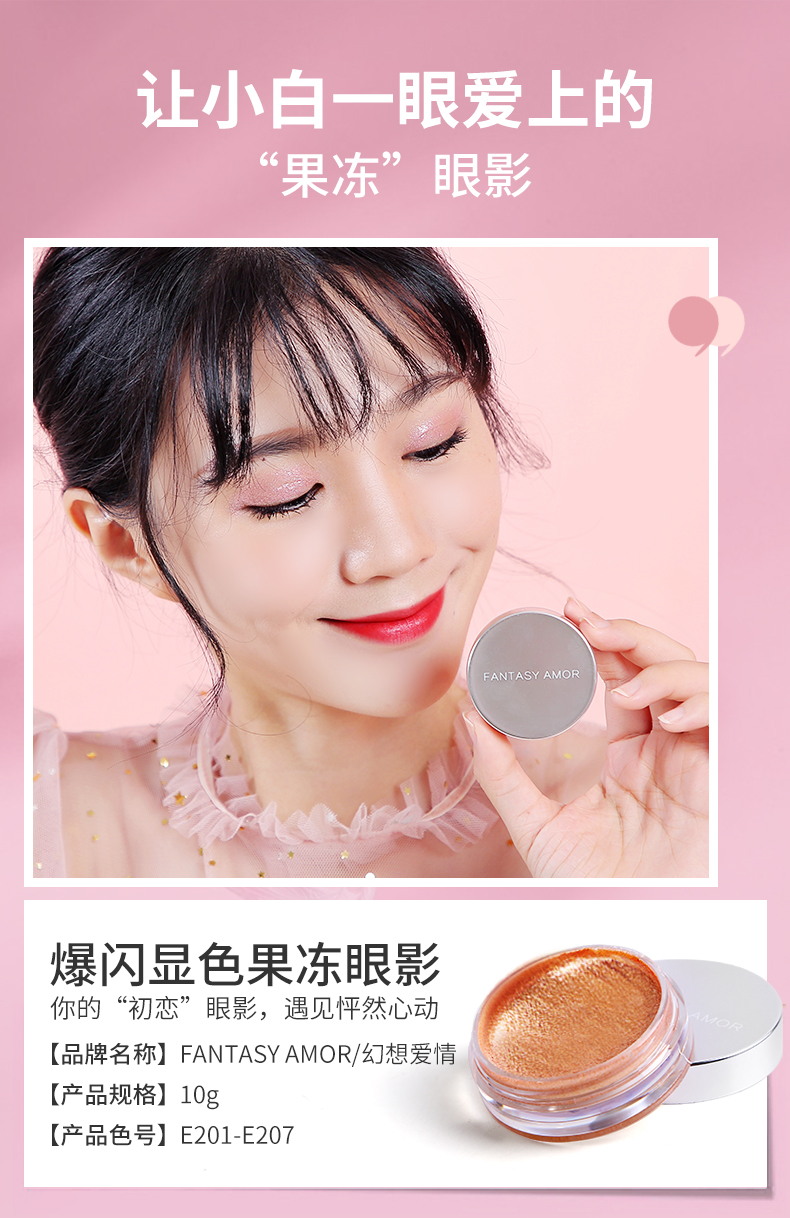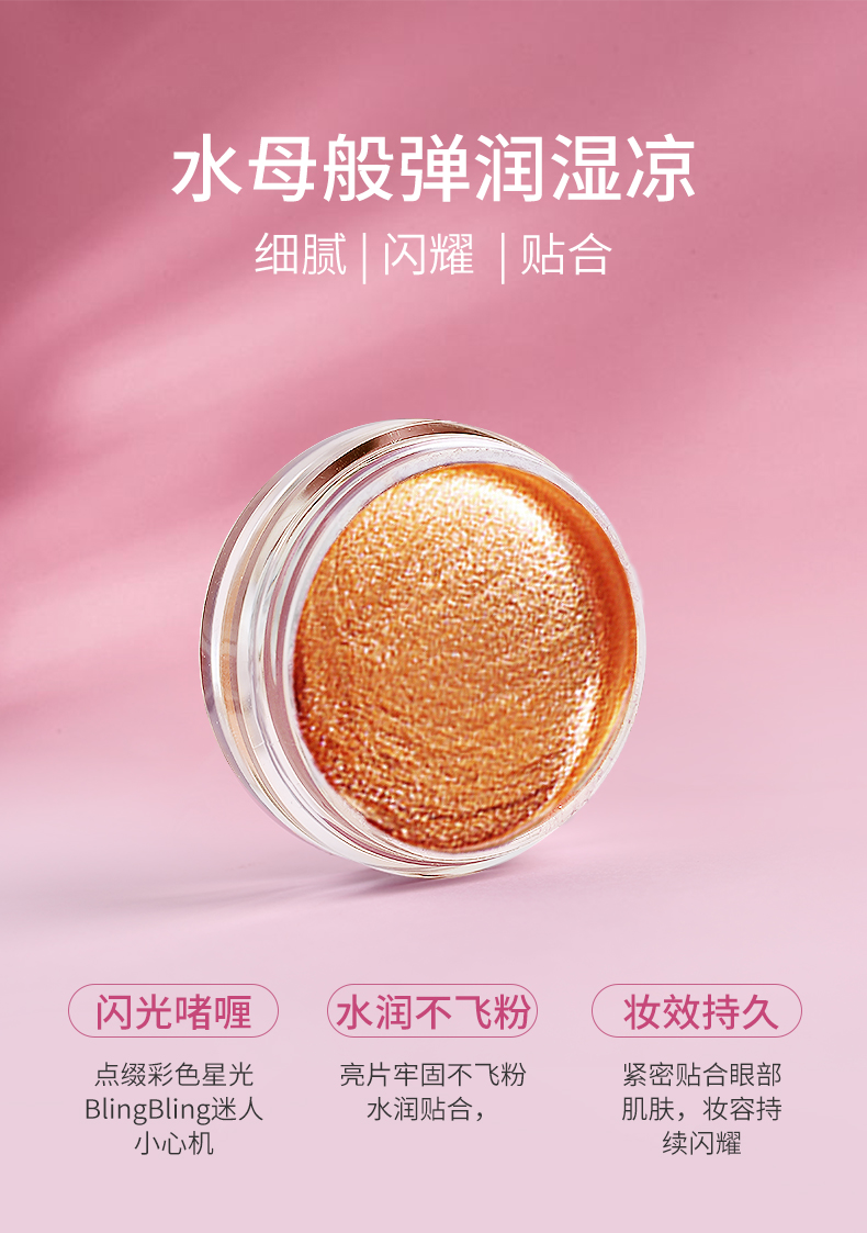 duangduang果冻质地,打破常规粉质眼影,真正做到啫喱感!保湿弹润易推开,12小时超长持久闪亮,化妆新手也能美美上妆~4种超仙配色,无论是上班还是蹦迪,你都是人群中闪亮的小仙女