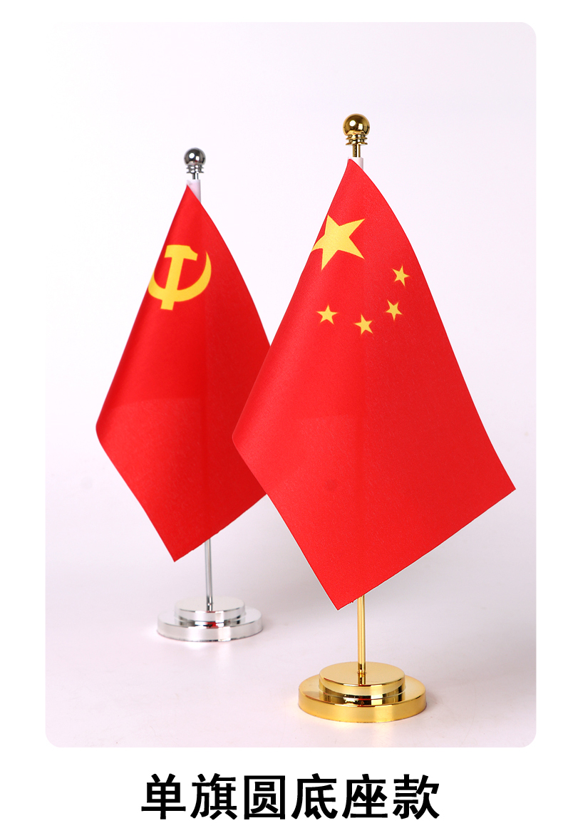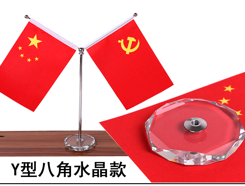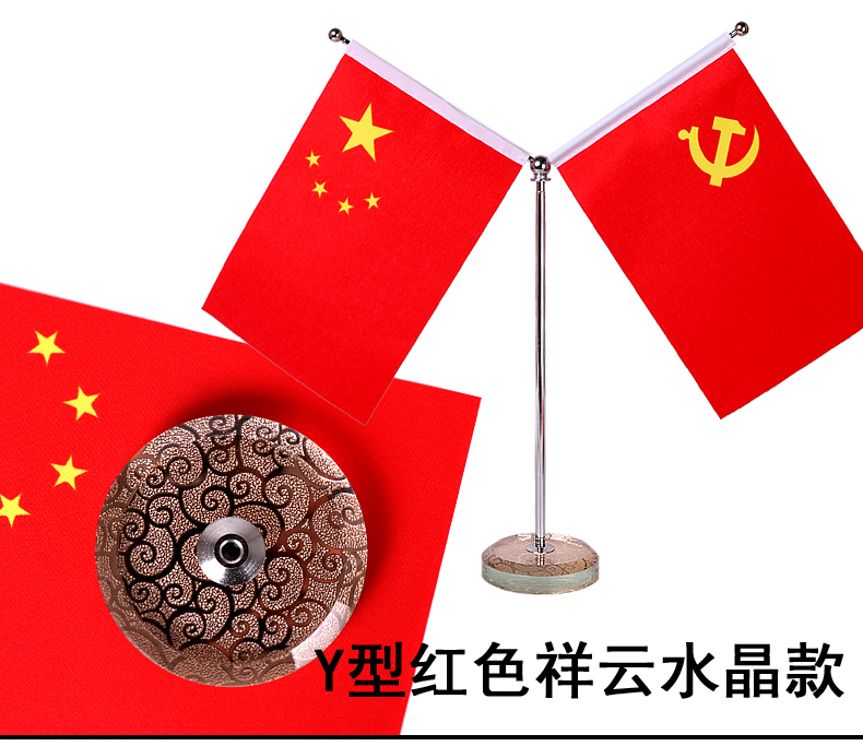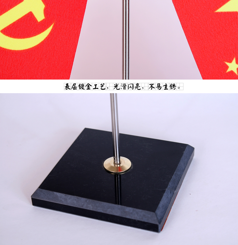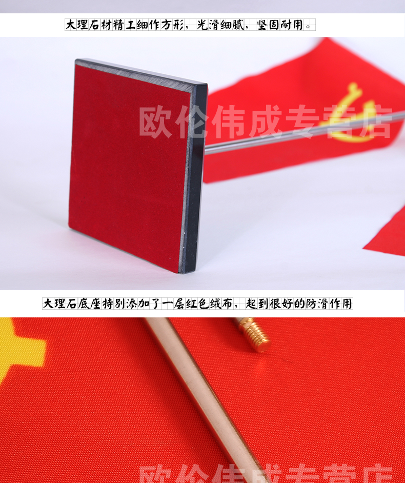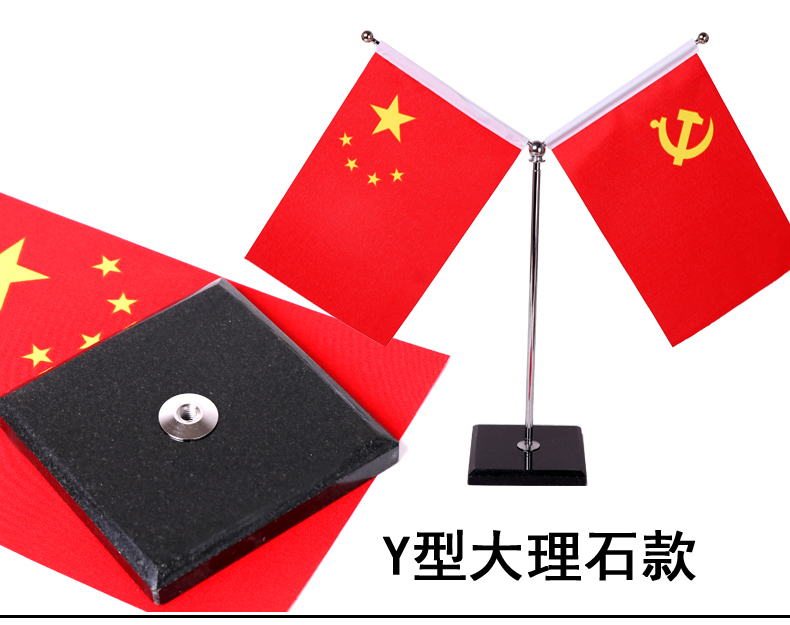 高档大理石Y型国旗,表层镀金工艺,光滑闪亮,不易生锈,坚固耐用,大理石底座特别添加了一层红色绒布,起到很好的防滑作用!默认赠送一面国旗、一面党旗。