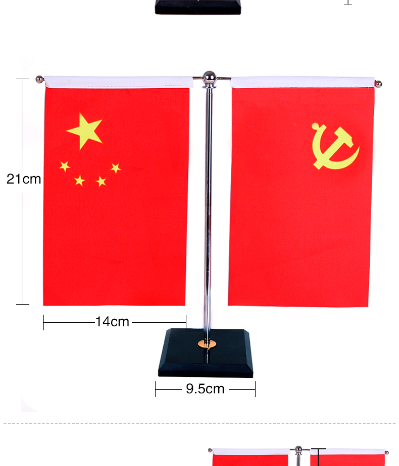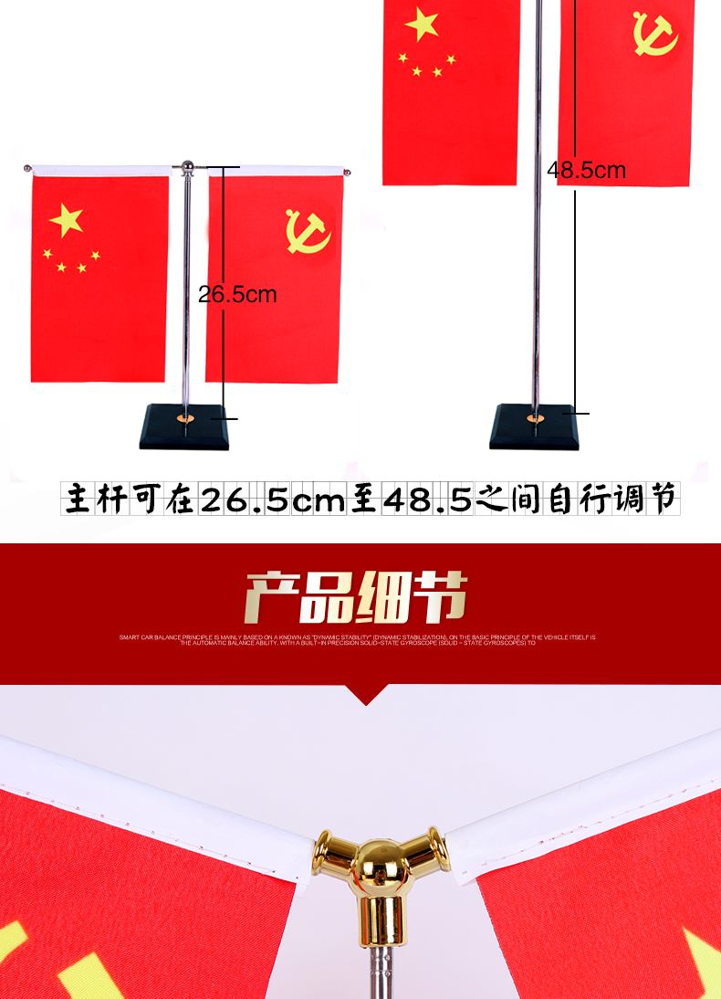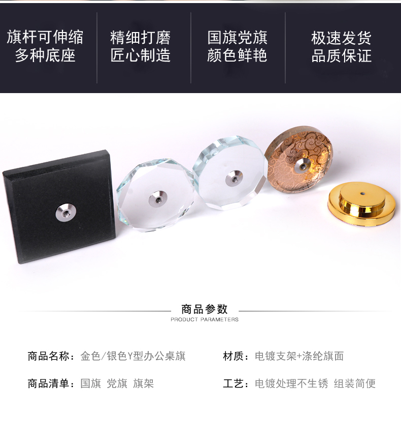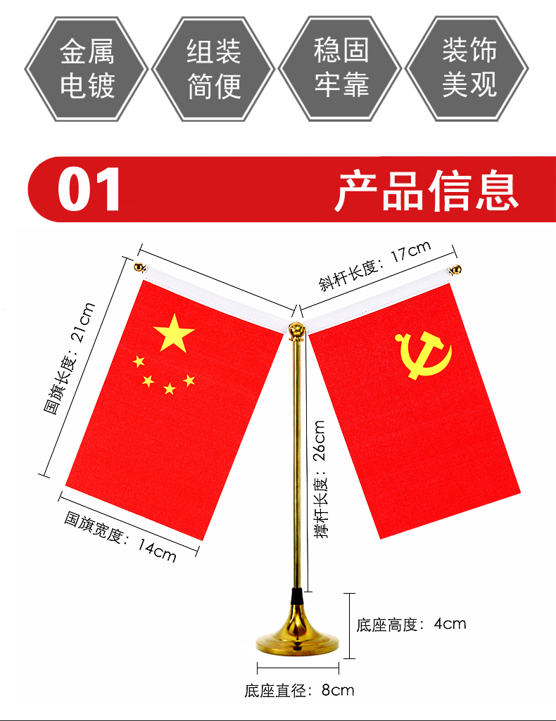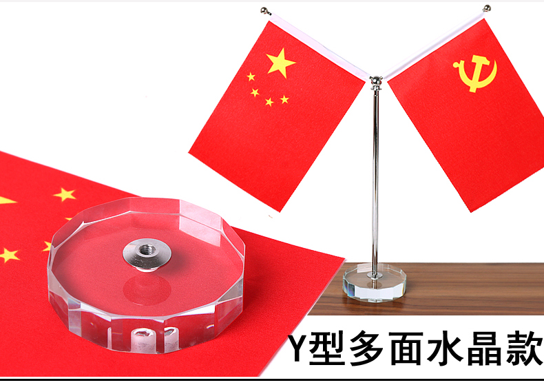 高档大理石Y型国旗,表层镀金工艺,光滑闪亮,不易生锈,坚固耐用,大理石底座特别添加了一层红色绒布,起到很好的防滑作用!默认赠送一面国旗、一面党旗。